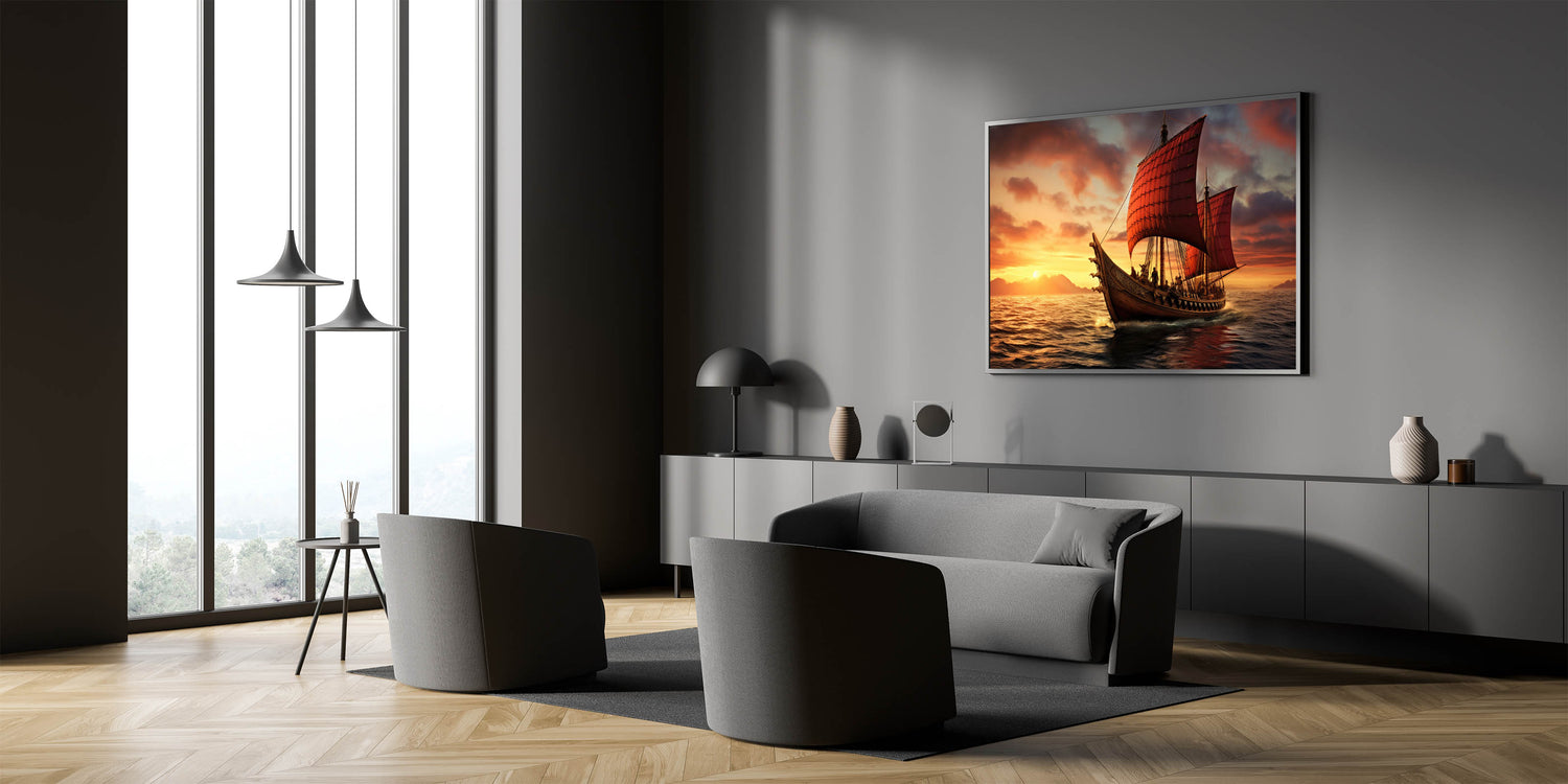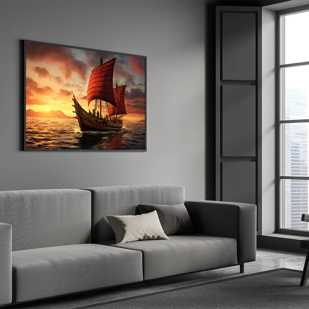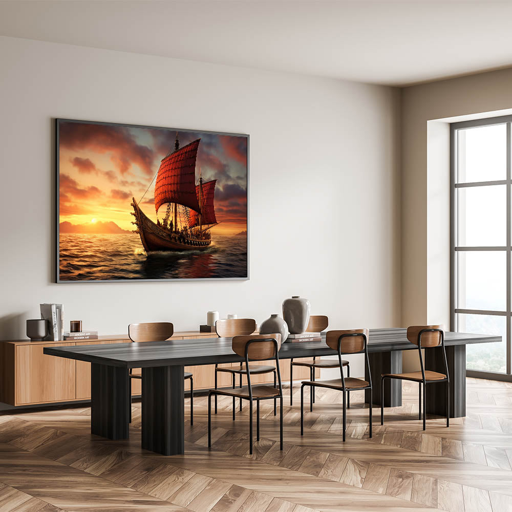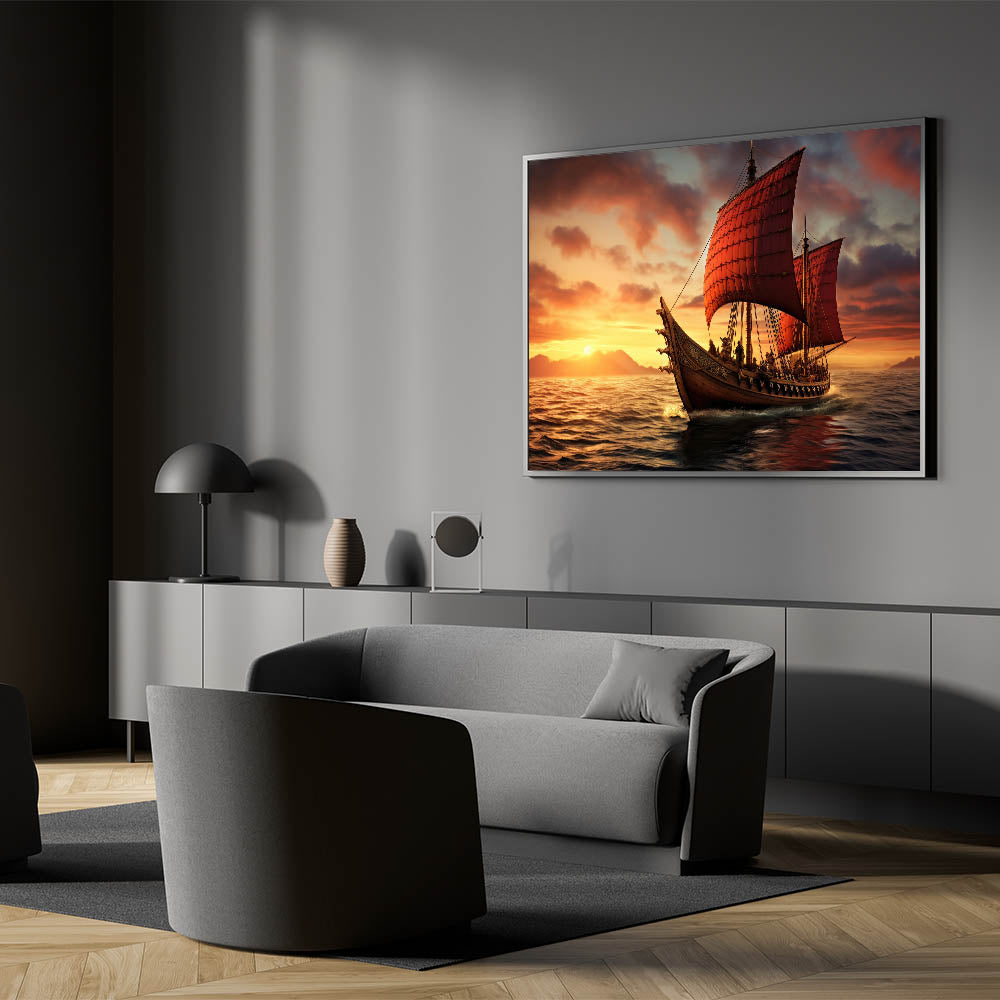 Embrace the spirit of adventure and history with the "Viking Sunset Voyage" wall art. This dramatic piece captures a Viking ship, adorned with striking red sails, sailing across the open ocean under a fiery sunset. The rich, warm tones and dynamic composition make this artwork a perfect statement piece for any room that celebrates boldness and exploration.