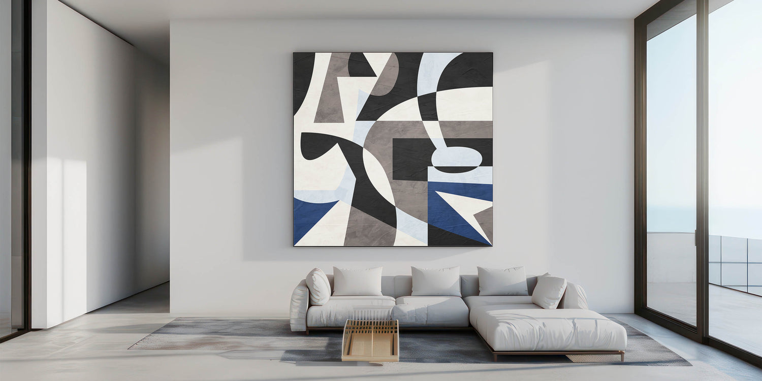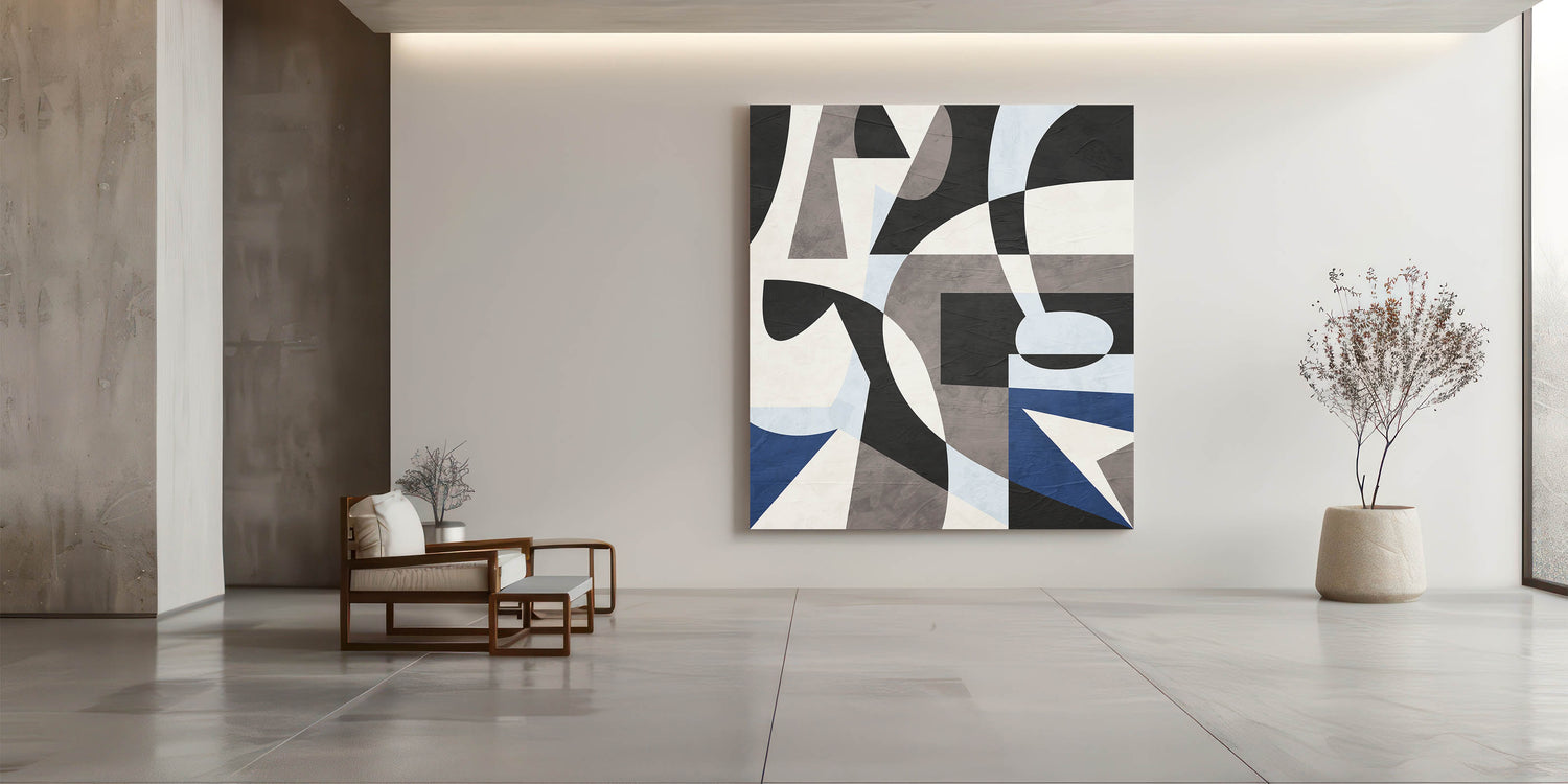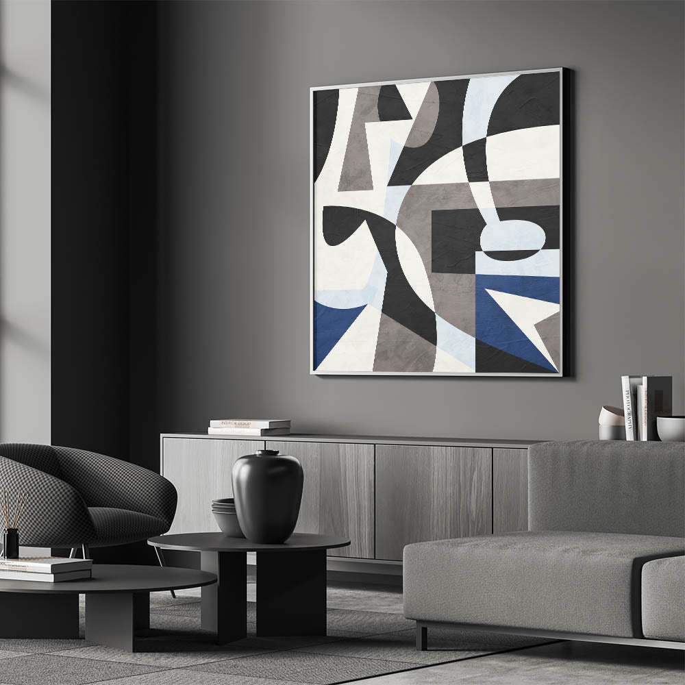 Enhance your interior with this abstract art for sale, a striking fusion of geometric forms and contemporary aesthetics. Featuring a bold composition of black, gray, white, and deep navy blue, this artwork balances dynamic movement with structured design. Its modern abstract art collection appeal makes it a perfect fit for minimalist, geometric, and contemporary spaces.