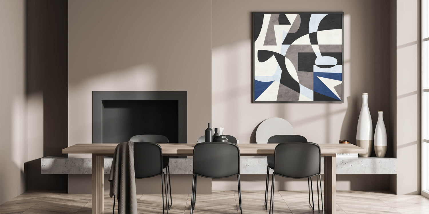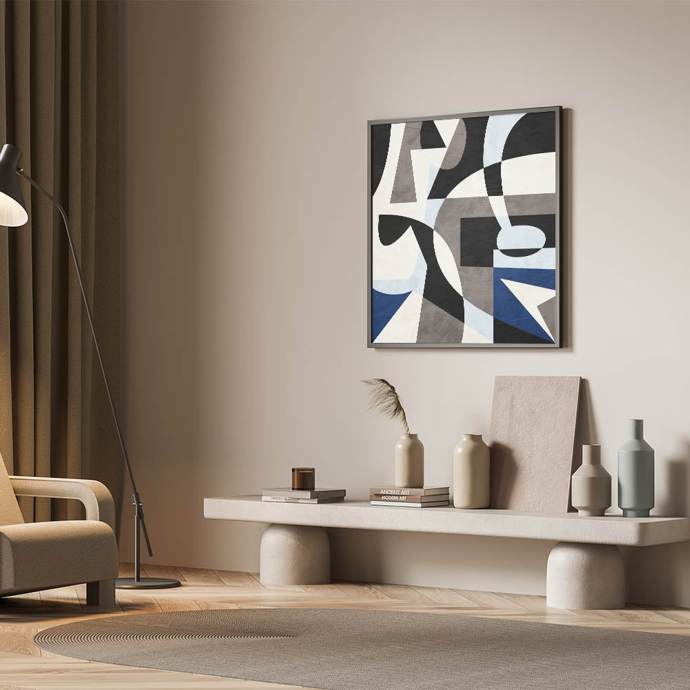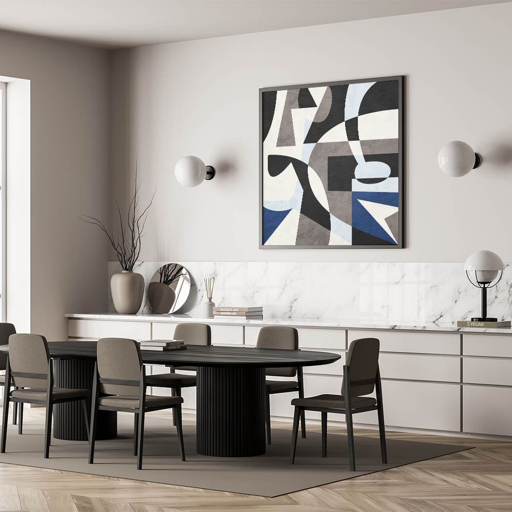 Enhance your interior with this abstract art for sale, a striking fusion of geometric forms and contemporary aesthetics. Featuring a bold composition of black, gray, white, and deep navy blue, this artwork balances dynamic movement with structured design. Its modern abstract art collection appeal makes it a perfect fit for minimalist, geometric, and contemporary spaces.