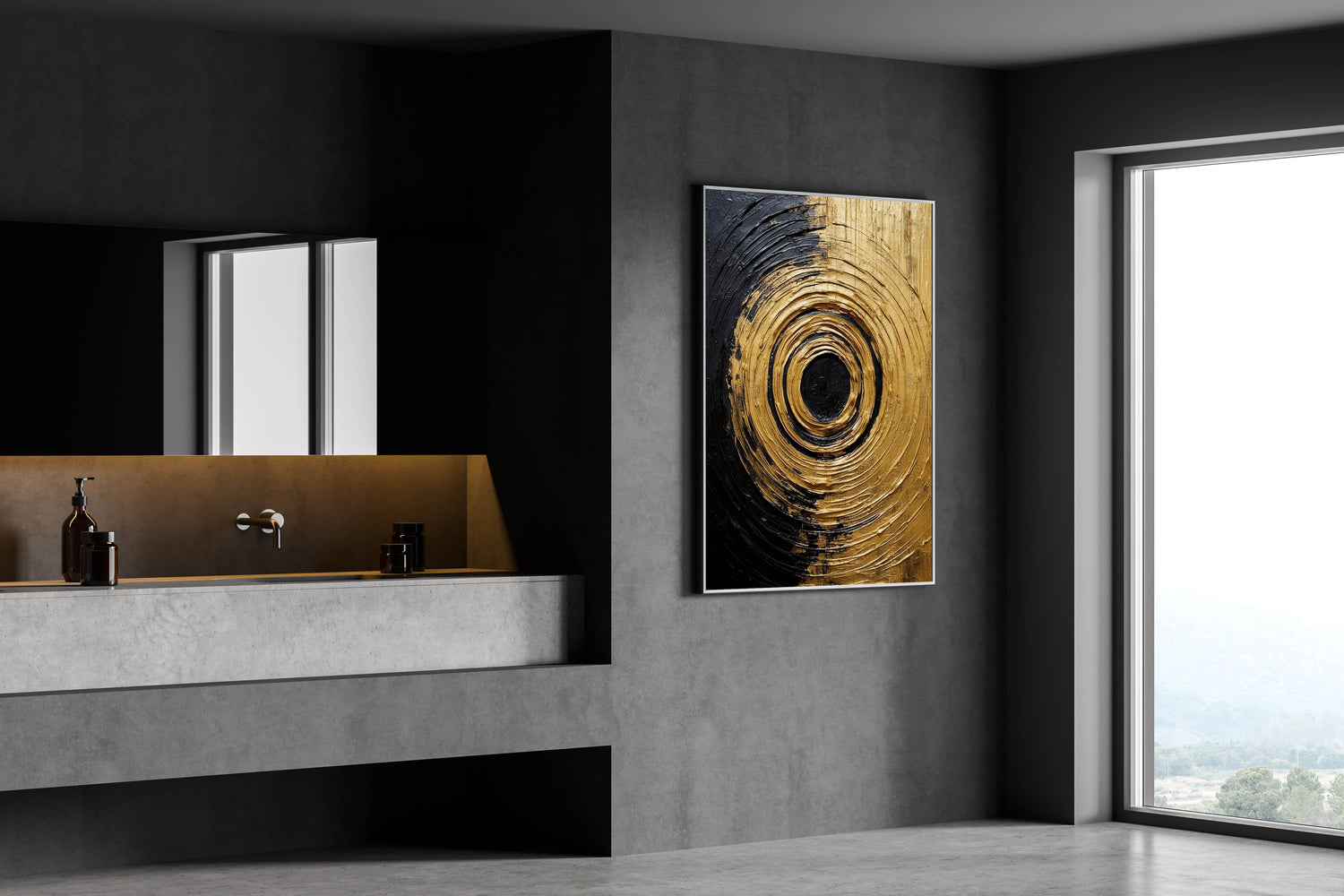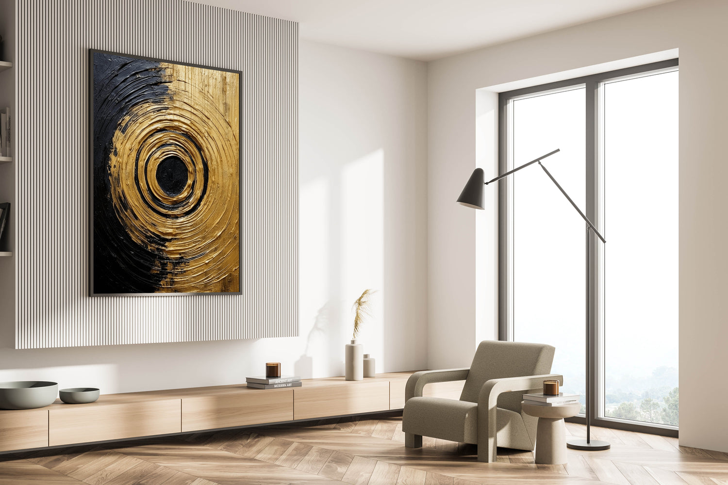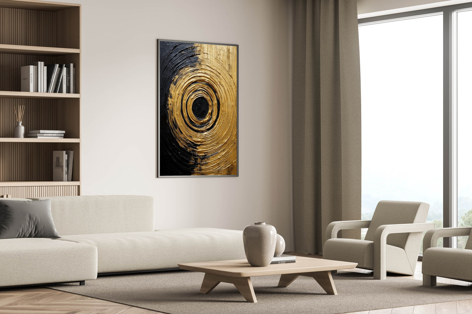 Add a bold statement to your space with this dynamic Abstract Brush Strokes artwork, featuring a striking circular design in deep black and lustrous gold. The textured brush strokes form concentric circles, creating a mesmerizing ripple effect that draws the eye and adds depth to any room. This captivating piece, part of the "Abstract Strokes & Lines Abstracts" collection, is perfect for those who appreciate contemporary design with a touch of luxury.