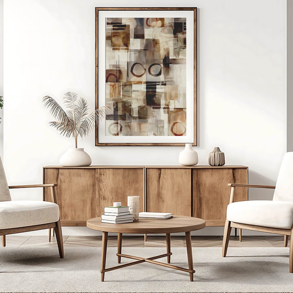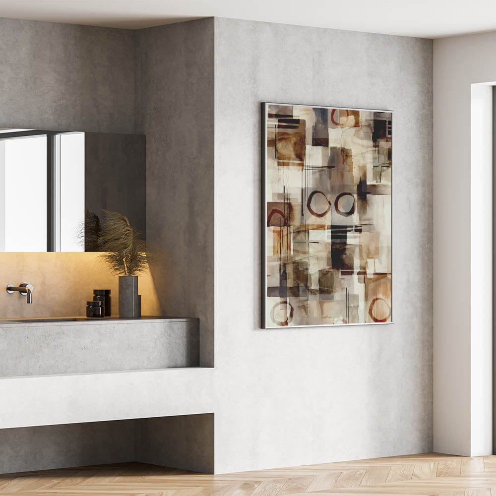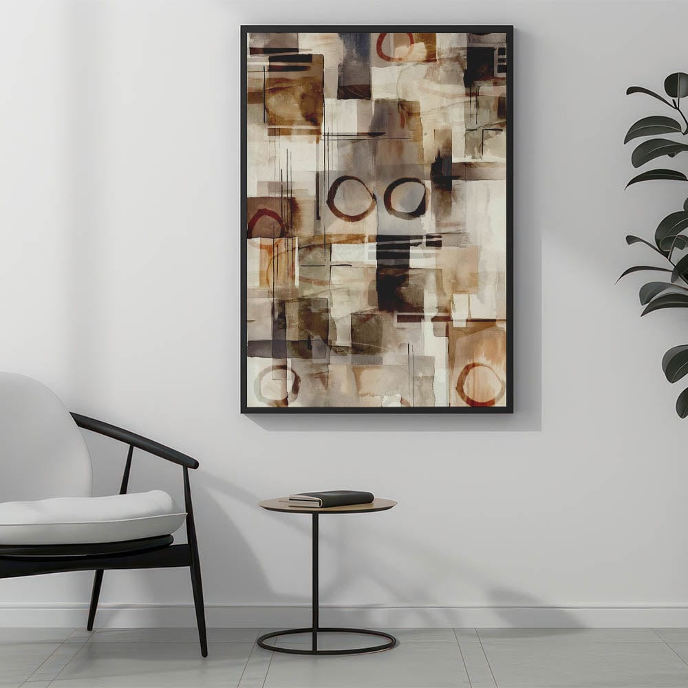 This contemporary abstract art blends structured geometry with soft, organic forms, offering a timeless and balanced aesthetic. Whether printed on stretched canvas, framed print, or acrylic glass, this versatile piece enhances any space with its warm, earthy tones. Elevate your décor with this elegant artwork today.