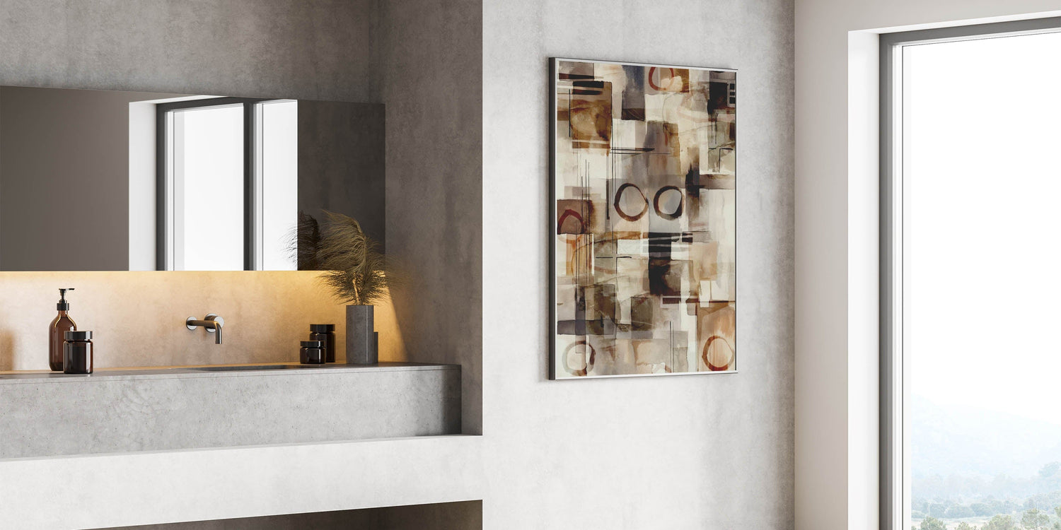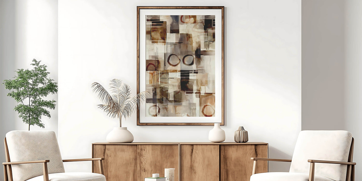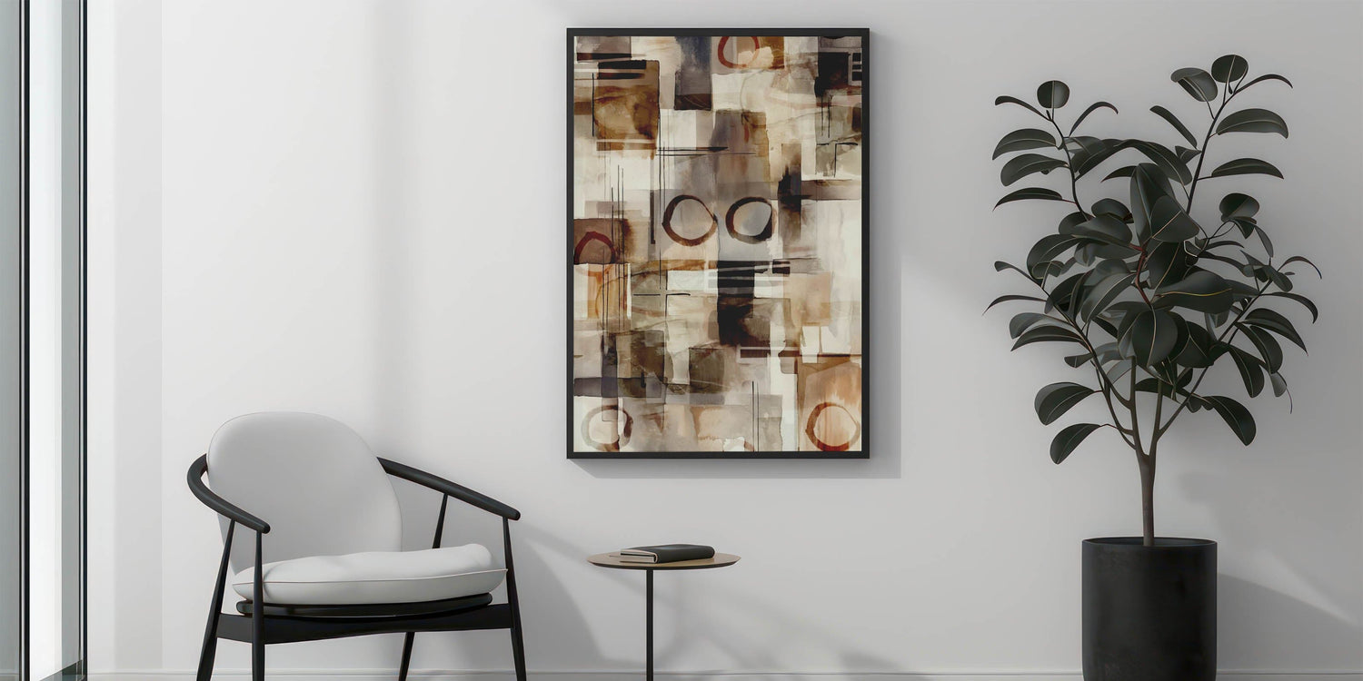 This contemporary abstract art blends structured geometry with soft, organic forms, offering a timeless and balanced aesthetic. Whether printed on stretched canvas, framed print, or acrylic glass, this versatile piece enhances any space with its warm, earthy tones. Elevate your décor with this elegant artwork today.