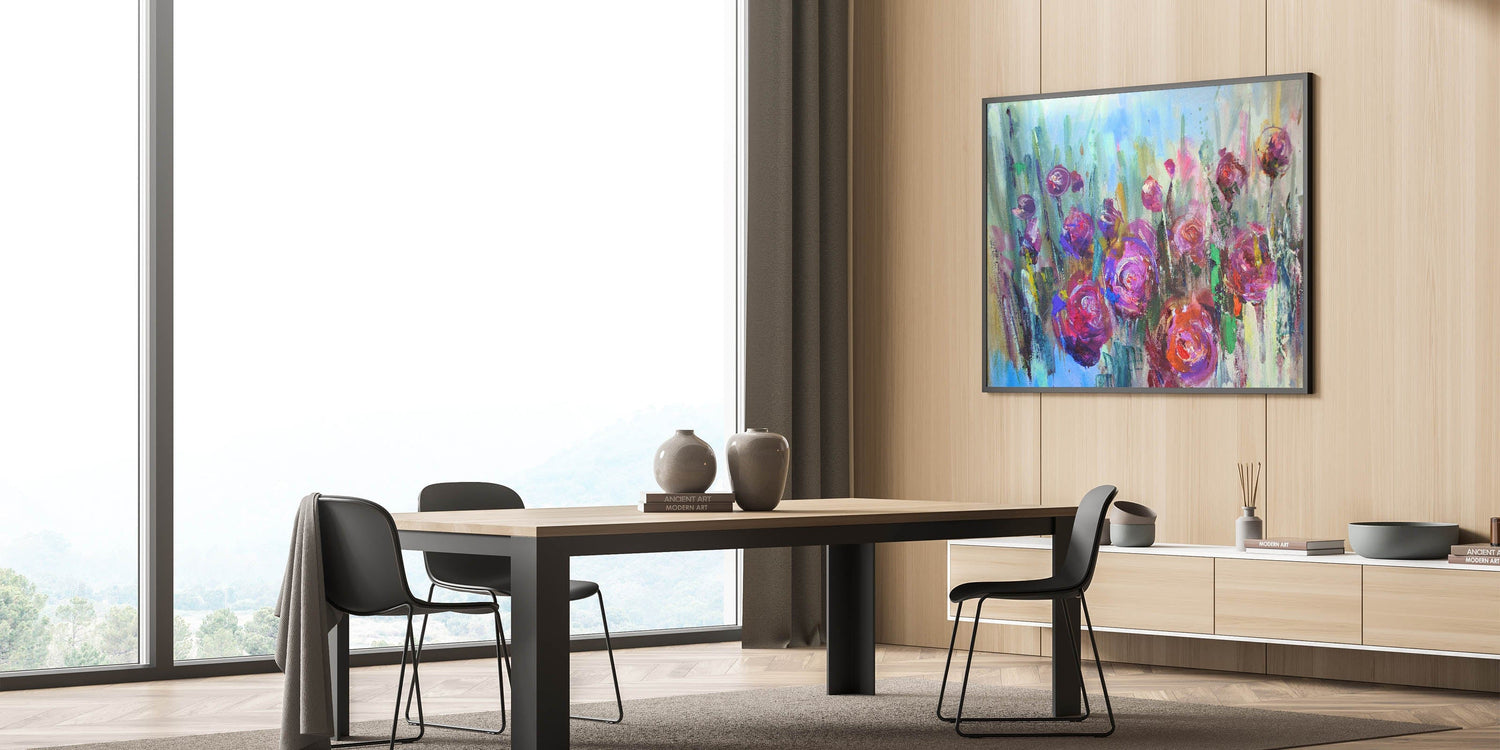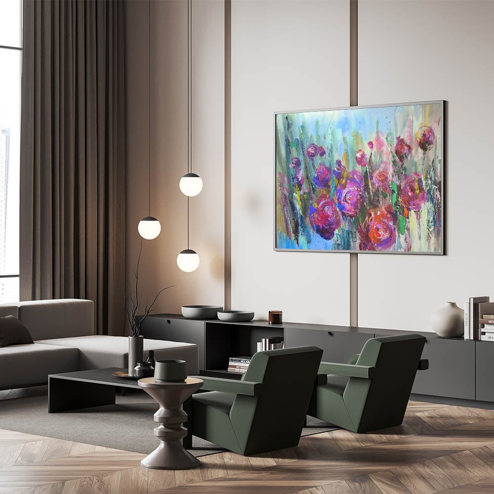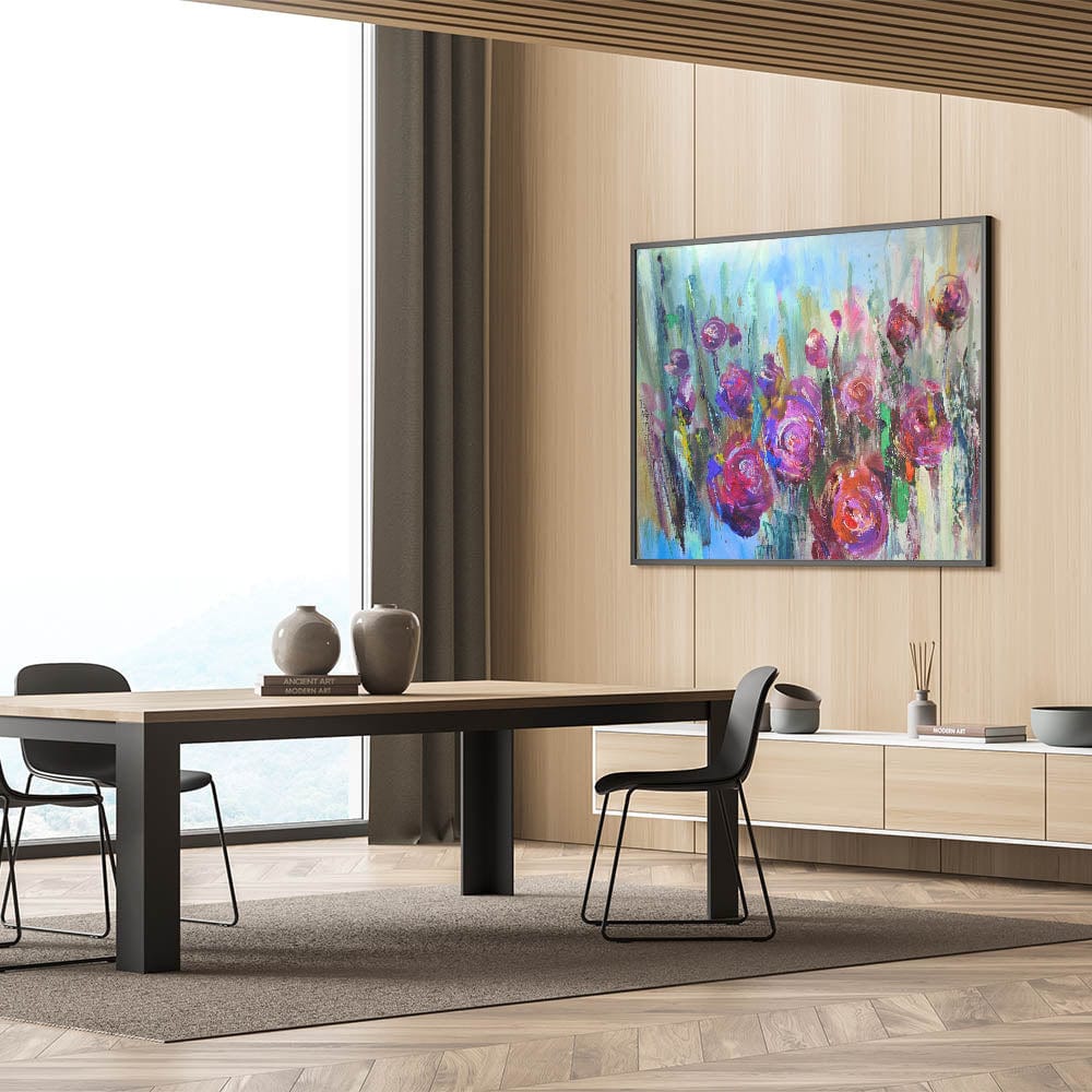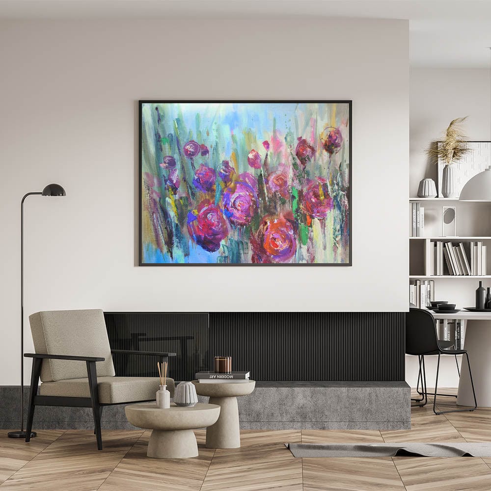 Bring the beauty of nature into your home with this abstract canvas wall art, featuring an expressive mix of pink, purple, red, green, and blue hues. The bold brushstrokes and rich textures capture the movement of blooming flowers, creating a stunning visual impact. This modern abstract painting adds warmth and sophistication to any space.