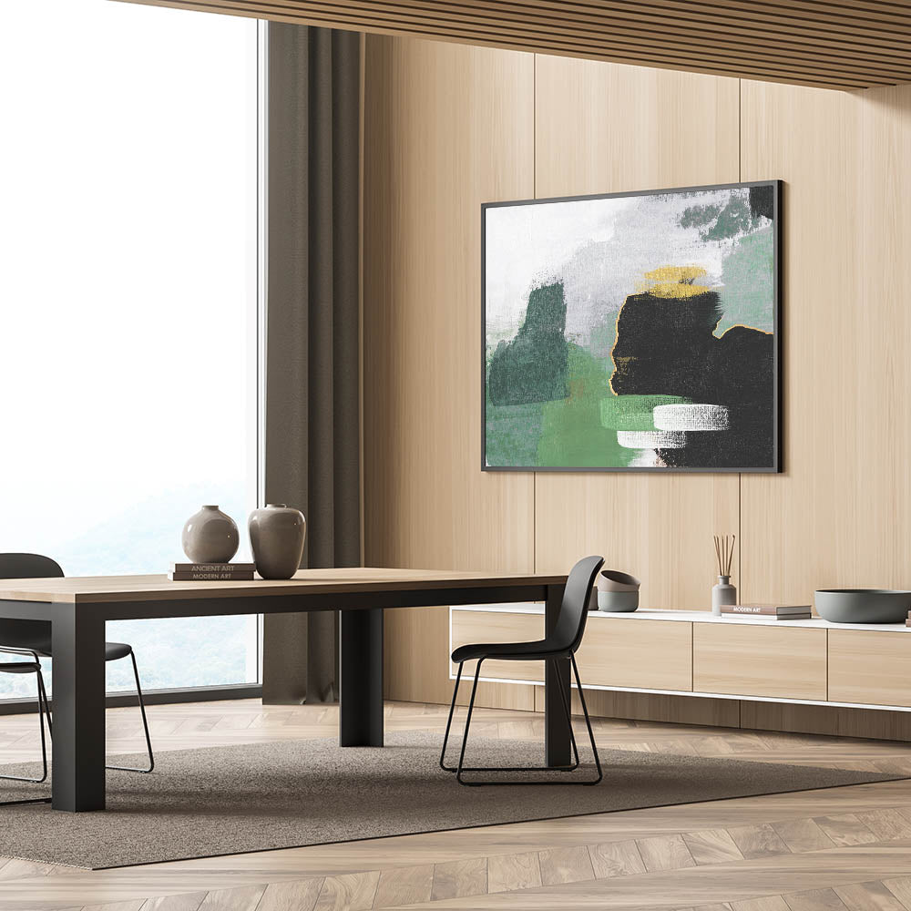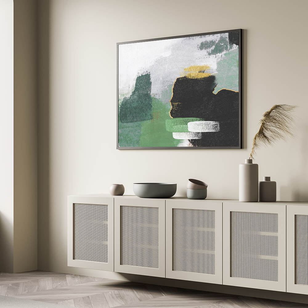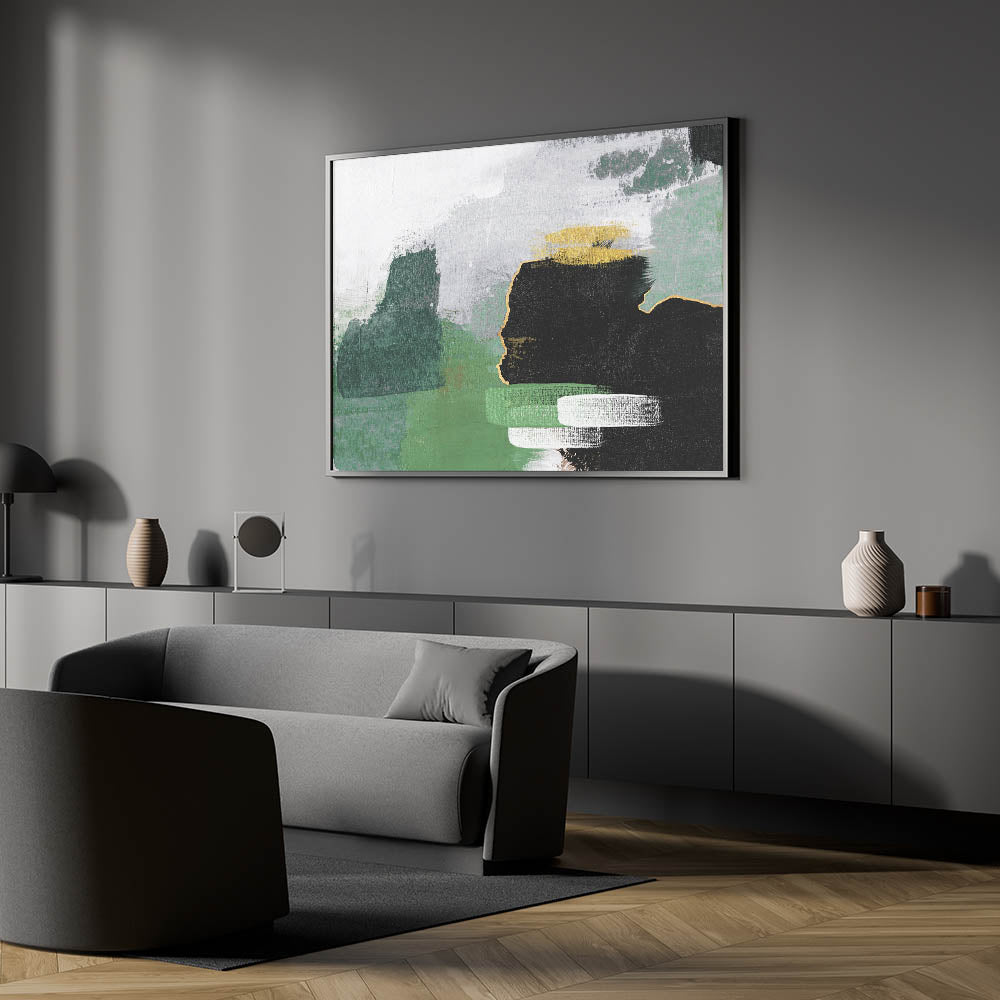 Introduce a touch of modern elegance to your space with this striking abstract art piece. Featuring bold brush strokes in deep green, black, and hints of gold, this artwork blends contemporary style with a natural color palette. The dynamic composition creates a sense of movement and depth, making it an eye-catching addition to any room.
