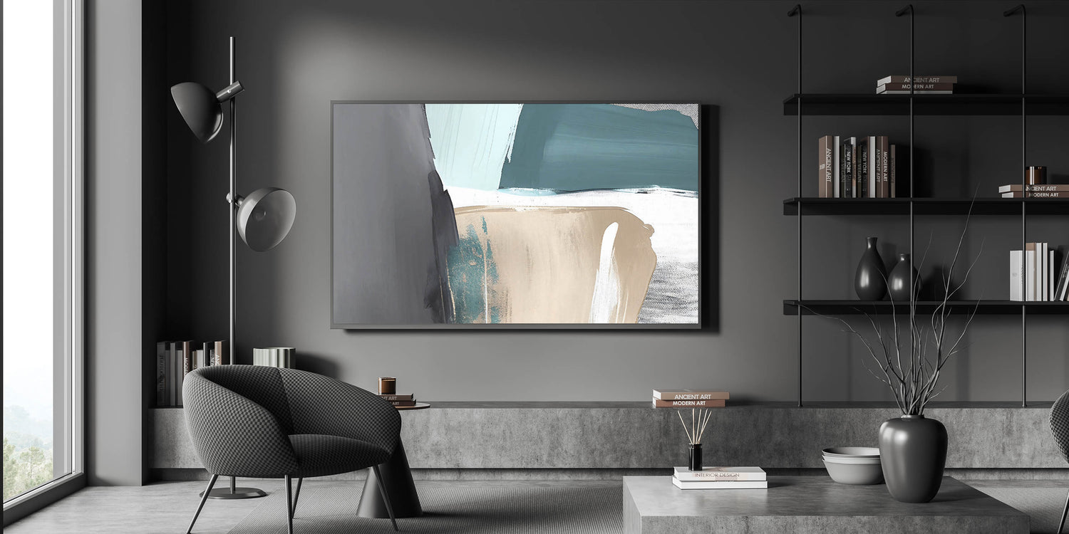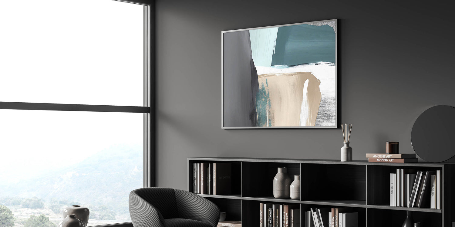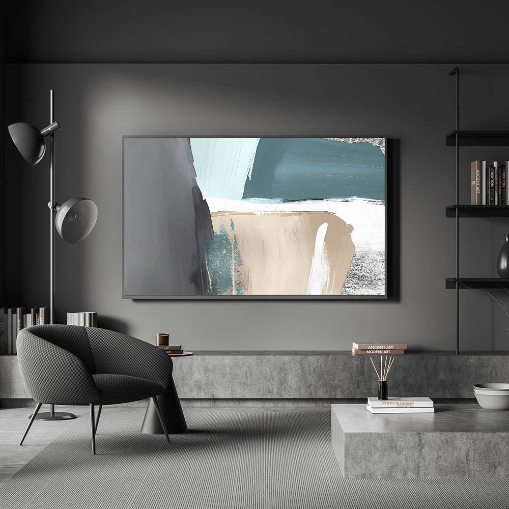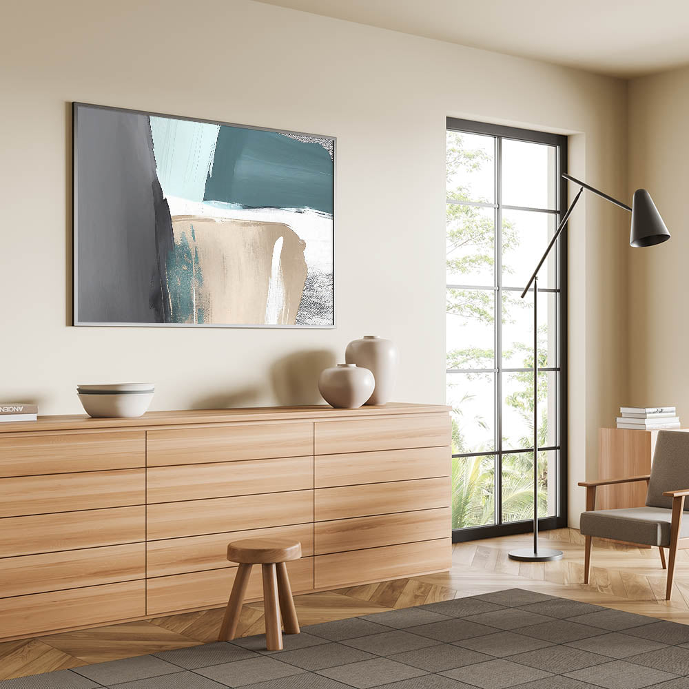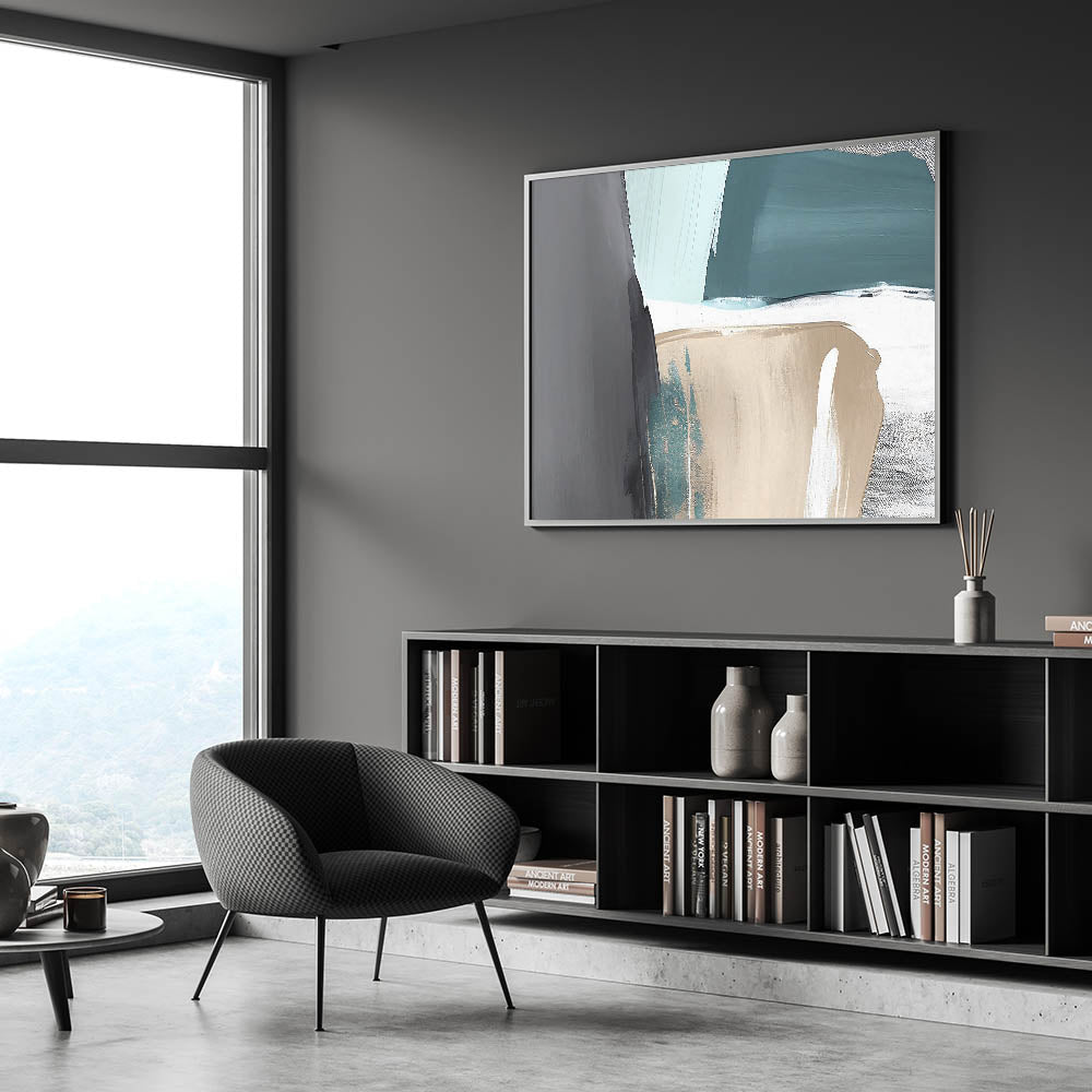 Elevate your space with this stunning Abstract Strokes and Lines Art. Featuring a harmonious blend of teal, beige, and gray tones, this artwork exudes a sense of calm and modern sophistication. The combination of bold strokes and subtle color transitions creates a captivating piece that is perfect for contemporary or minimalist interiors.