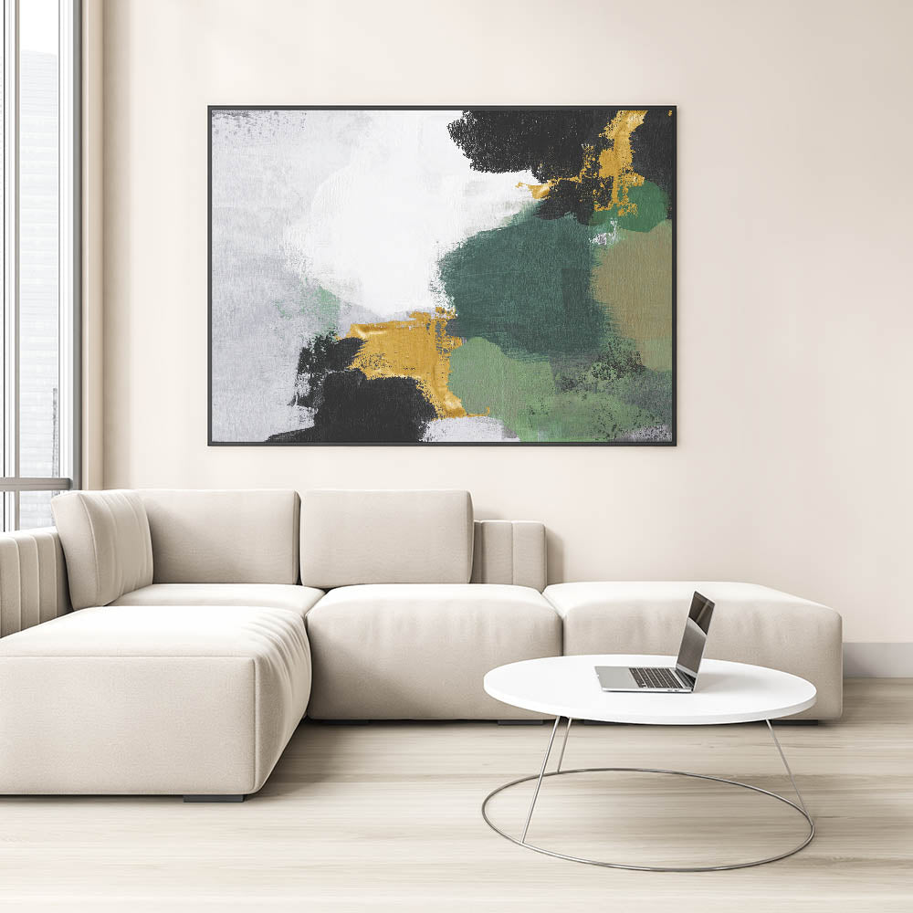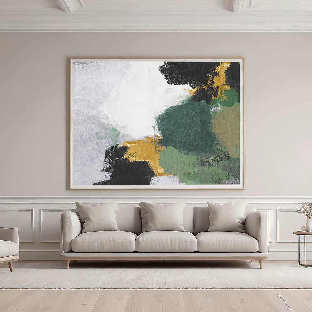 Make a bold statement in your space with this striking abstract strokes and lines artwork. Featuring a dynamic combination of deep green, black, and gold tones, this piece offers a powerful visual impact. The bold brush strokes and rich textures create a sense of depth and movement, perfect for adding an element of sophistication and modernity to your interior.