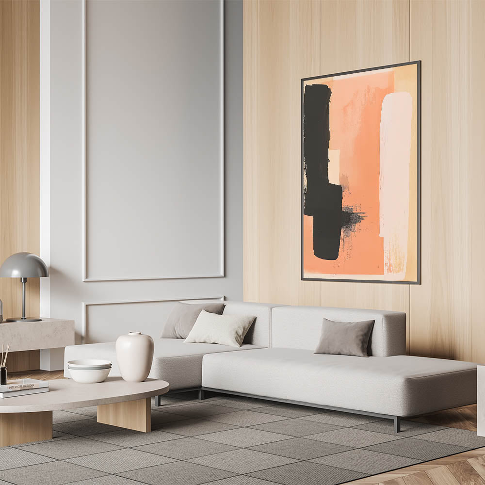 Add a pop of color to your space with this Bold Minimalist Abstract Art. Featuring striking blocks of black, peach, and soft cream, this artwork creates a dynamic contrast that brings modern elegance to any room. Its bold composition and warm tones make it ideal for contemporary and minimalist interiors, adding a stylish and energetic touch.