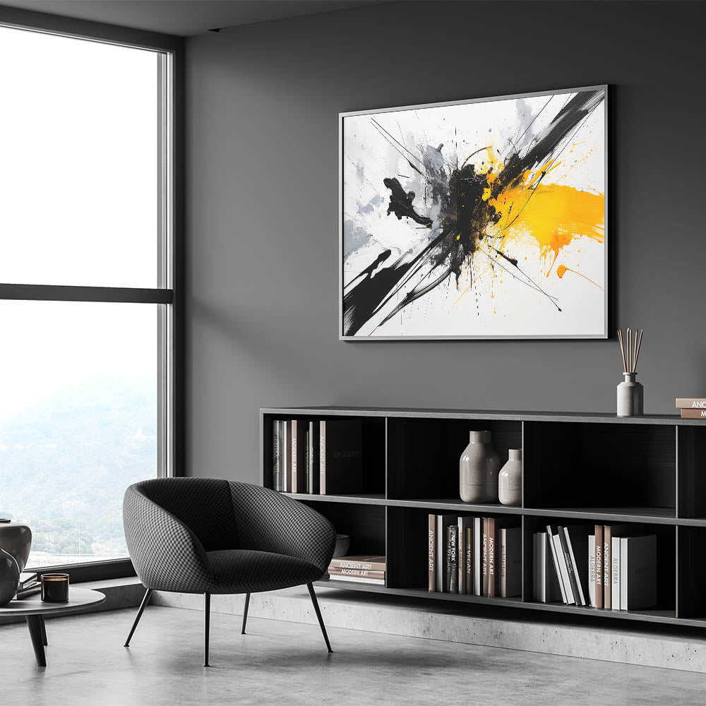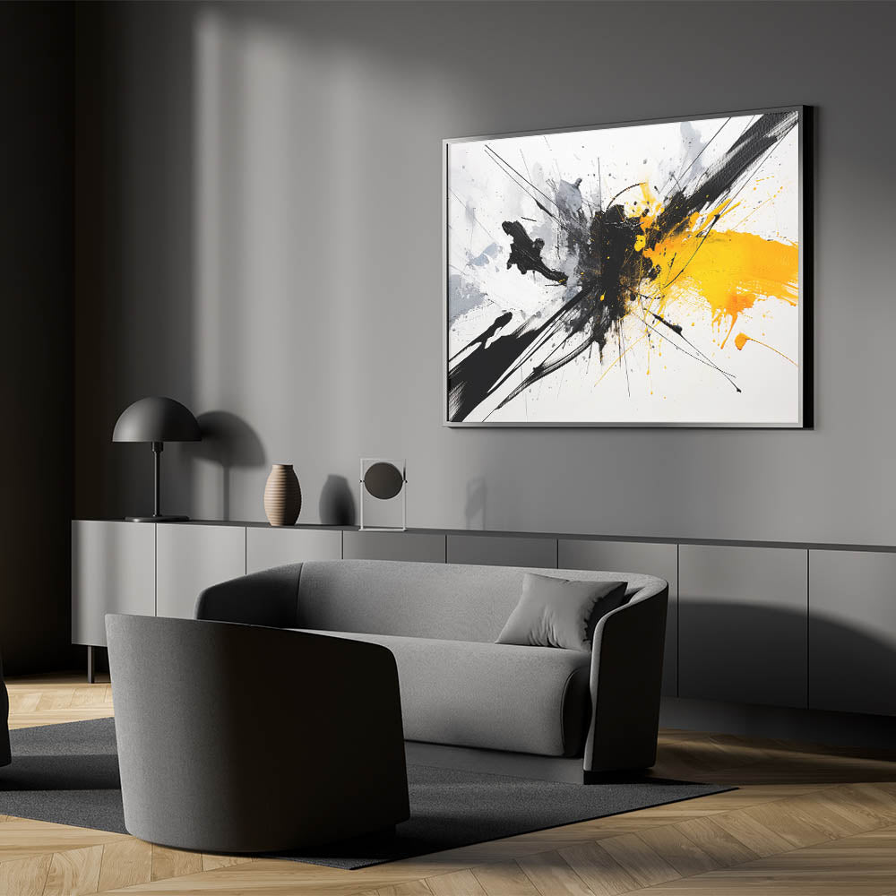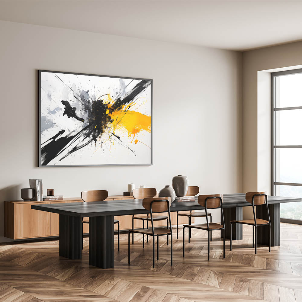 Add a vibrant touch to your space with this dynamic black and white abstract art piece. Featuring bold splashes of black and white with a striking burst of yellow, this design brings energy and creativity to any room.