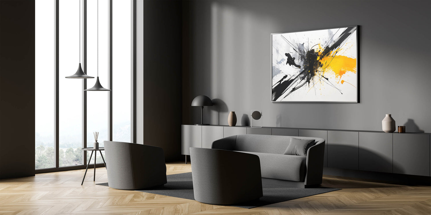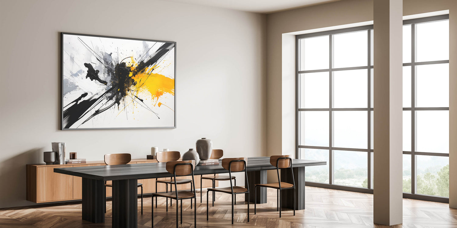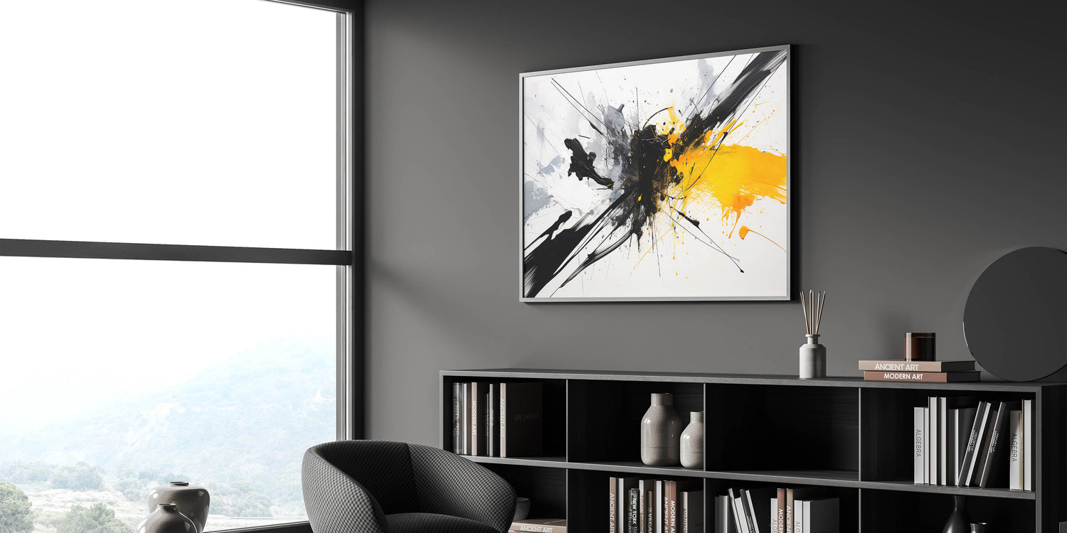 Add a vibrant touch to your space with this dynamic black and white abstract art piece. Featuring bold splashes of black and white with a striking burst of yellow, this design brings energy and creativity to any room.