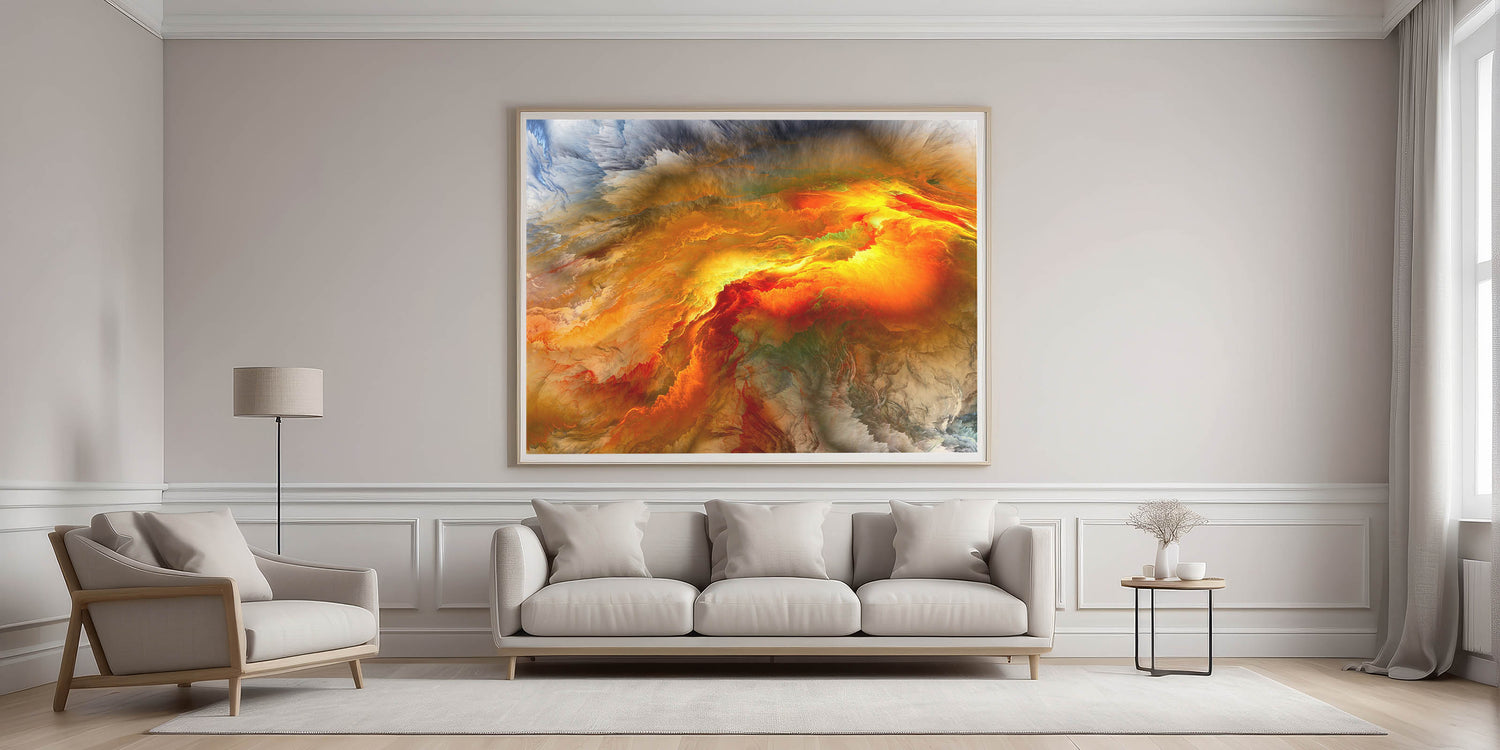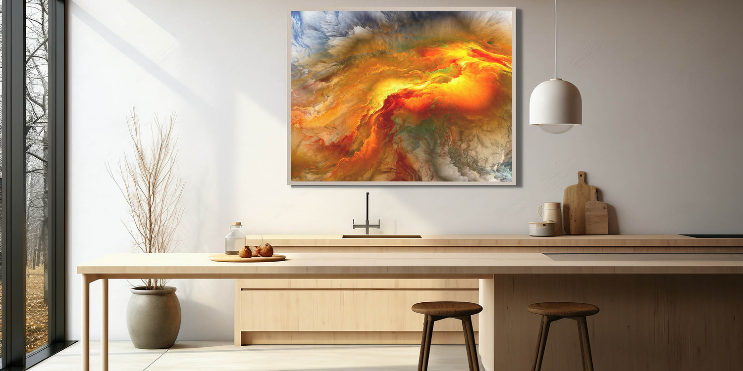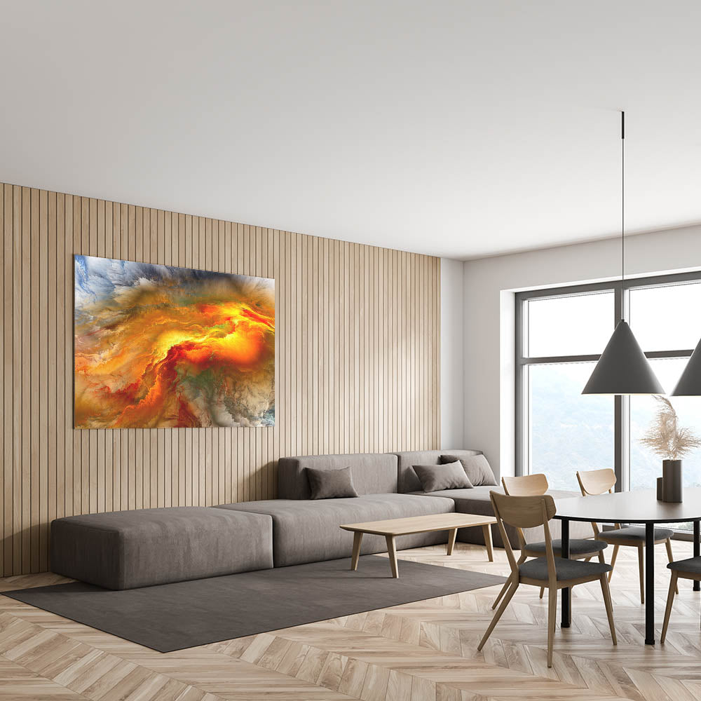 - Vibrant Design: Showcases a powerful blend of fiery reds, oranges, and yellows, interwoven with subtle hints of green and blue, bringing an intense and lively atmosphere to any room.