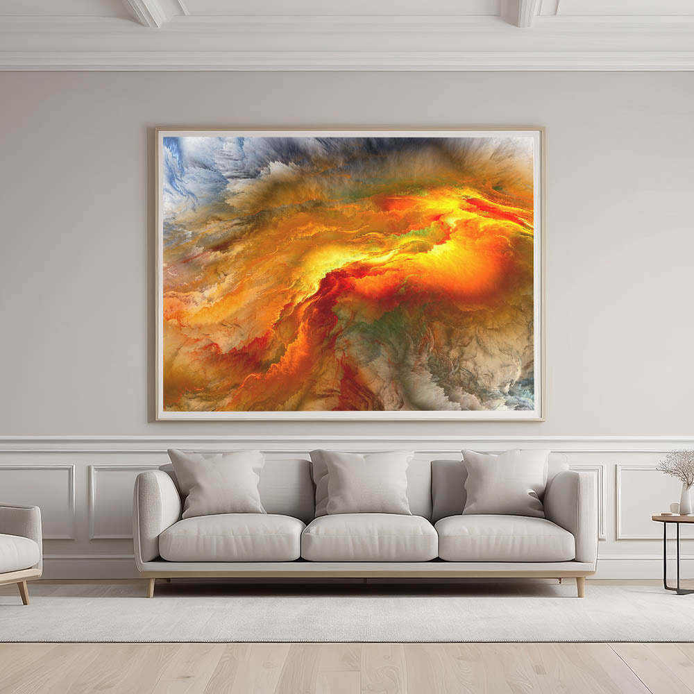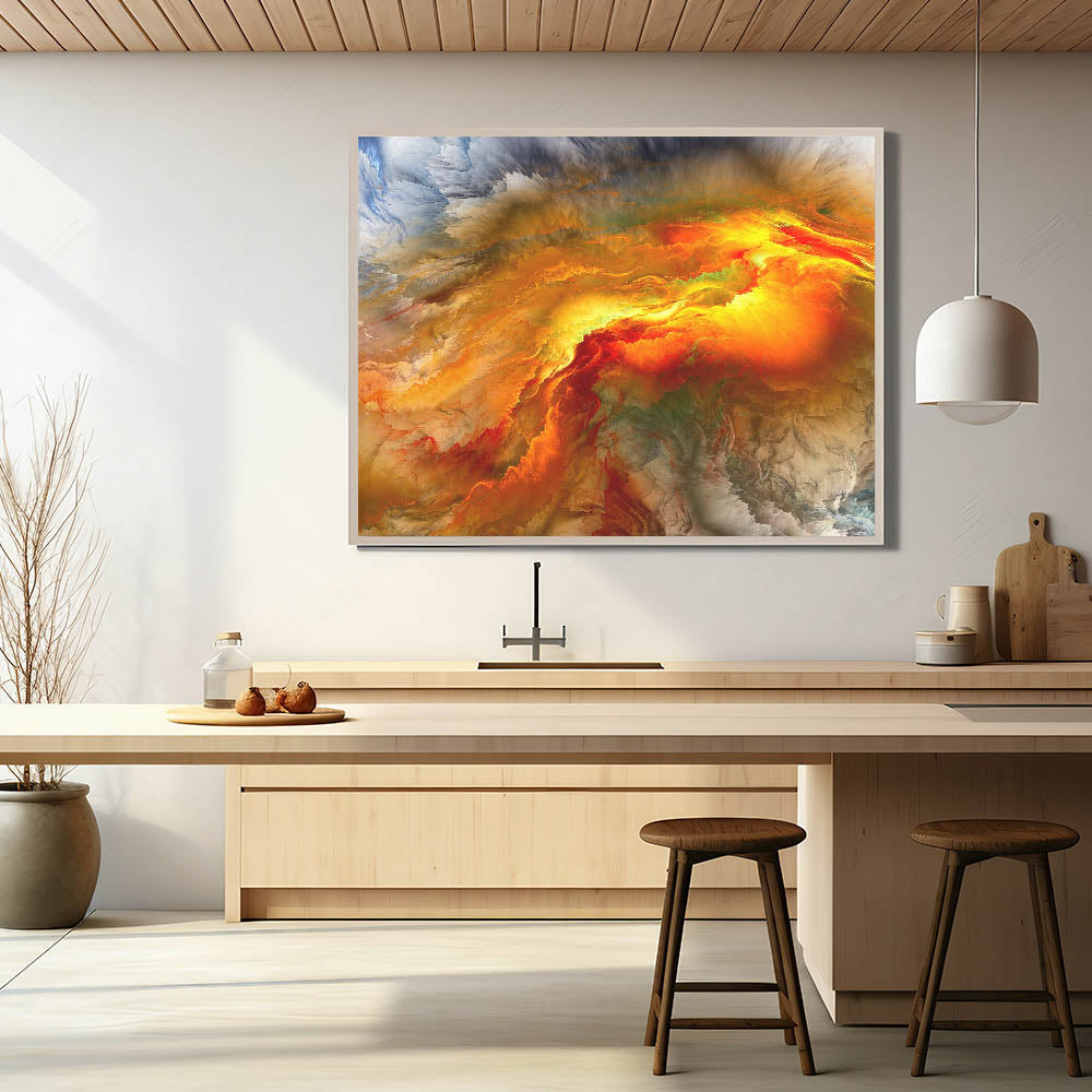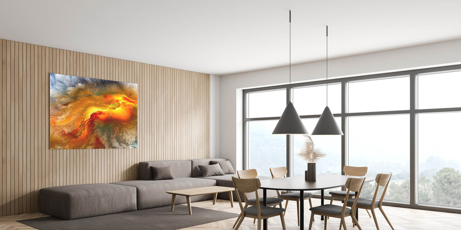 - Vibrant Design: Showcases a powerful blend of fiery reds, oranges, and yellows, interwoven with subtle hints of green and blue, bringing an intense and lively atmosphere to any room.