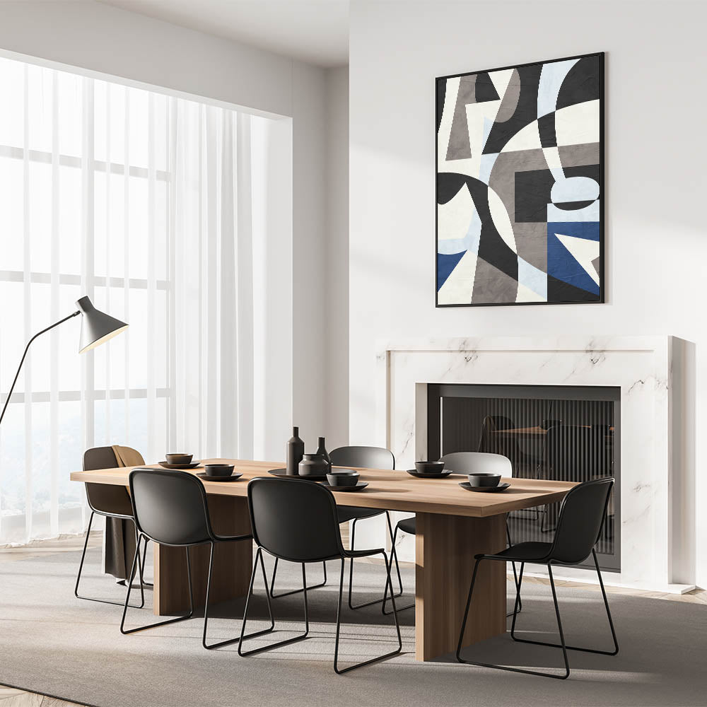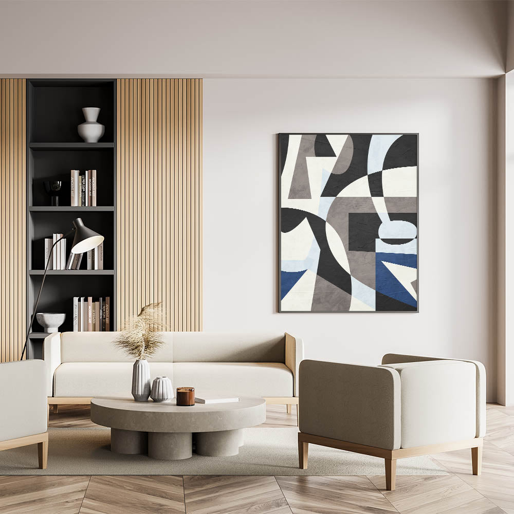 Enhance your decor with this geometric abstract painting, featuring a bold interplay of black, gray, white, and deep navy blue. The combination of curved and angular forms creates a sense of movement and depth, making this contemporary canvas print a dynamic centerpiece for any modern space. This minimalist abstract painting is ideal for art lovers seeking a balance of structure and fluidity in their interiors.
