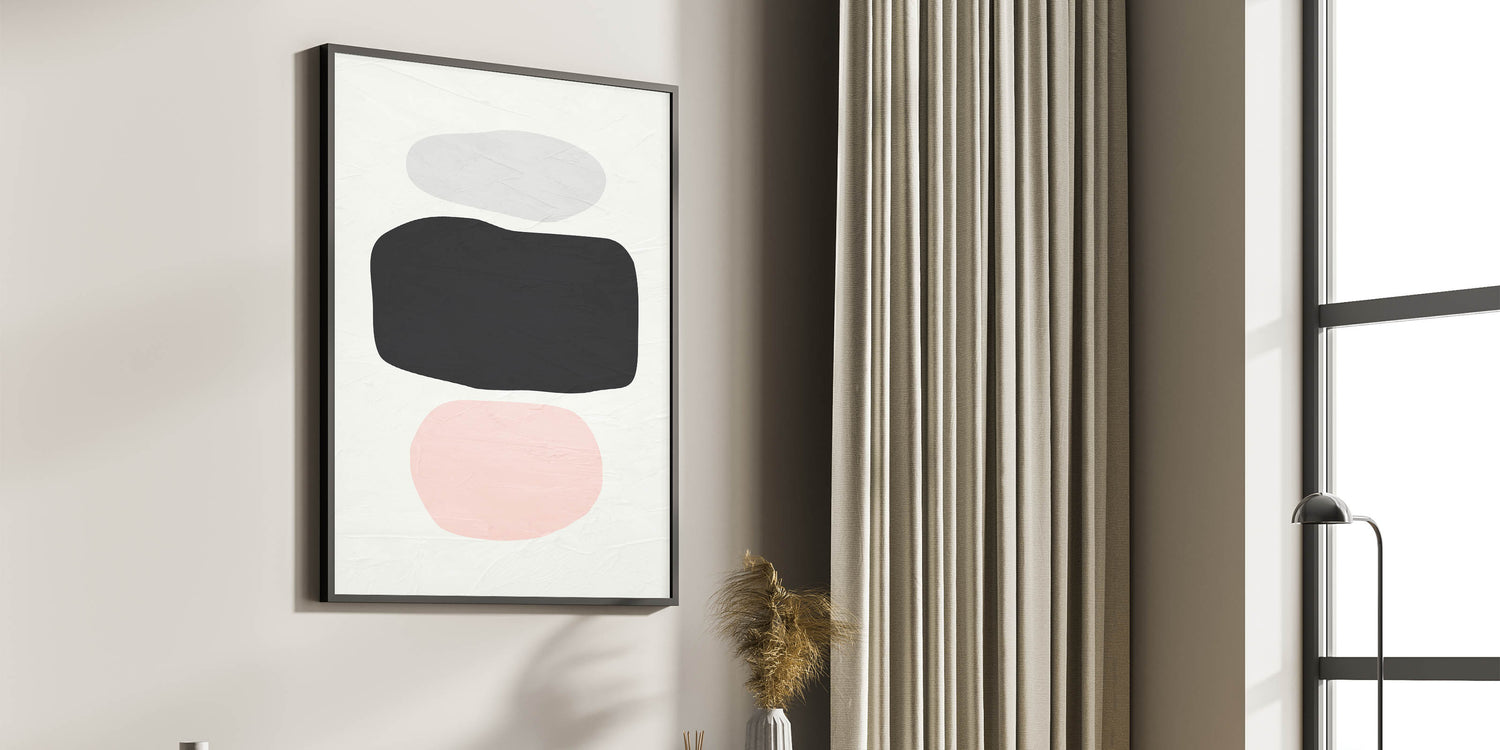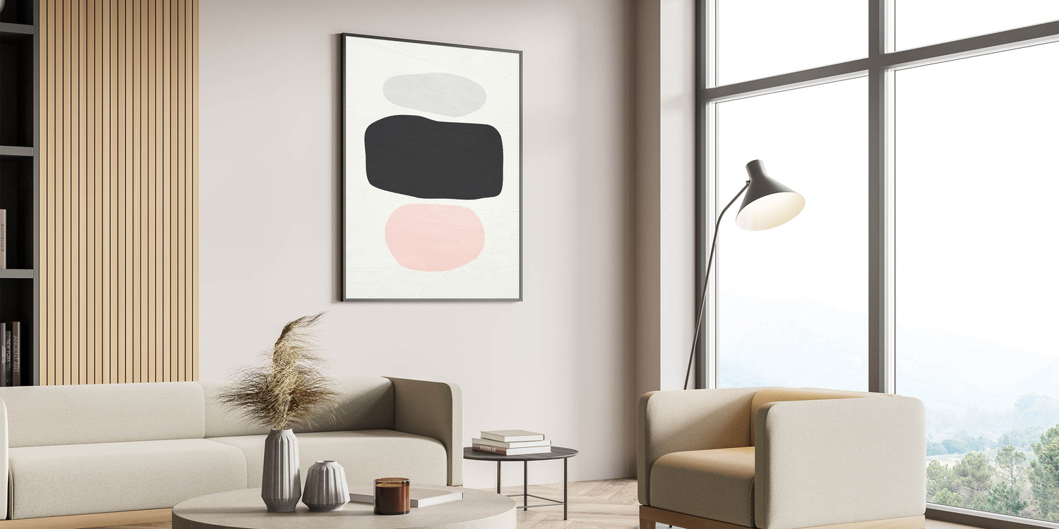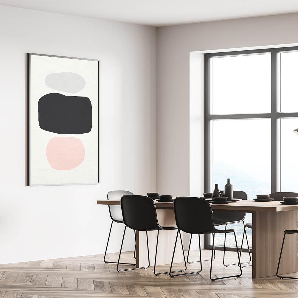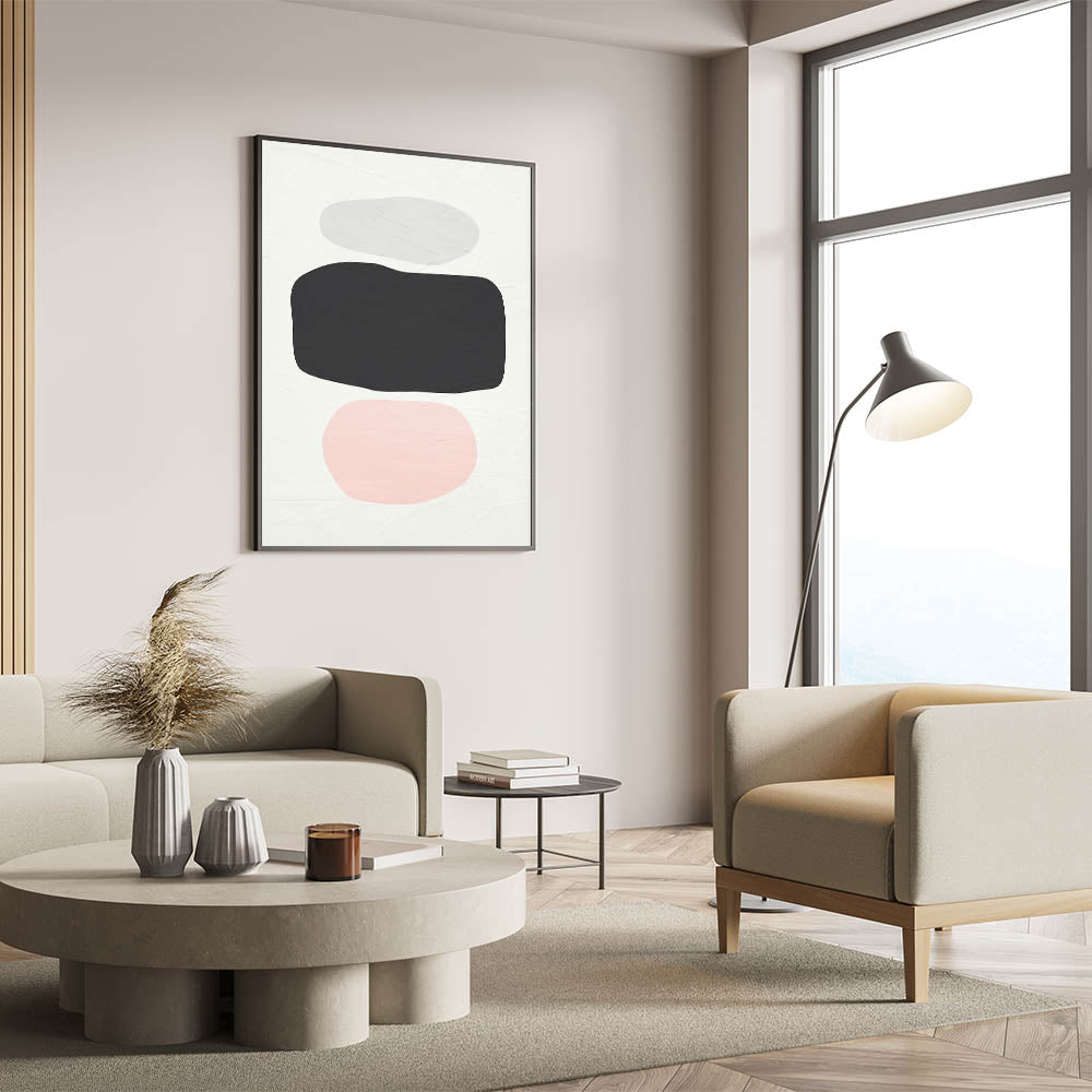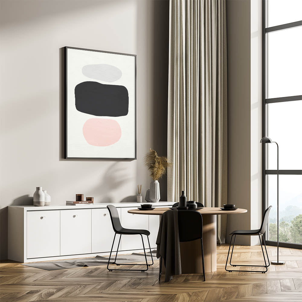 Bring a sense of calm and modern elegance to your space with this minimalist wall decor, featuring a soft blend of black, light gray, and blush pink organic shapes. The balanced composition and neutral tones create a sophisticated yet soothing aesthetic, making it an ideal choice for contemporary and Scandinavian-inspired interiors. Whether used as a focal point or part of a gallery wall, this contemporary canvas print effortlessly enhances modern spaces.