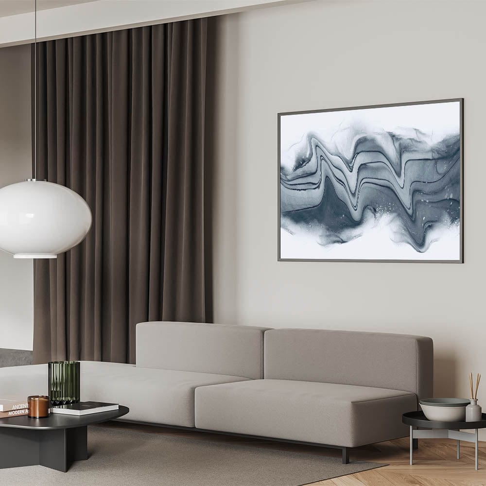 Enhance your space with the timeless elegance of this modern fluid art print. Featuring a striking monochrome palette of black, white, and gray, this piece captures the beauty of fluid movement with smooth, flowing lines. The modern, minimalist aesthetic makes it a versatile addition to any contemporary setting, from living rooms to offices.
