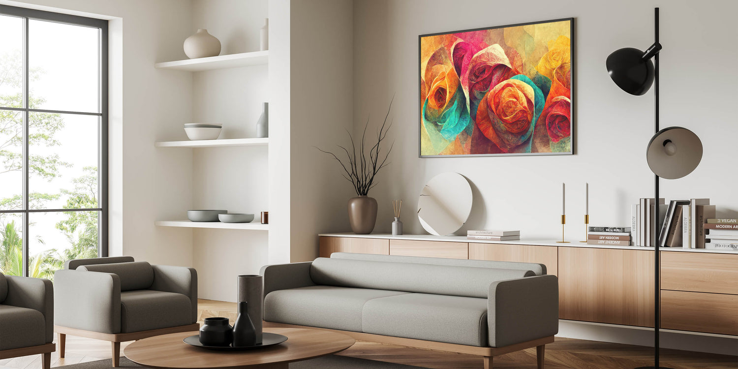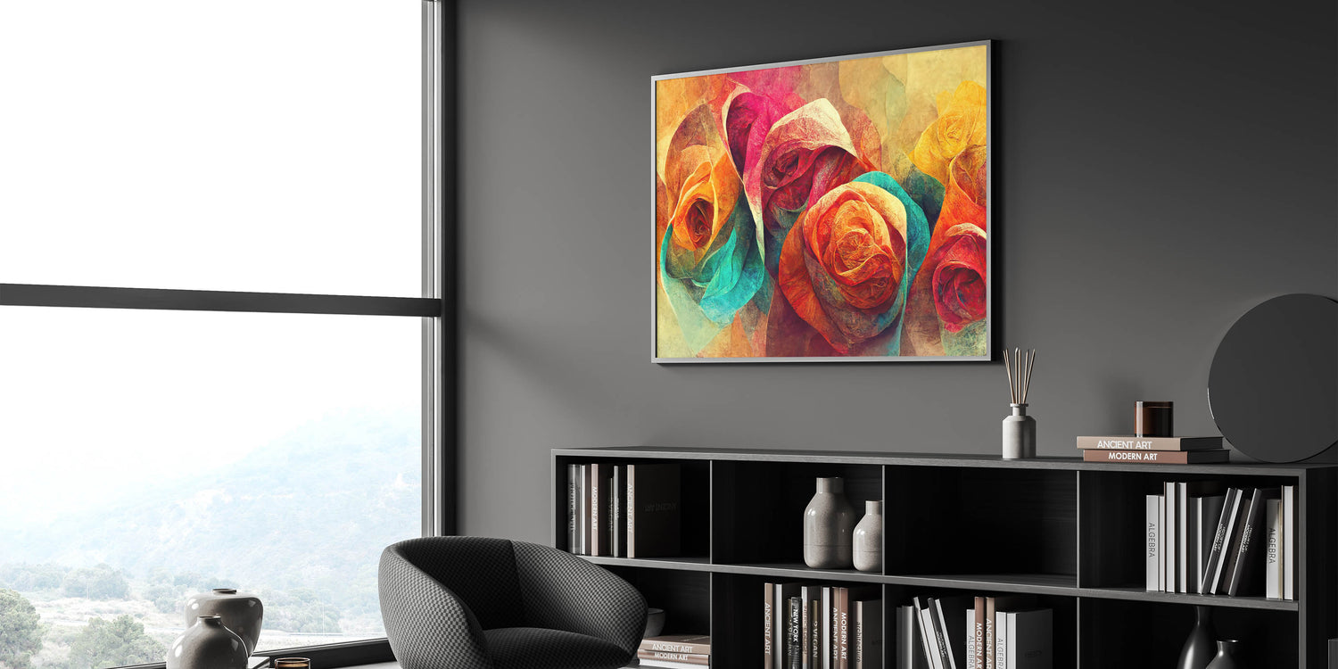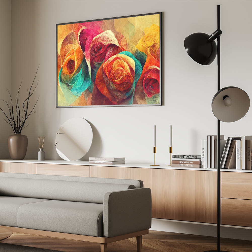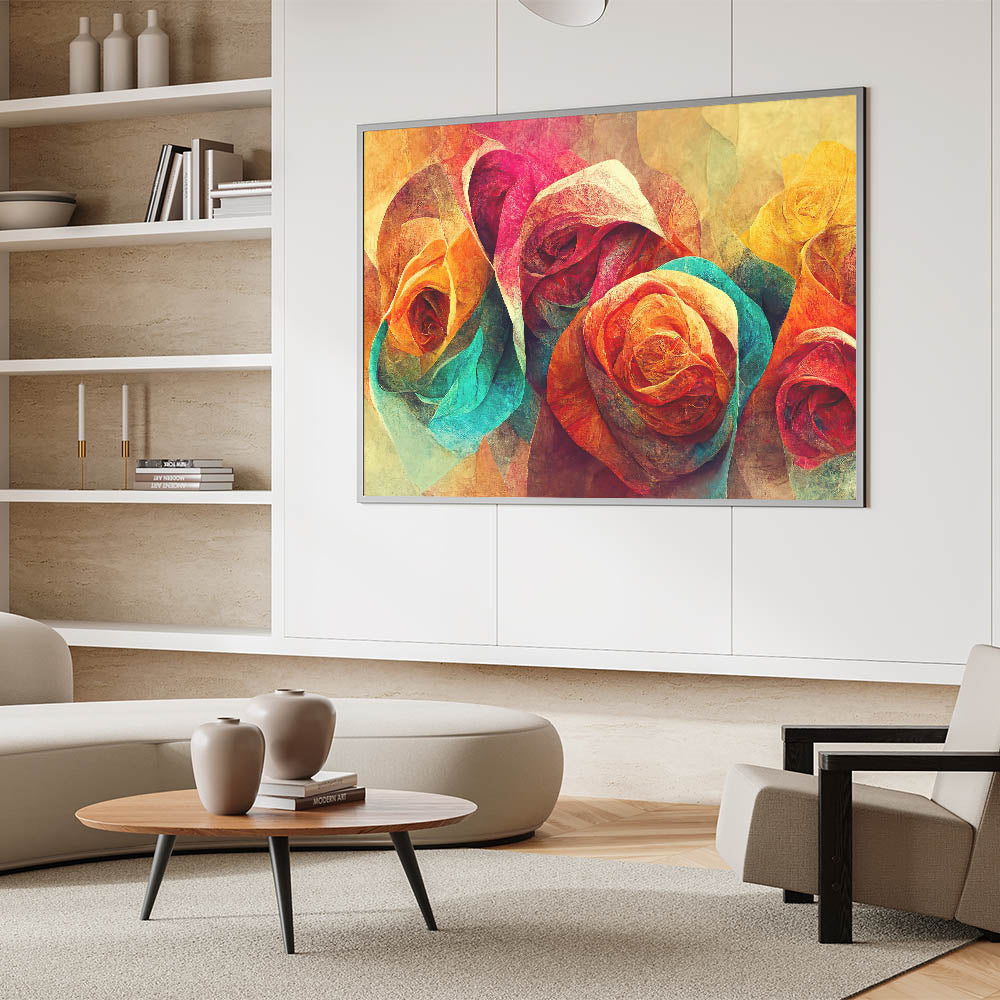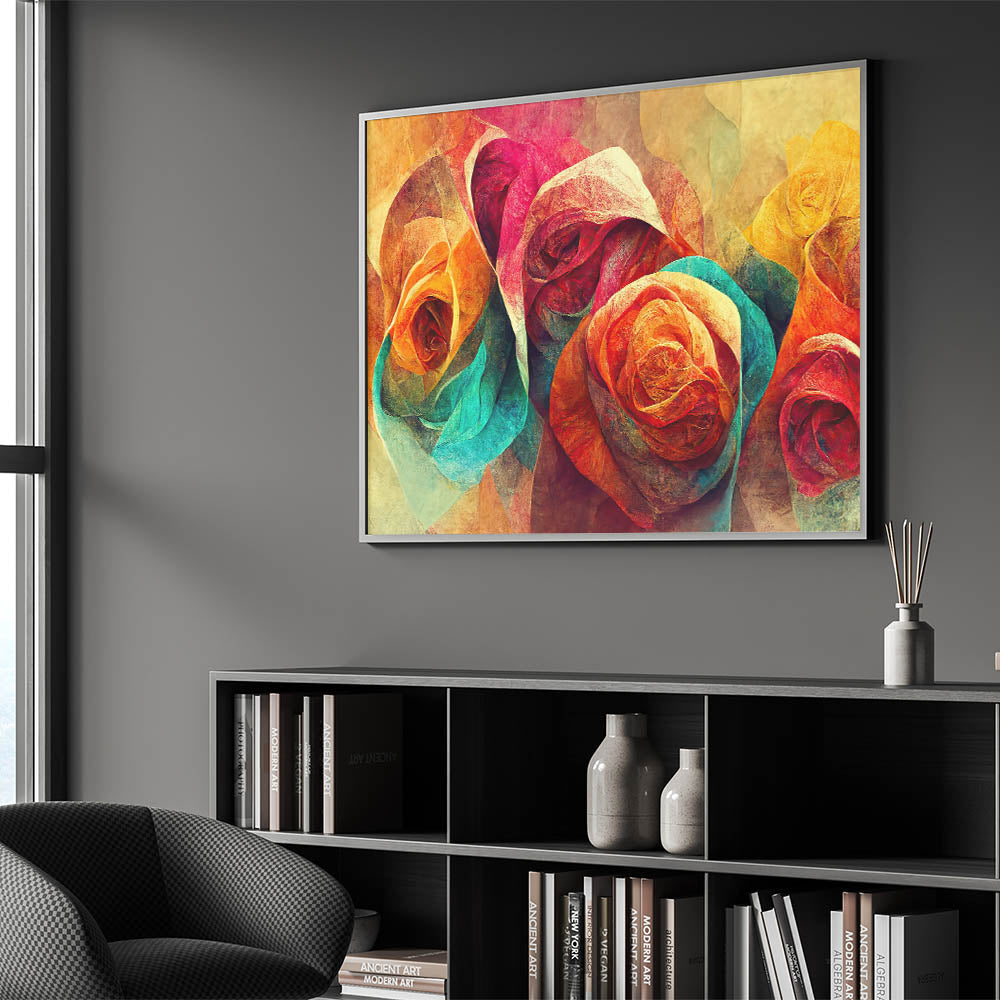 Infuse your space with a burst of color and creativity with our vibrant rainbow rose canvas, a stunning piece of abstract floral wall art. This artwork features a vivid display of multi-colored roses, blending hues of red, orange, yellow, teal, and more, creating a lively and dynamic visual experience.