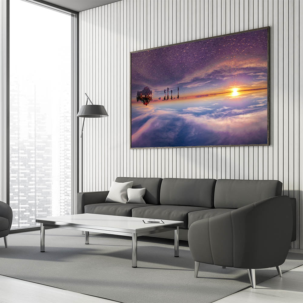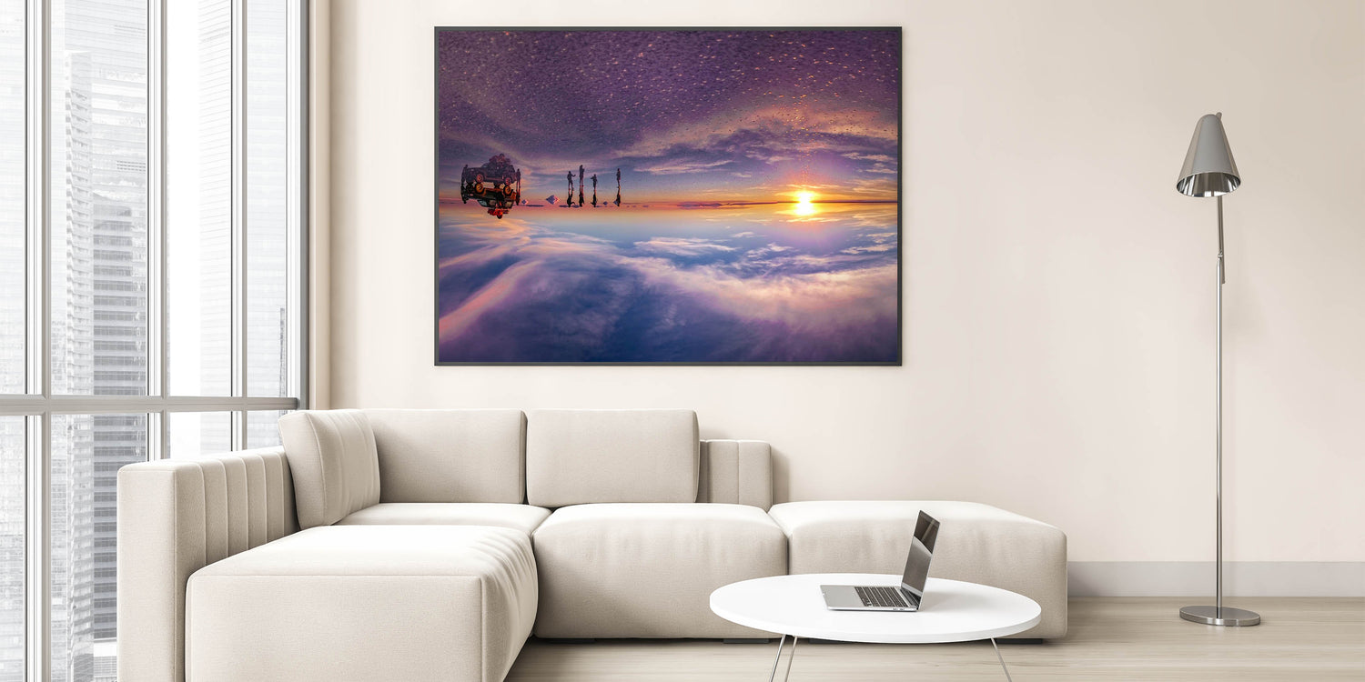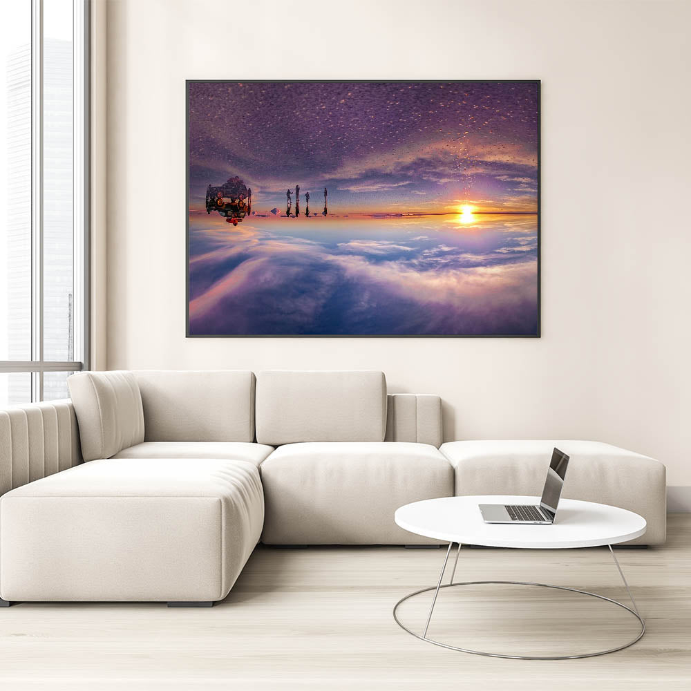 Capture the breathtaking beauty of Bolivia’s Uyuni Salt Flats with this mesmerizing wall art. This photograph features the striking reflection of the sunset, where vibrant orange, pink, and purple hues blend seamlessly into the expansive horizon, creating a surreal, mirror-like effect. Ideal for those who admire South American landscapes, this artwork brings the wonders of Bolivia into your home.