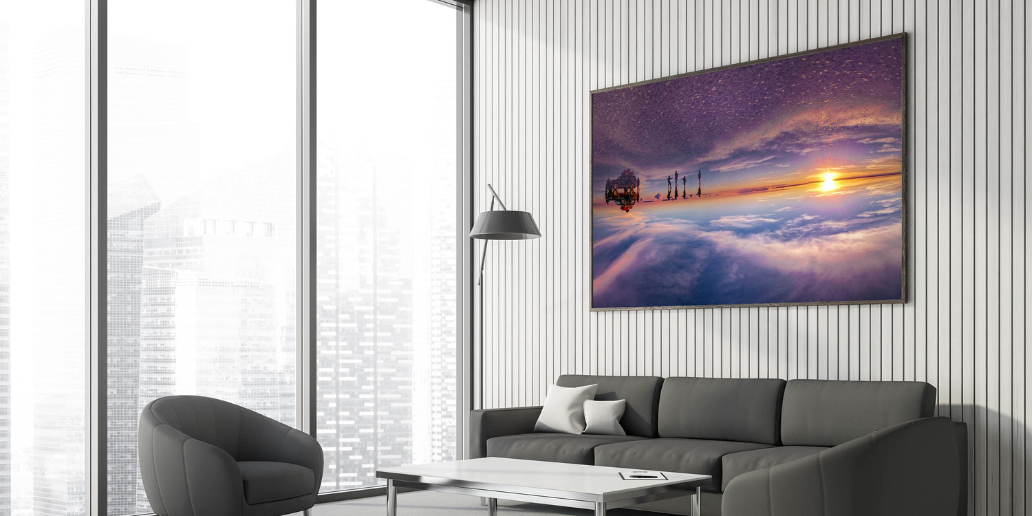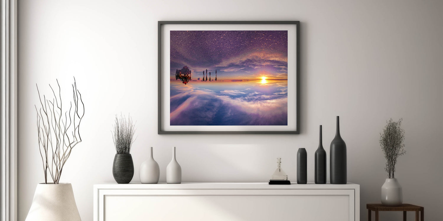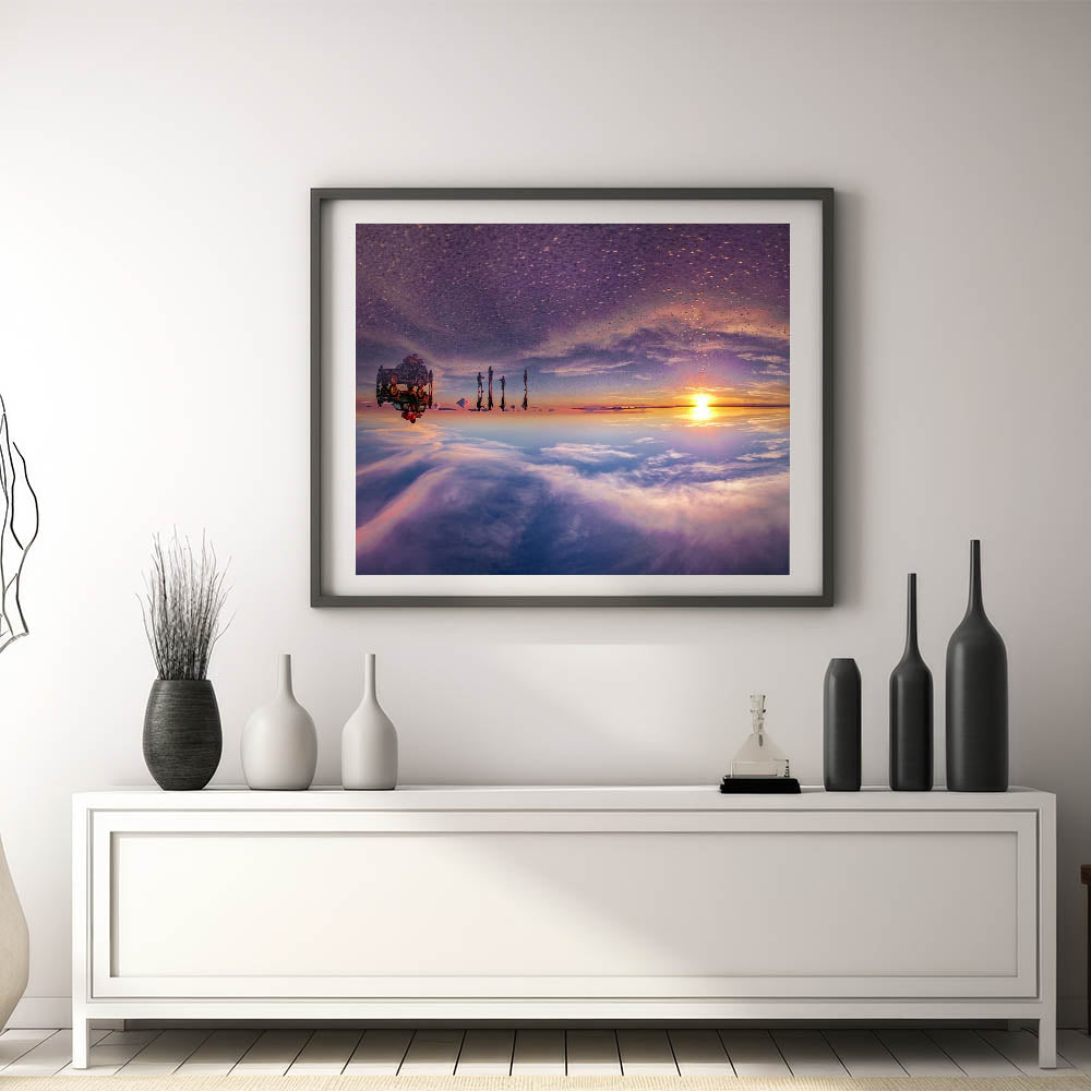 Capture the breathtaking beauty of Bolivia’s Uyuni Salt Flats with this mesmerizing wall art. This photograph features the striking reflection of the sunset, where vibrant orange, pink, and purple hues blend seamlessly into the expansive horizon, creating a surreal, mirror-like effect. Ideal for those who admire South American landscapes, this artwork brings the wonders of Bolivia into your home.