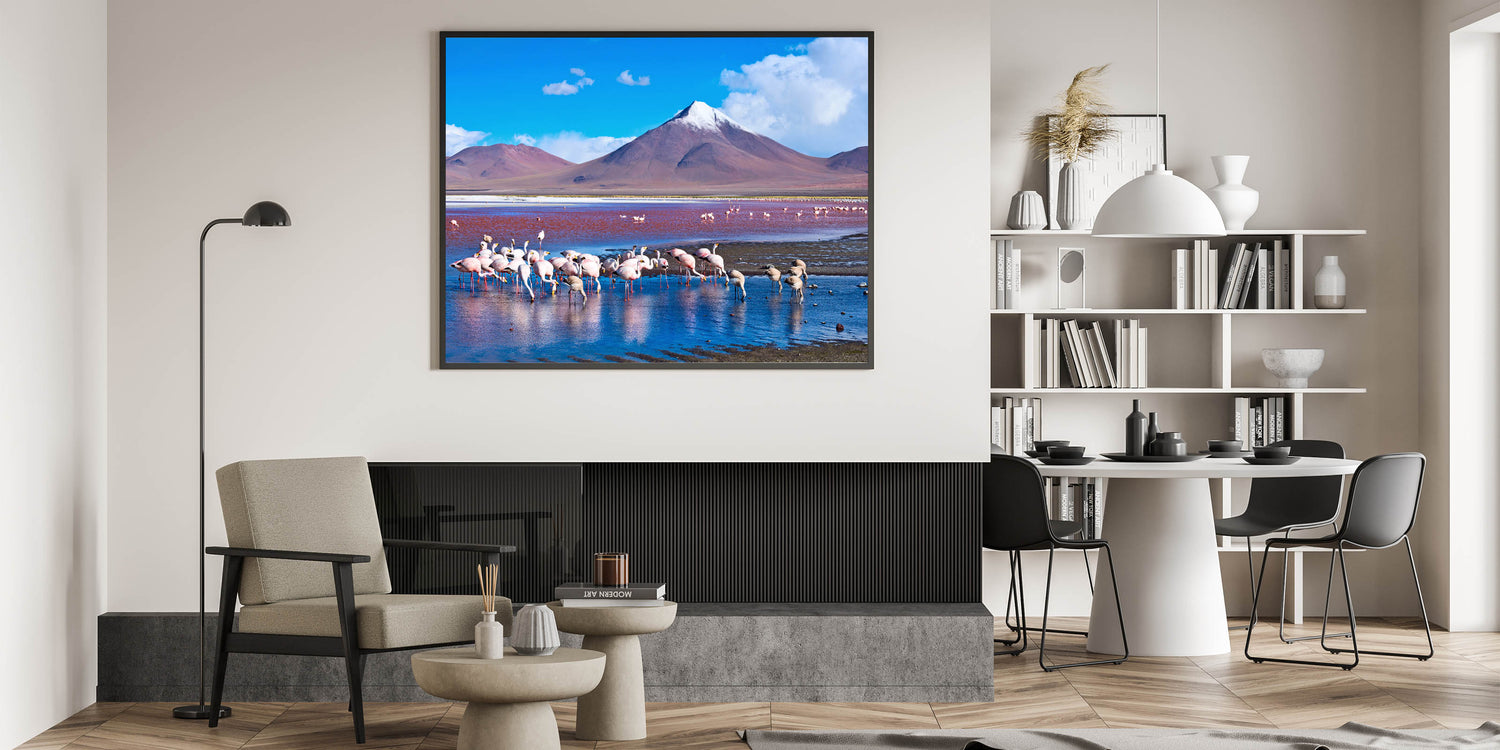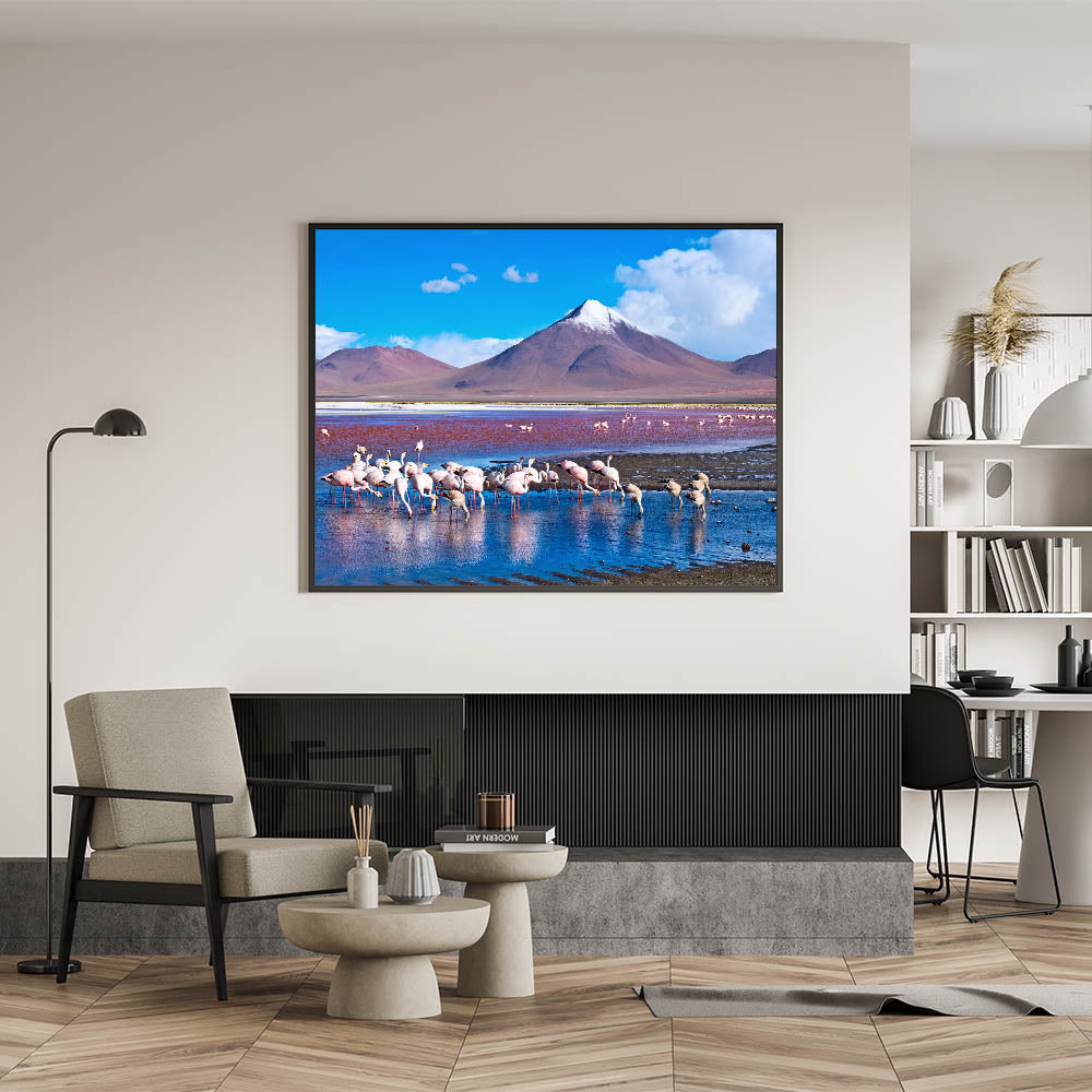 Discover the serene beauty of the Andes with "Flamingos at Andean Lake - Vibrant Bolivia Art." This exquisite piece showcases a flock of flamingos gracefully wading in the mineral-rich waters of a Bolivian lake, set against a backdrop of towering volcanic mountains under a brilliant blue sky.