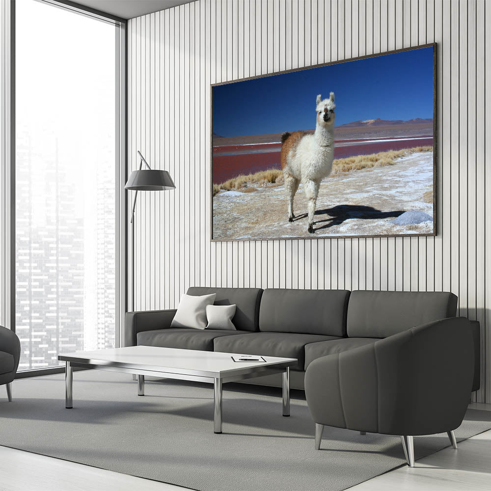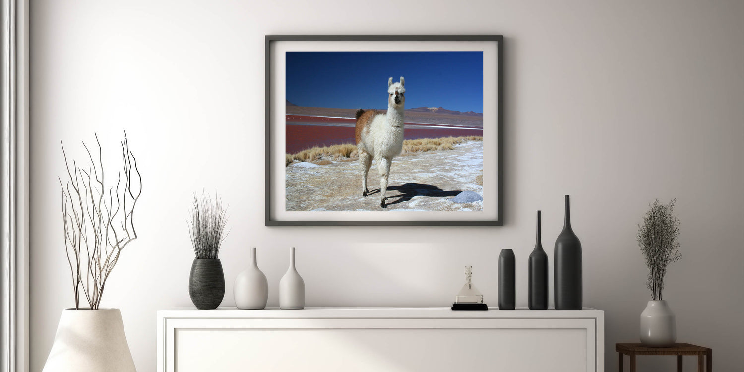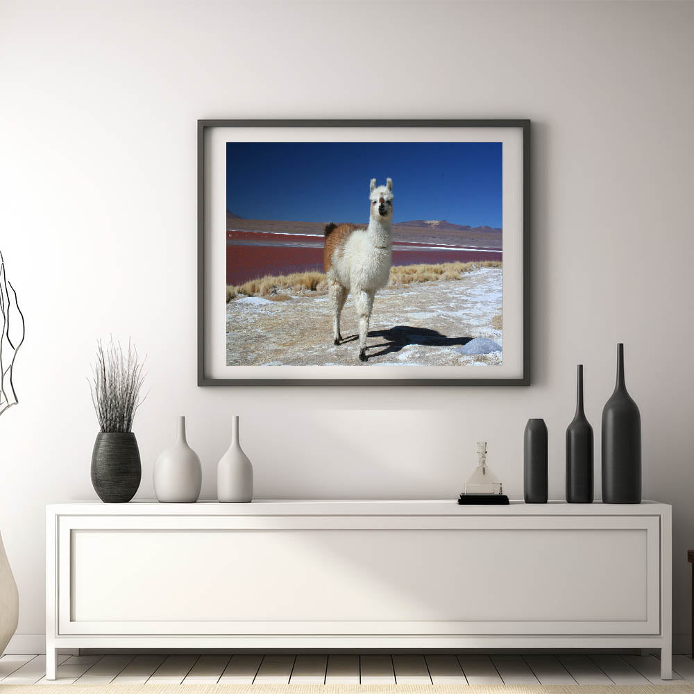 Immerse yourself in the unique natural beauty of Bolivia with "Llama at Red Lake - Unique Bolivia Landscape Art." This captivating artwork features a lone llama set against the surreal backdrop of one of Bolivia's famous red lakes, surrounded by the vast, serene expanse of the Andes.