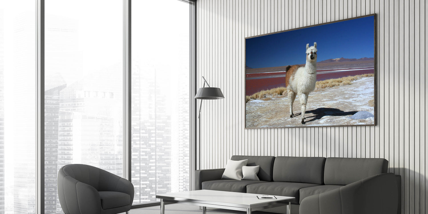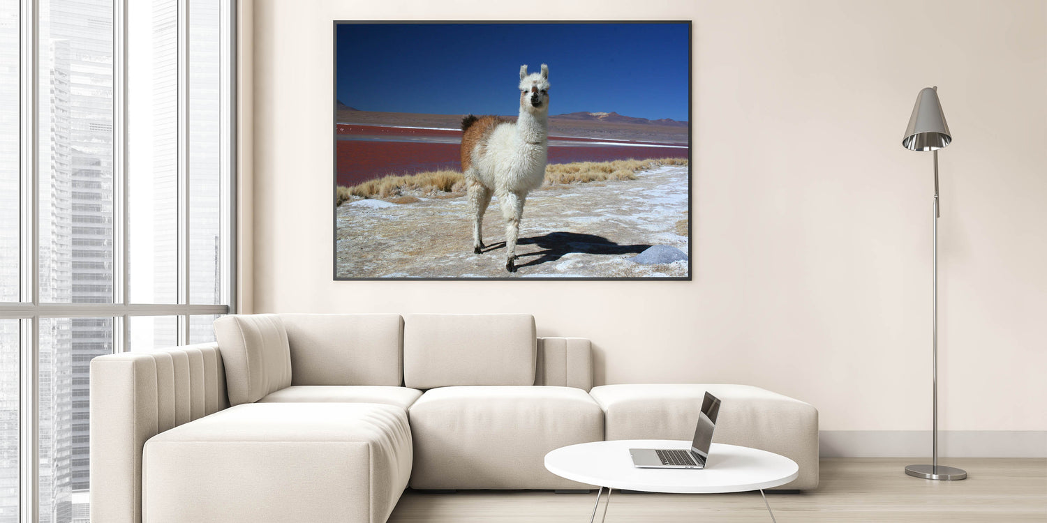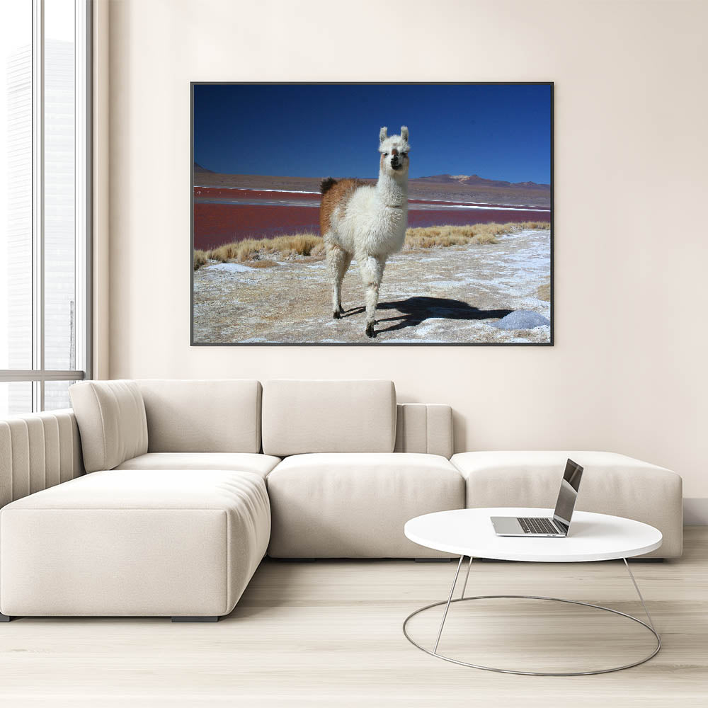 Immerse yourself in the unique natural beauty of Bolivia with "Llama at Red Lake - Unique Bolivia Landscape Art." This captivating artwork features a lone llama set against the surreal backdrop of one of Bolivia's famous red lakes, surrounded by the vast, serene expanse of the Andes.
