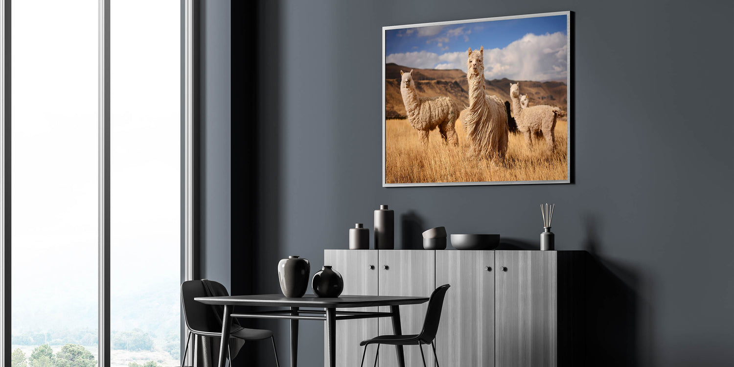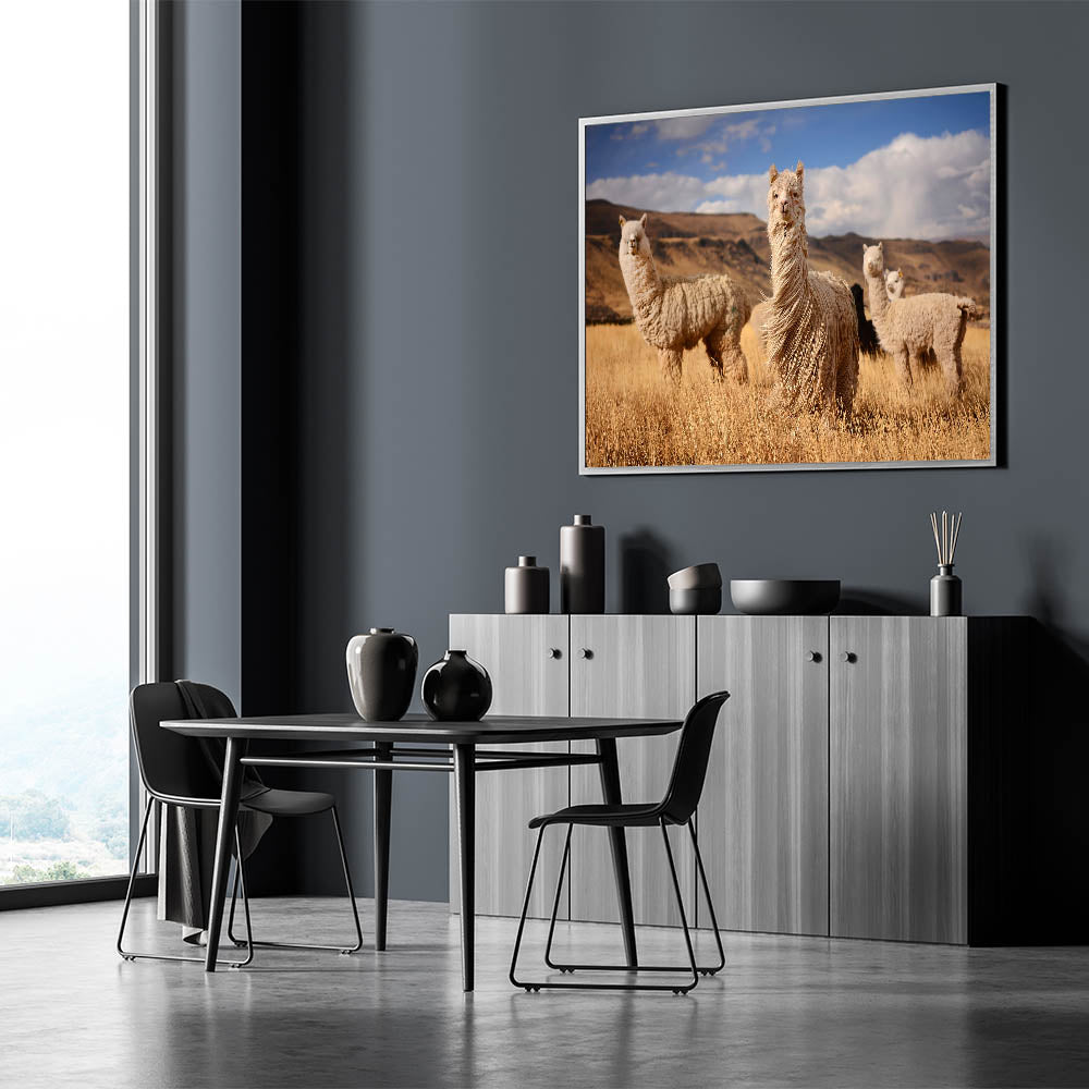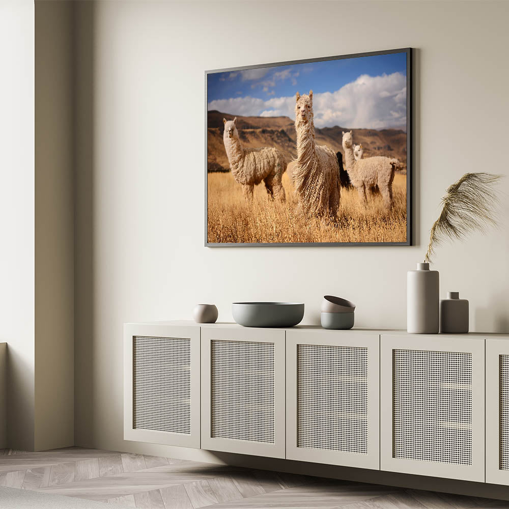 Introducing "Llamas in Bolivian Field - Andean Wildlife Art," a captivating portrayal of Bolivia's iconic llamas set against the rustic golden hues of an Andean landscape. This striking piece brings the serene and rugged beauty of the Bolivian highlands into your home or office, offering a glimpse into the peaceful life of these charming animals.