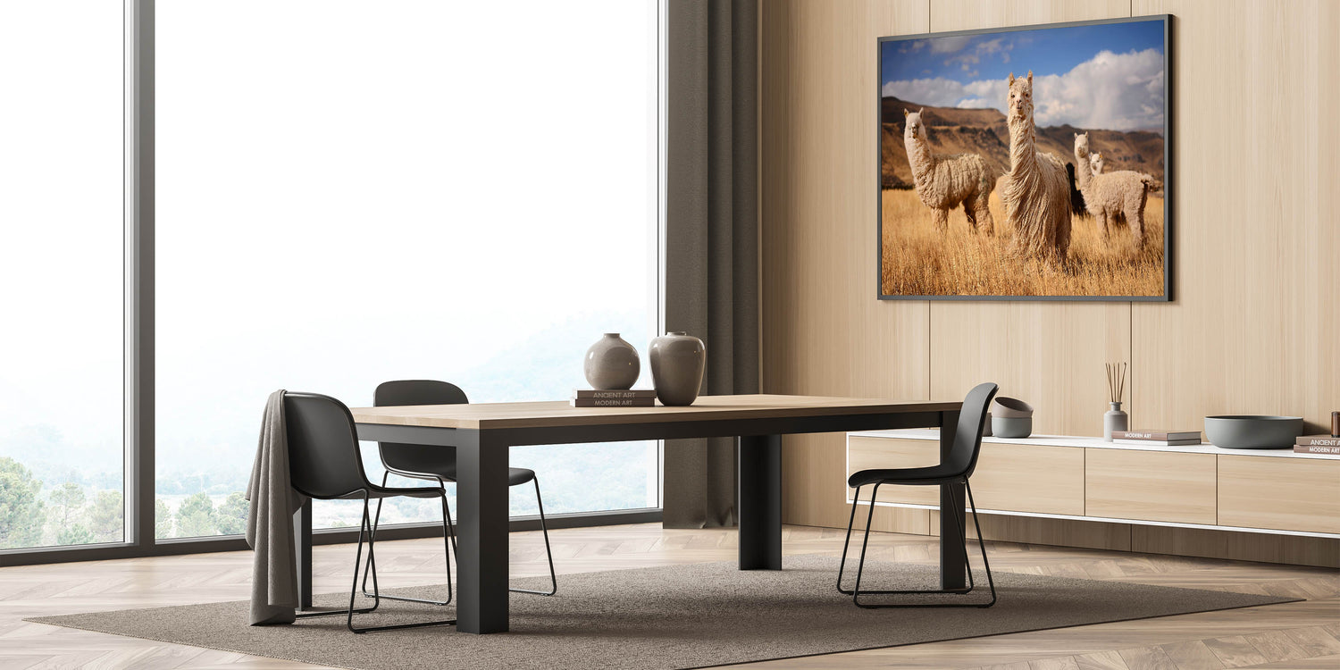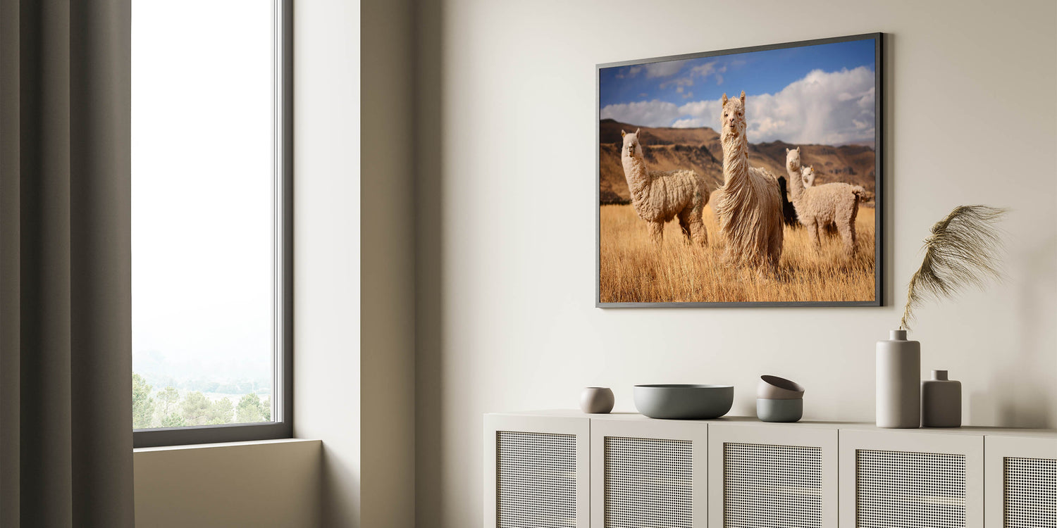 - Rich Textures: The artwork highlights the textured coats of the llamas and the soft, undulating grass of the fields.