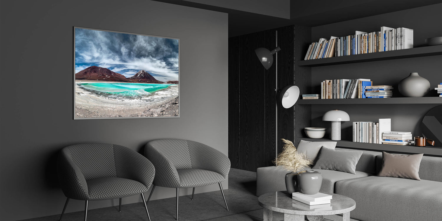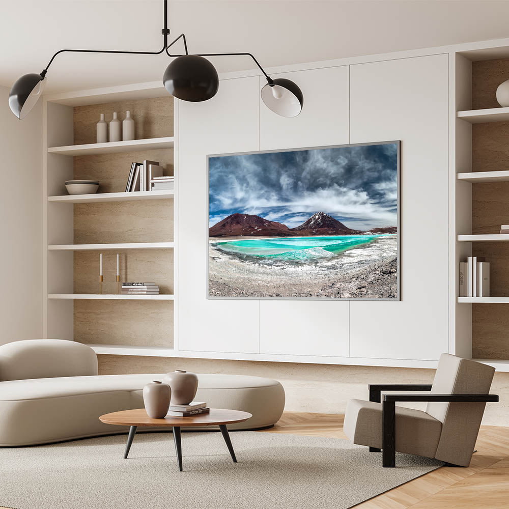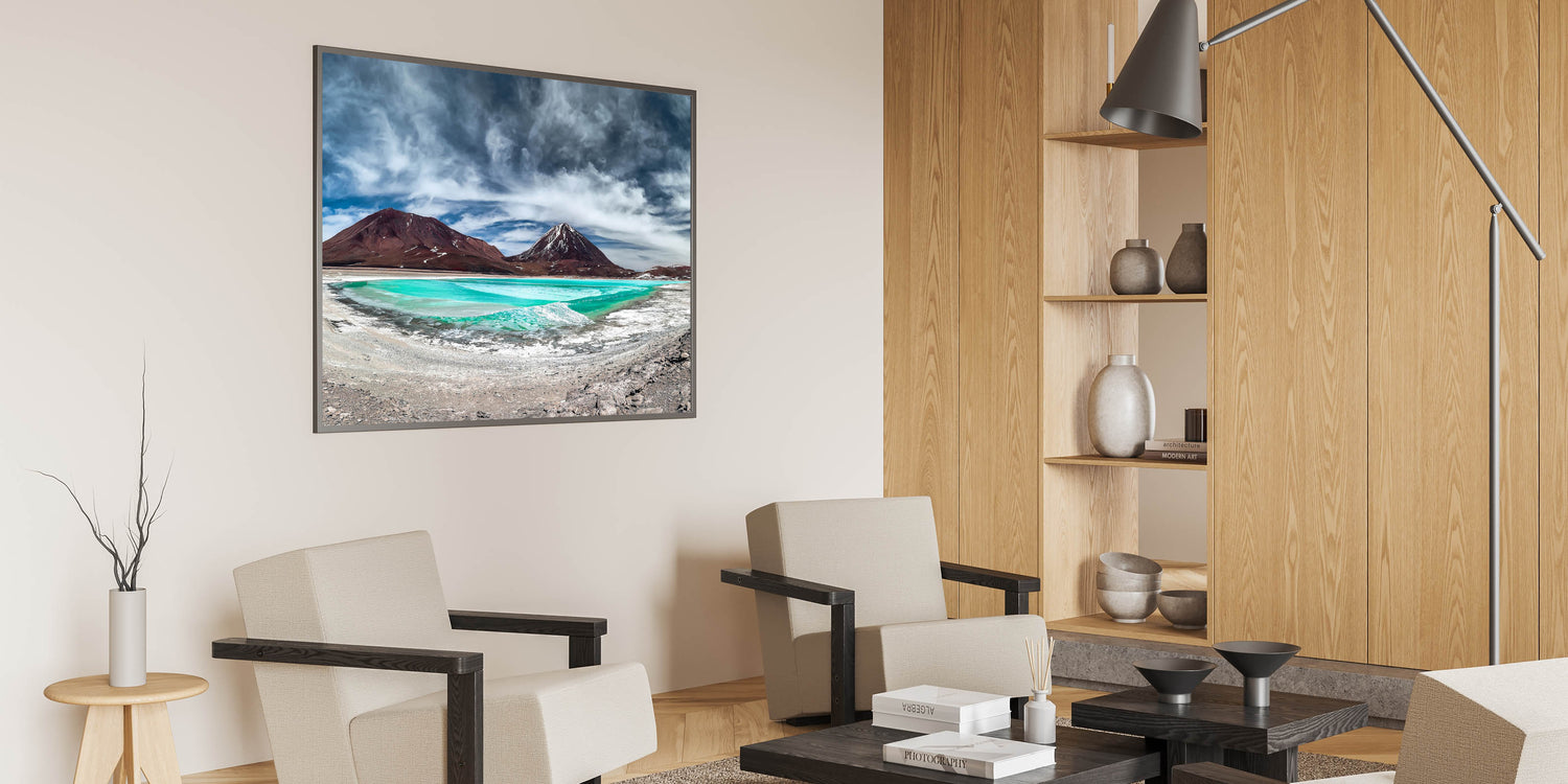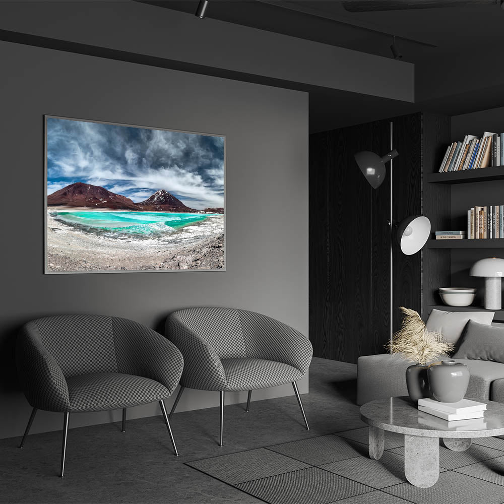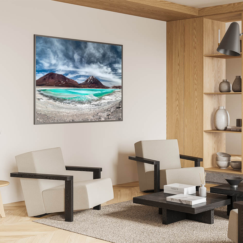 Enhance your space with the grandeur of the Andes in our "Panoramic Andes & Turquoise Lake - Bolivia Wall Art." This artwork captures a sweeping view of the stark beauty of Bolivia's mountainous terrain juxtaposed with the vivid turquoise waters of a high-altitude lake, under a dramatic sky.