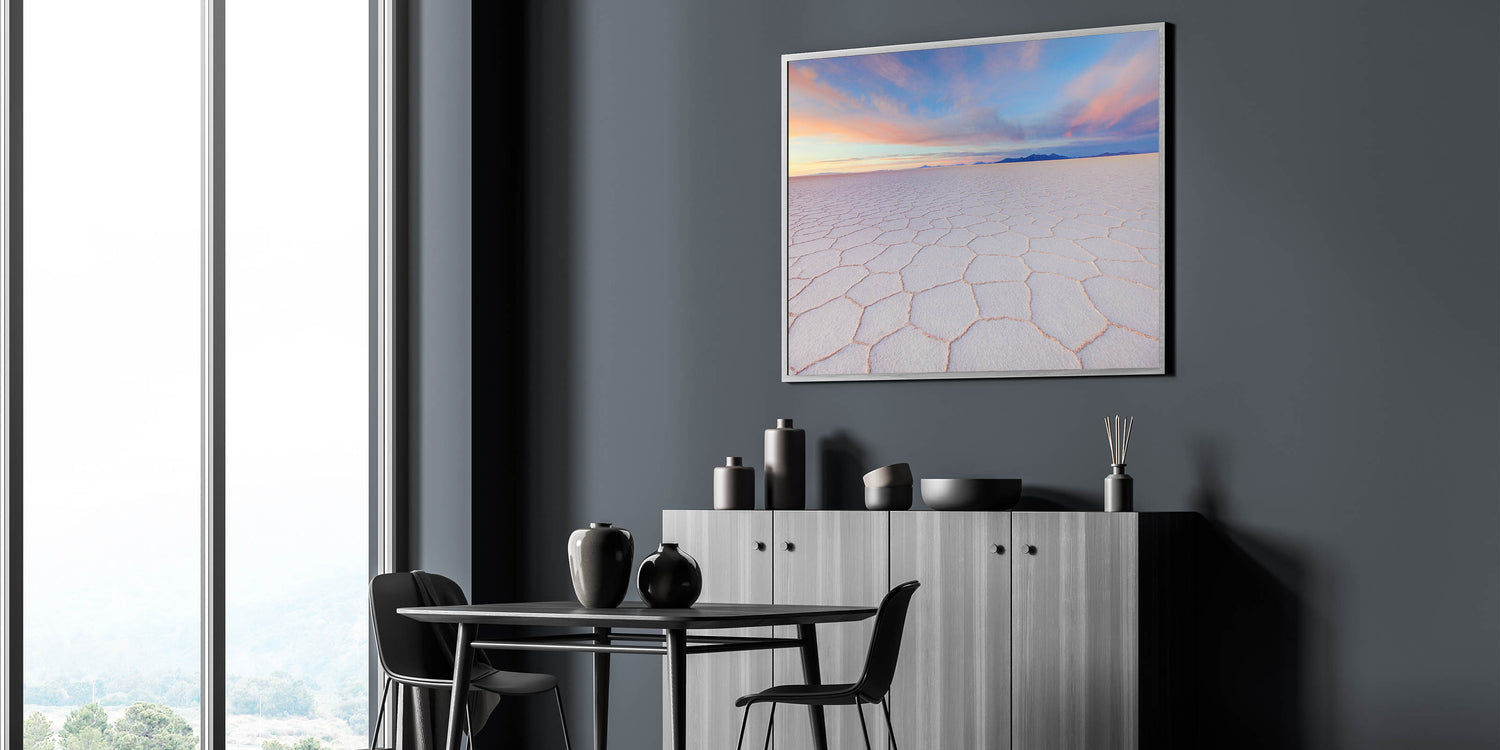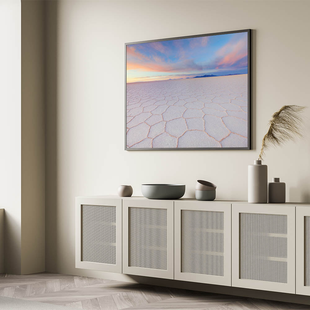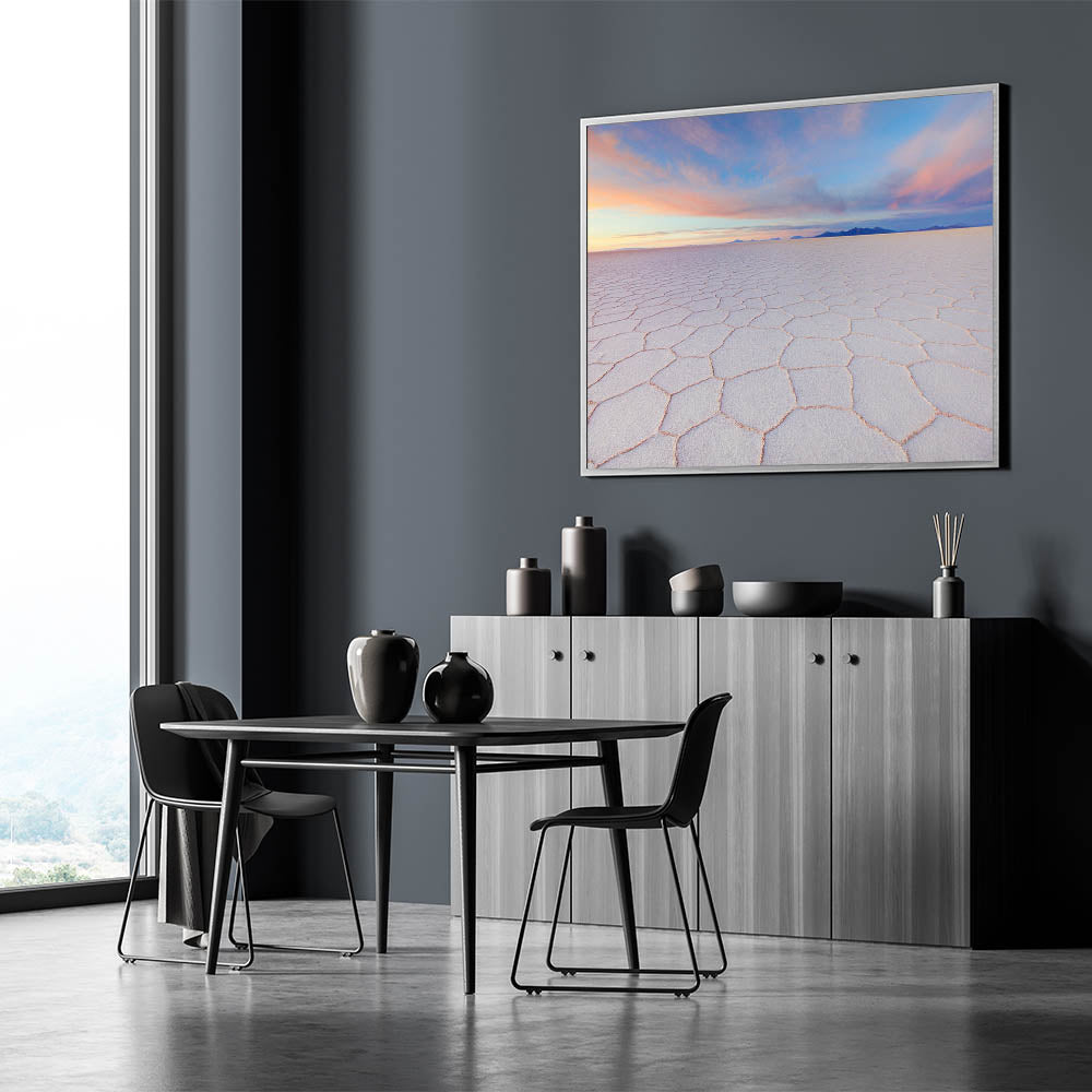 Discover the ethereal beauty of Bolivia with "Salt Flats Sunset - Majestic Bolivia Wall Art." This mesmerizing piece captures the vast and pristine salt flats of Bolivia under the enchanting hues of a sunset sky, where the earth and sky blend in a breathtaking display of natural colors.