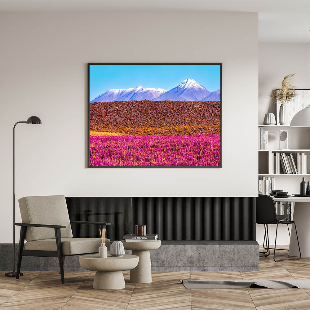 Immerse yourself in the vibrant colors of Bolivia with our "Vibrant Purple Fields Art - Bolivia Mountain View," a captivating piece from our Bolivia Scenery by Region collection. This artwork highlights a breathtaking landscape of vivid purple fields set against the backdrop of majestic snow-capped mountains, showcasing the unique and diverse geography of Bolivia.