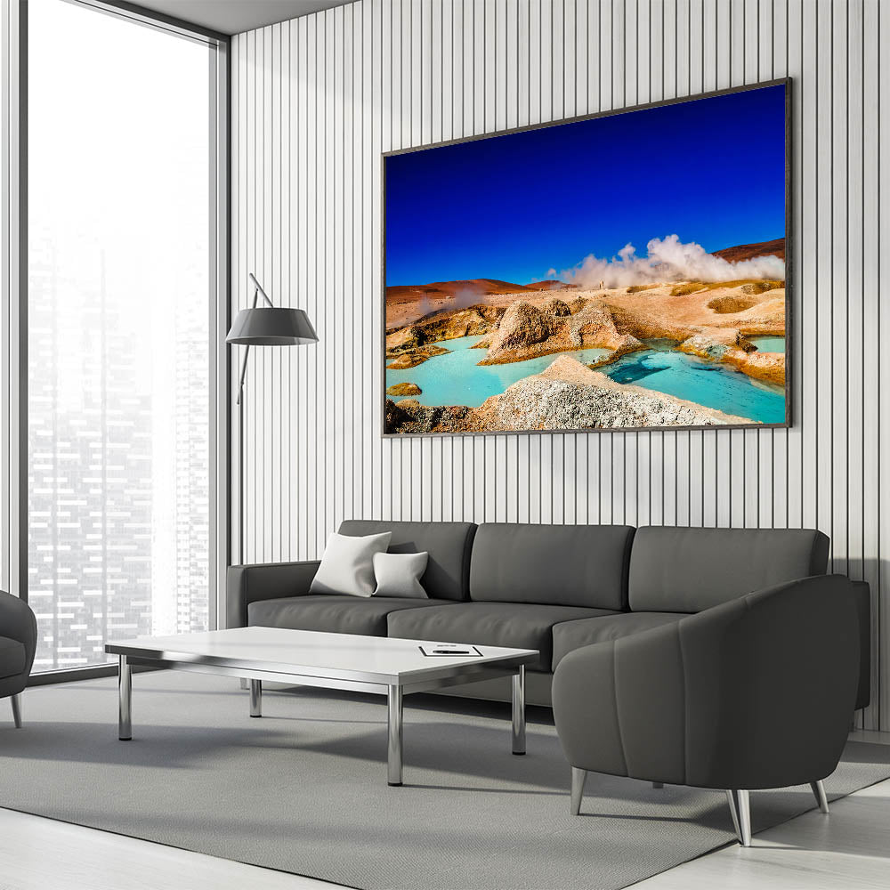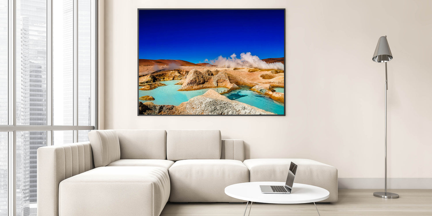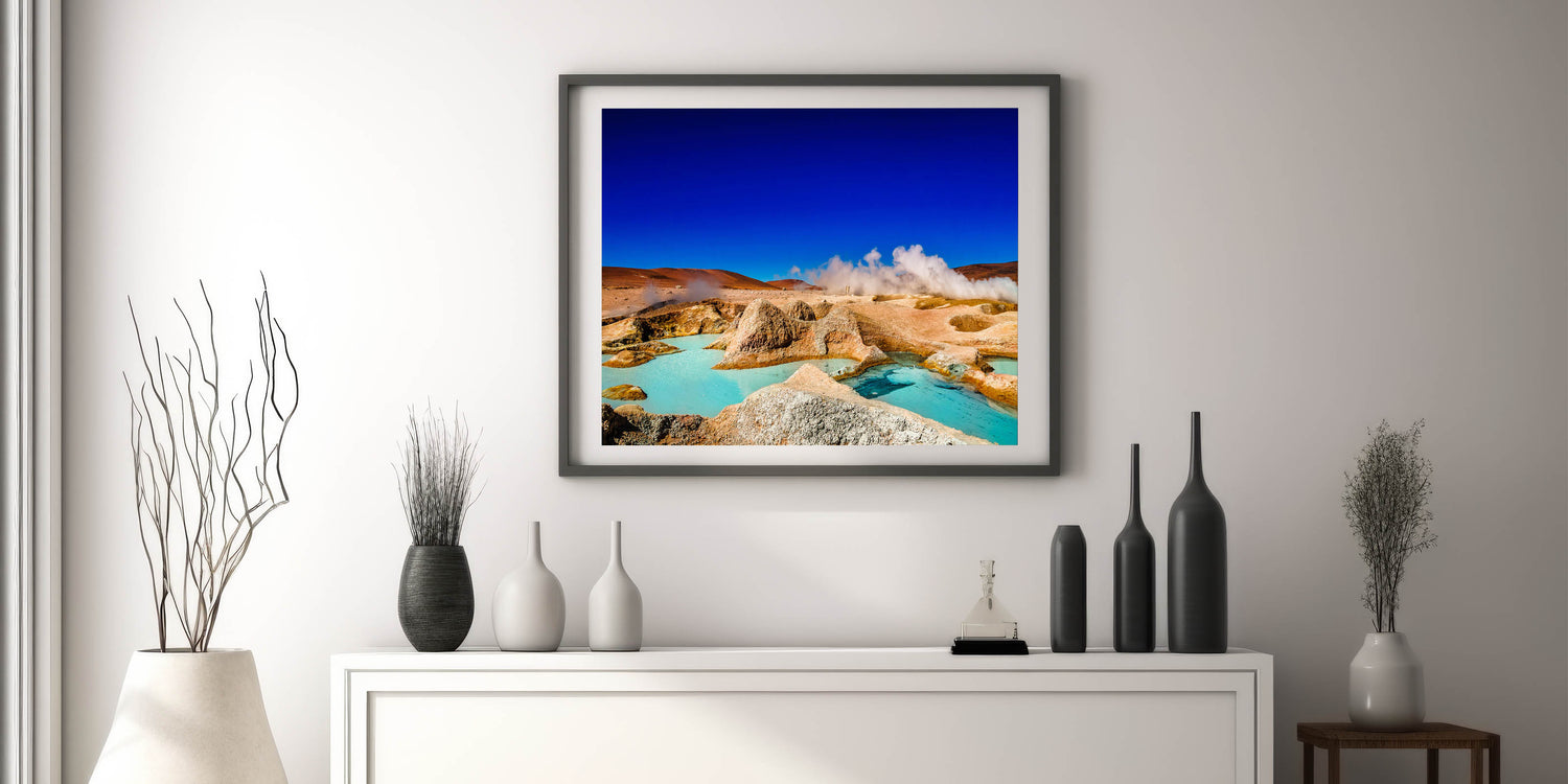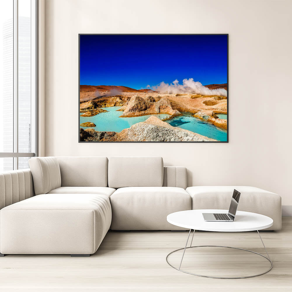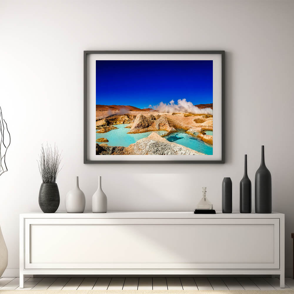 Explore the dramatic and vibrant landscapes of Bolivia with our "Vivid Geothermal Pools Art - Bolivia Natural Wonders," a signature piece in our Bolivia Scenery by Region collection. This artwork captures the intense blue and turquoise geothermal pools, nestled amidst the barren highlands, contrasting starkly with the steam and rugged terrain.