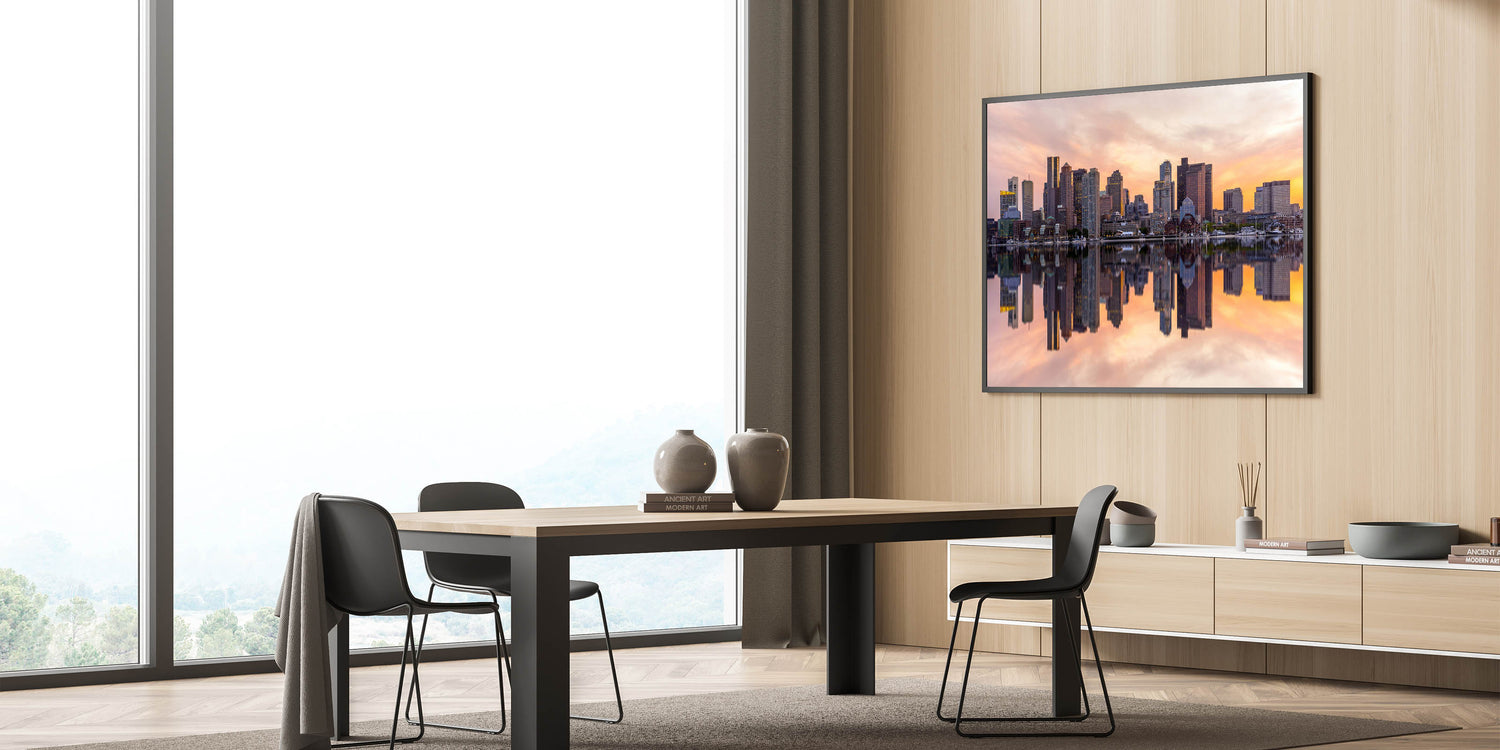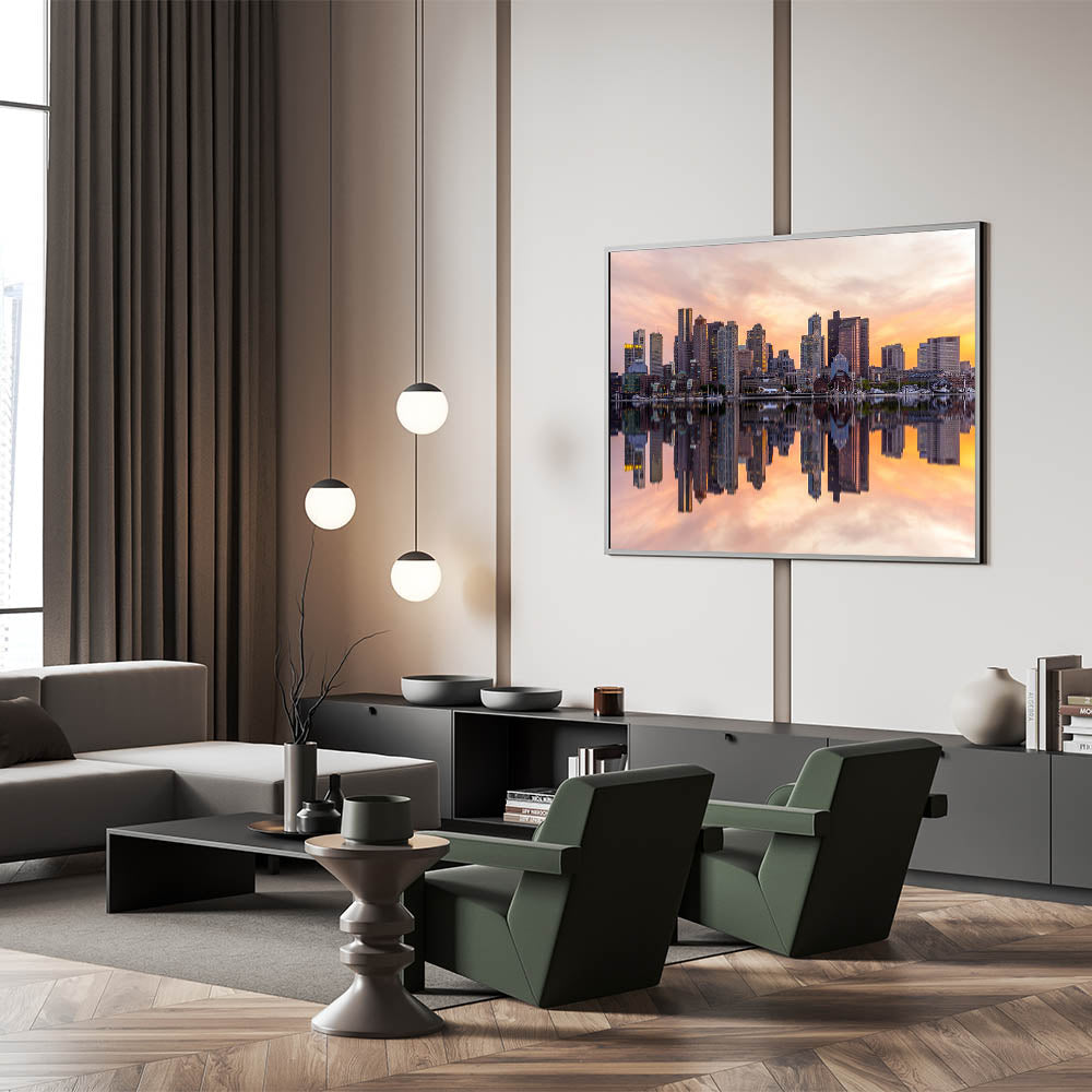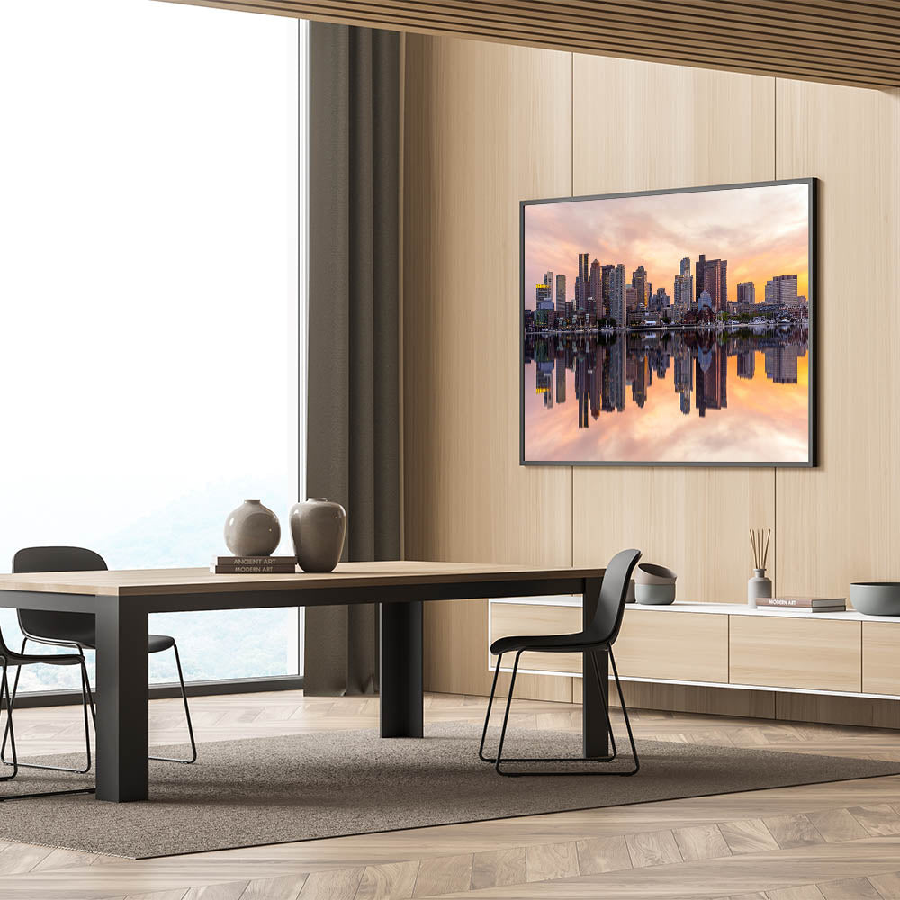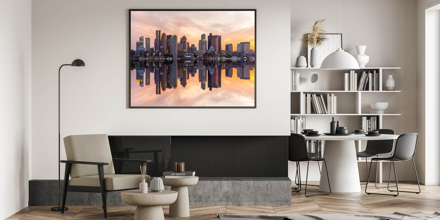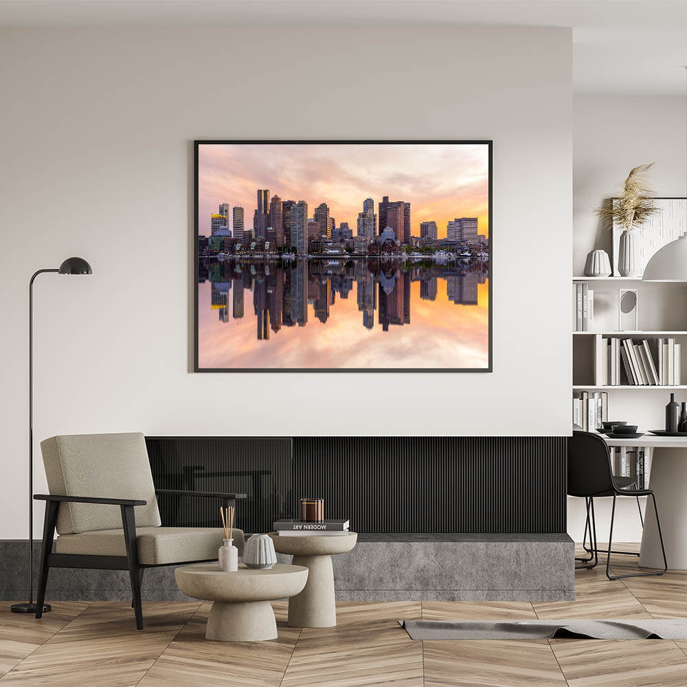 Capture the essence of Boston with this stunning Boston Wall Art showcasing the iconic city skyline at sunset. The vibrant reflection of the towering skyscrapers in the calm waters creates a mesmerizing scene that’s perfect for any home or office. This premium Massachusetts Wall Art features warm hues of orange and pink, bringing both energy and elegance to your space. Available in a range of formats, including Boston Canvas Prints and Framed Art, this piece is a must-have for lovers of Boston’s iconic scenery.