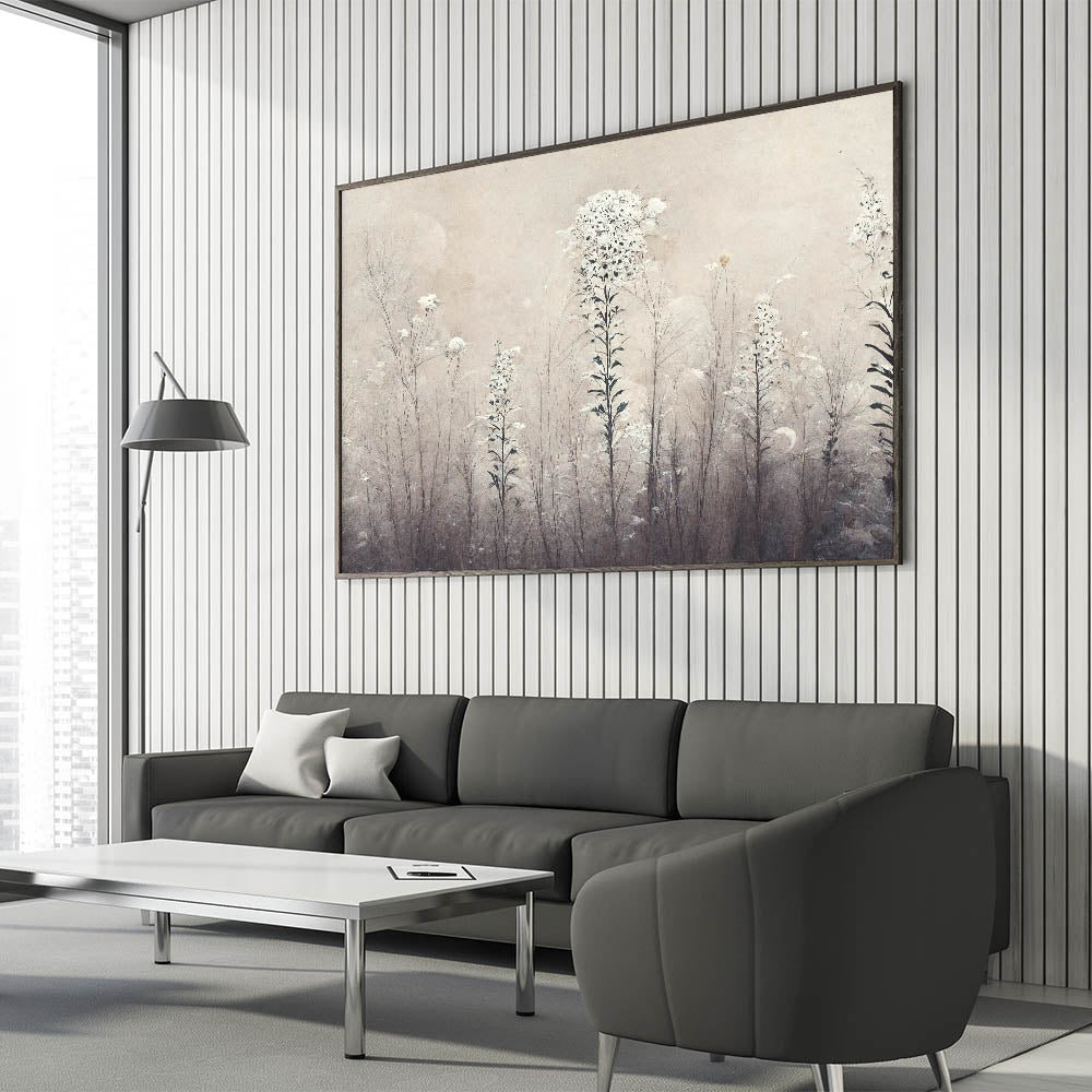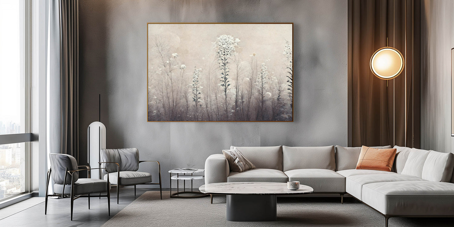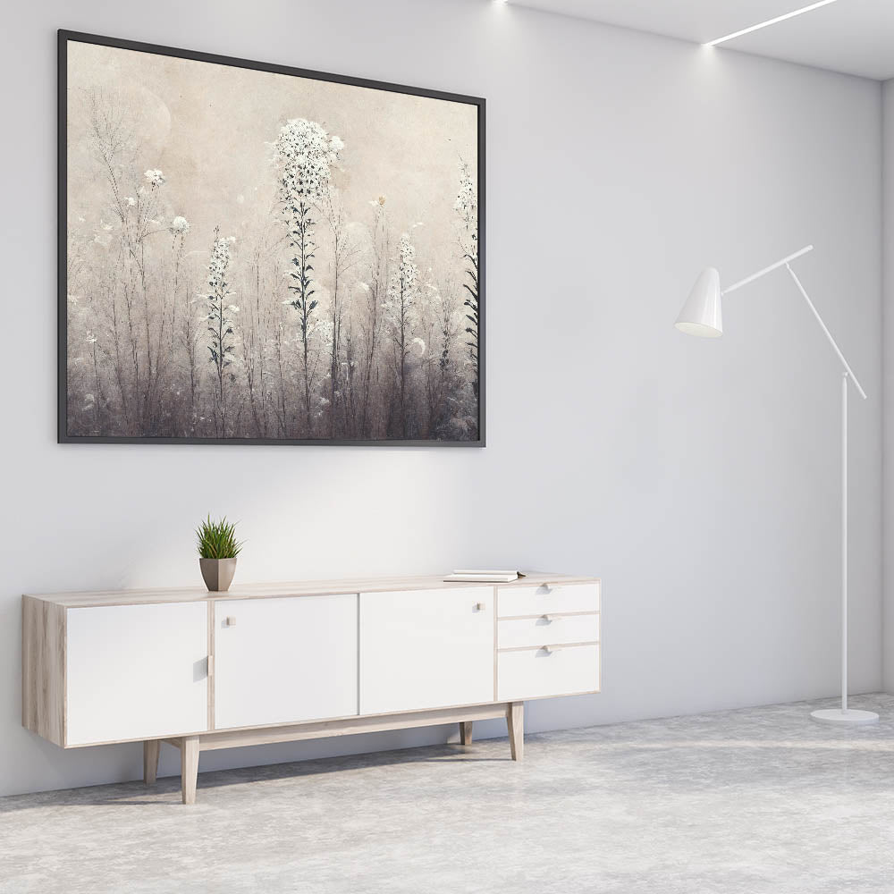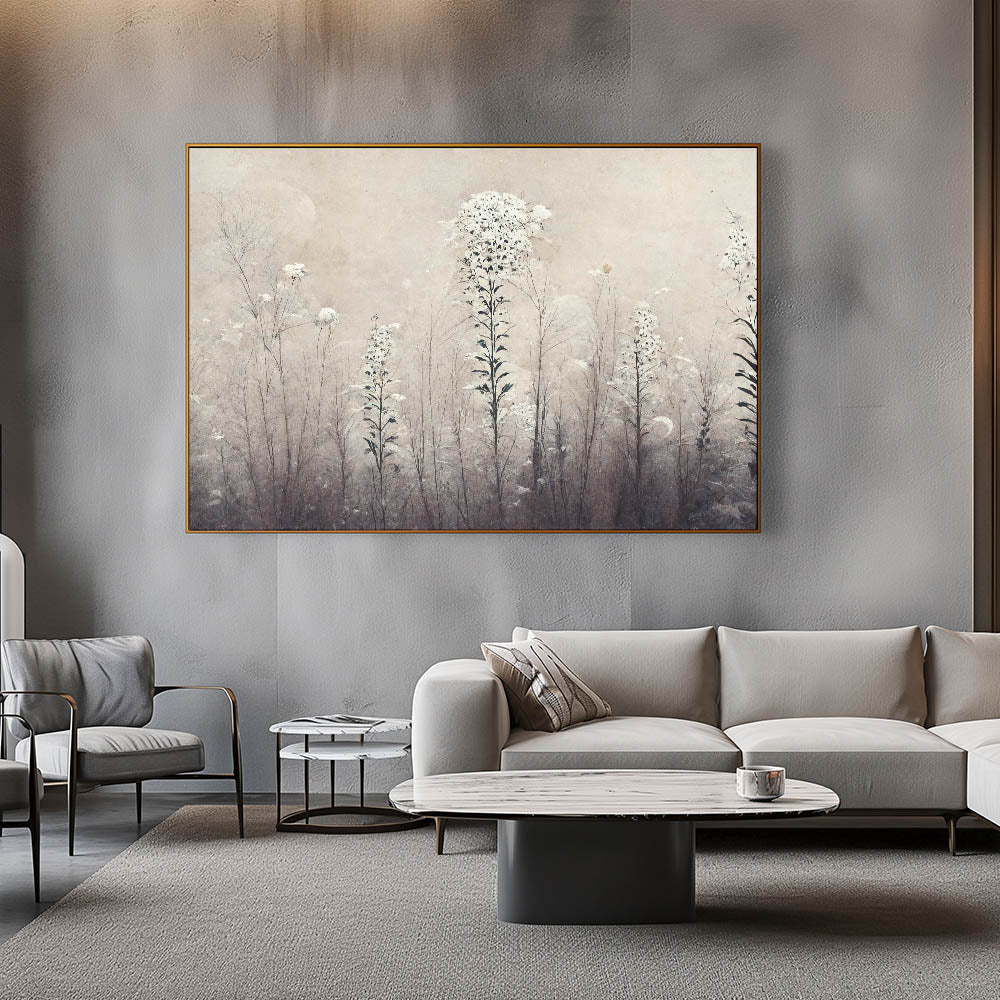 Introduce a touch of subtle elegance to your decor with this "Abstract Botanical Prints" piece, showcasing delicate white wildflowers against a misty, muted background. The gentle tones of beige and gray, combined with slender black stems, create a peaceful, almost ethereal atmosphere. This floral abstract art captures the quiet beauty of nature, perfect for adding a refined and tranquil vibe to any space, from bedrooms to living areas.