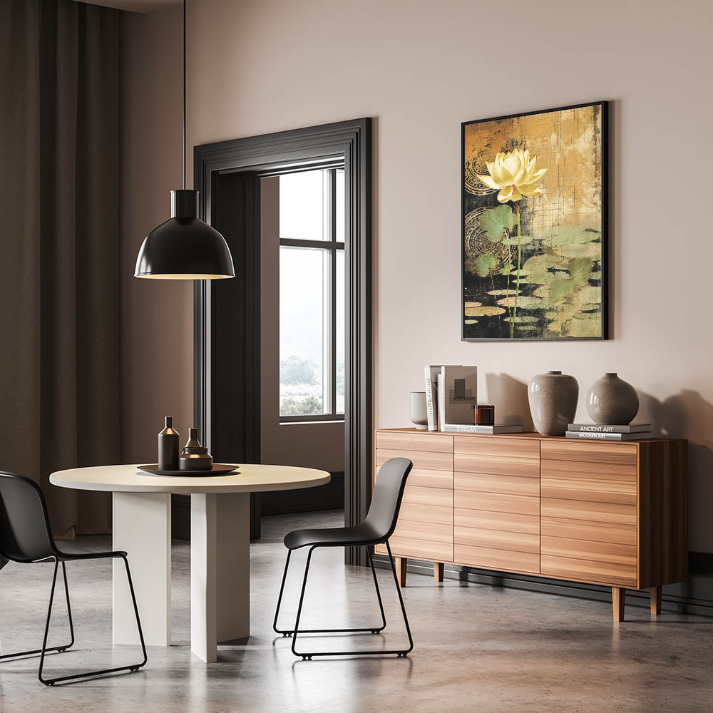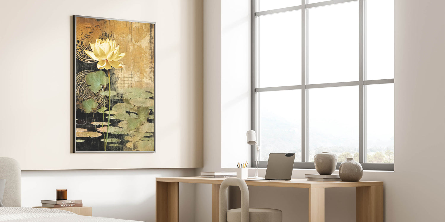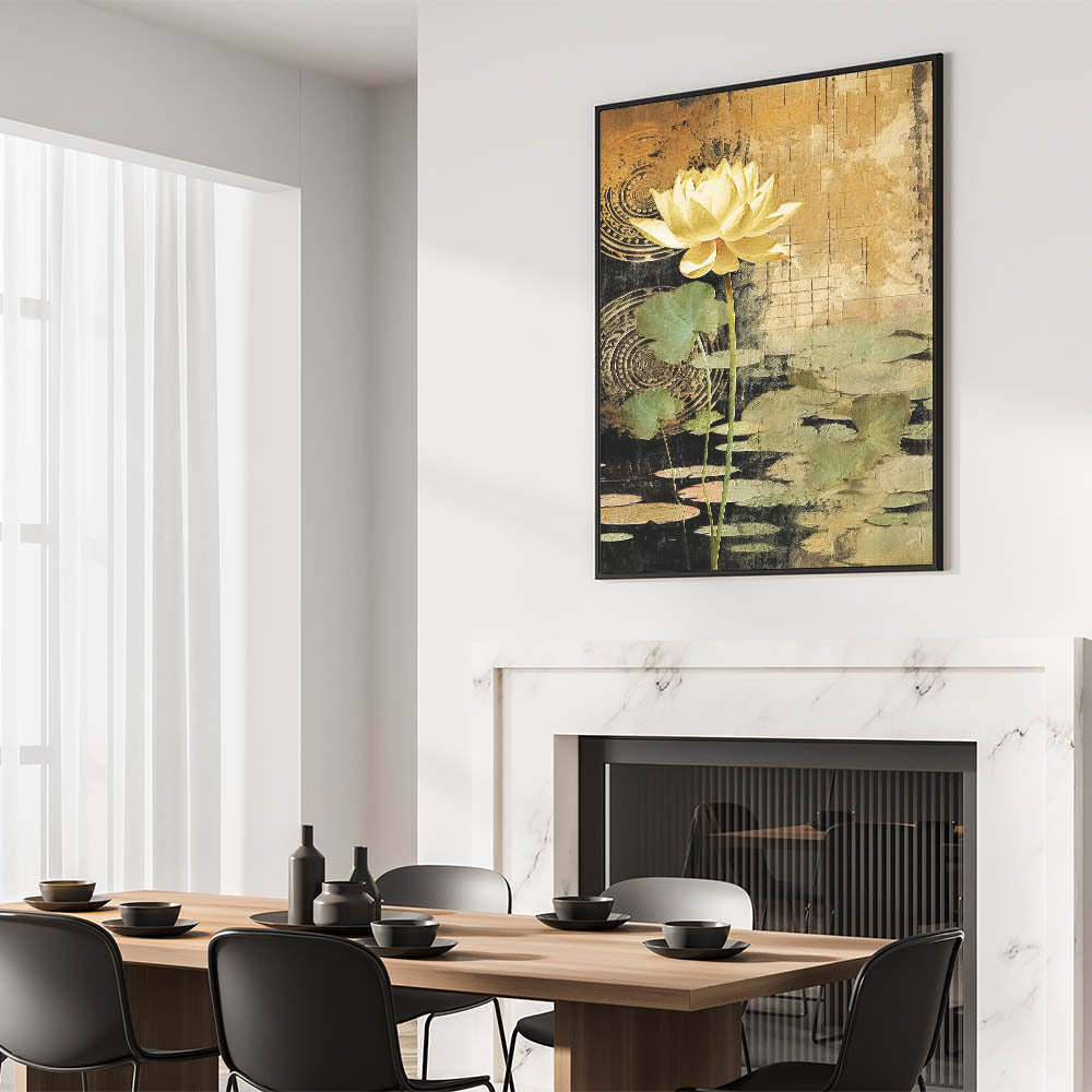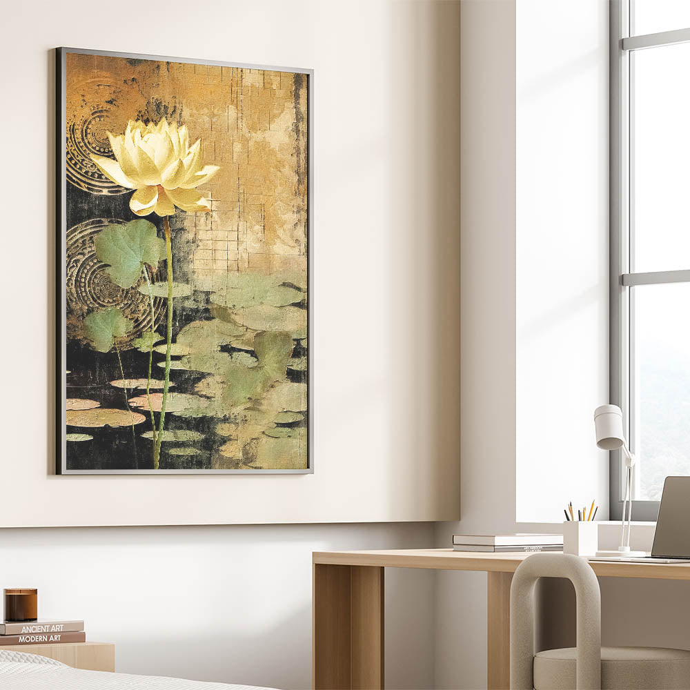 Infuse your space with the elegance of this golden lotus floral canvas. This abstract botanical print showcases a radiant yellow lotus flower against an intricate, textured background with warm earth tones. The combination of the lotus and natural patterns evokes a serene, Eastern-inspired atmosphere, making it an ideal focal point for any room.
