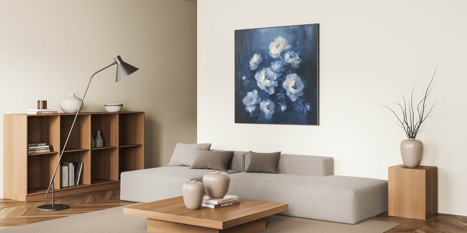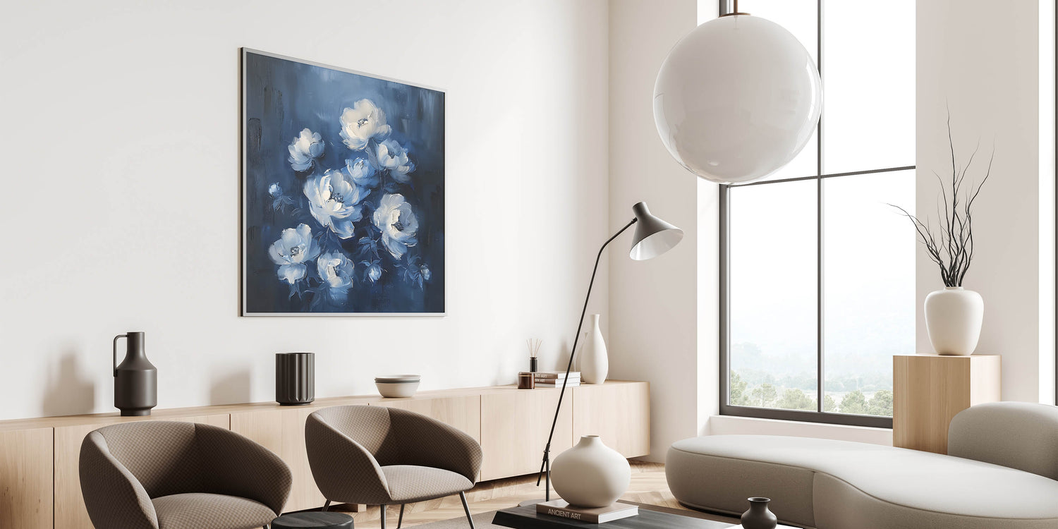 - Dramatic Color Palette: Contrasts white flowers with deep shades of blue, creating a bold visual impact.