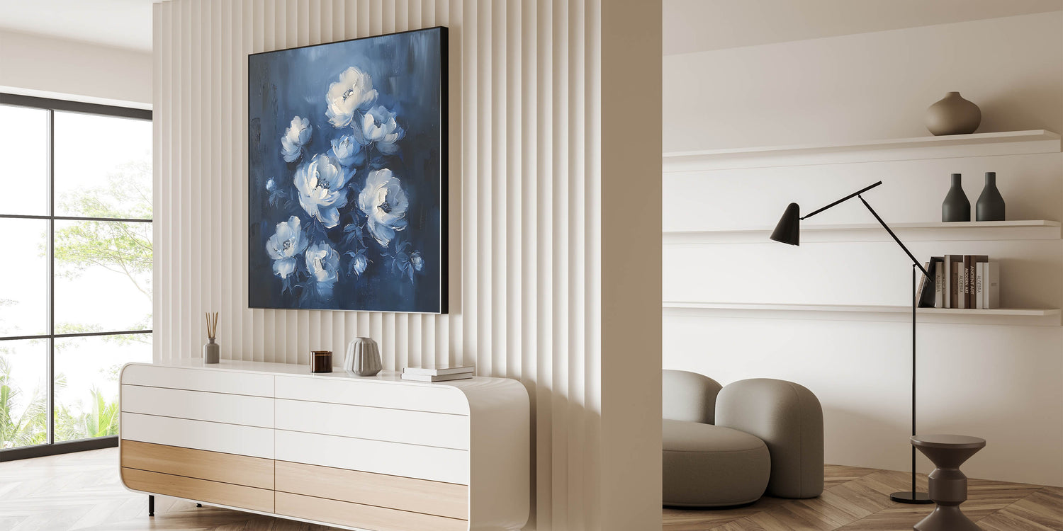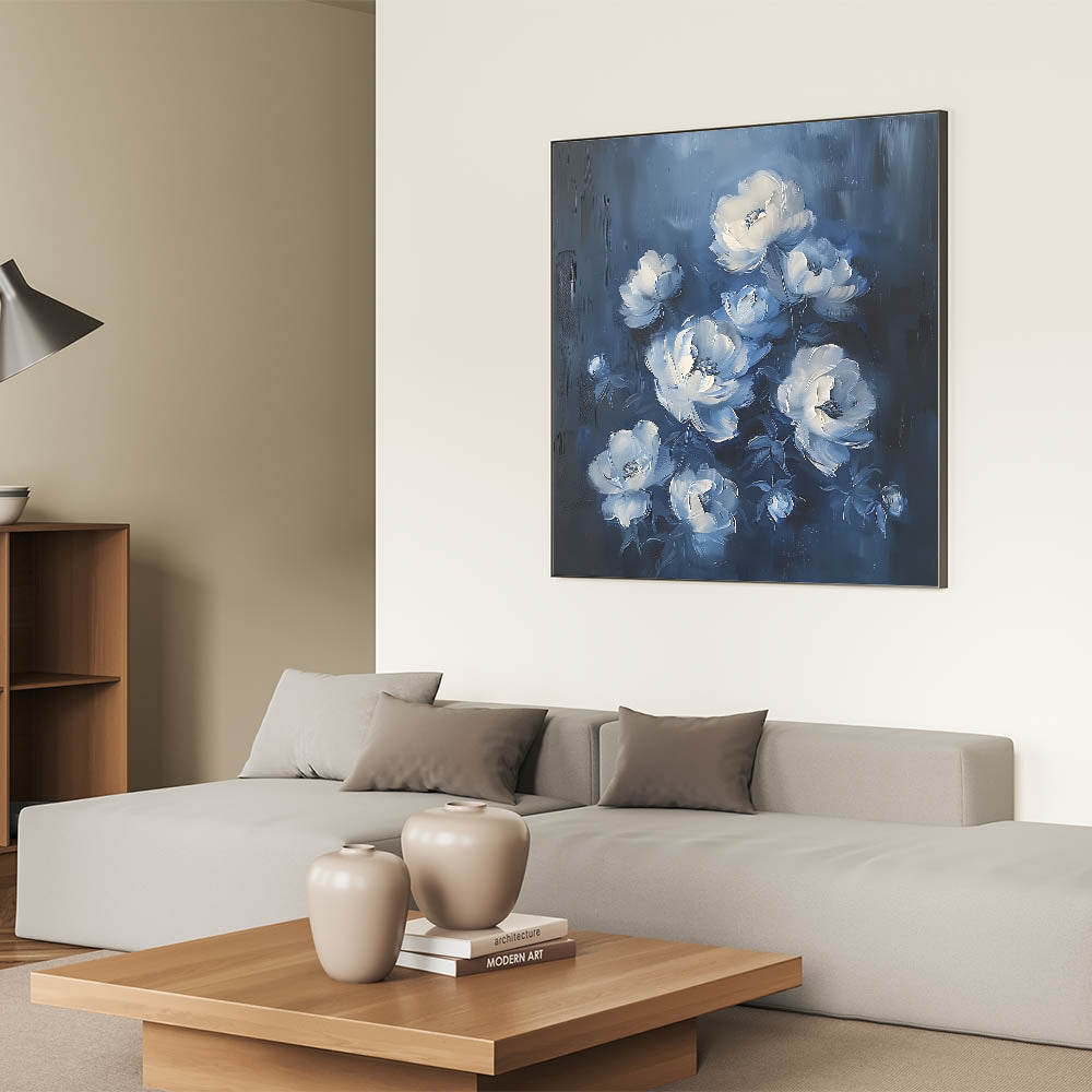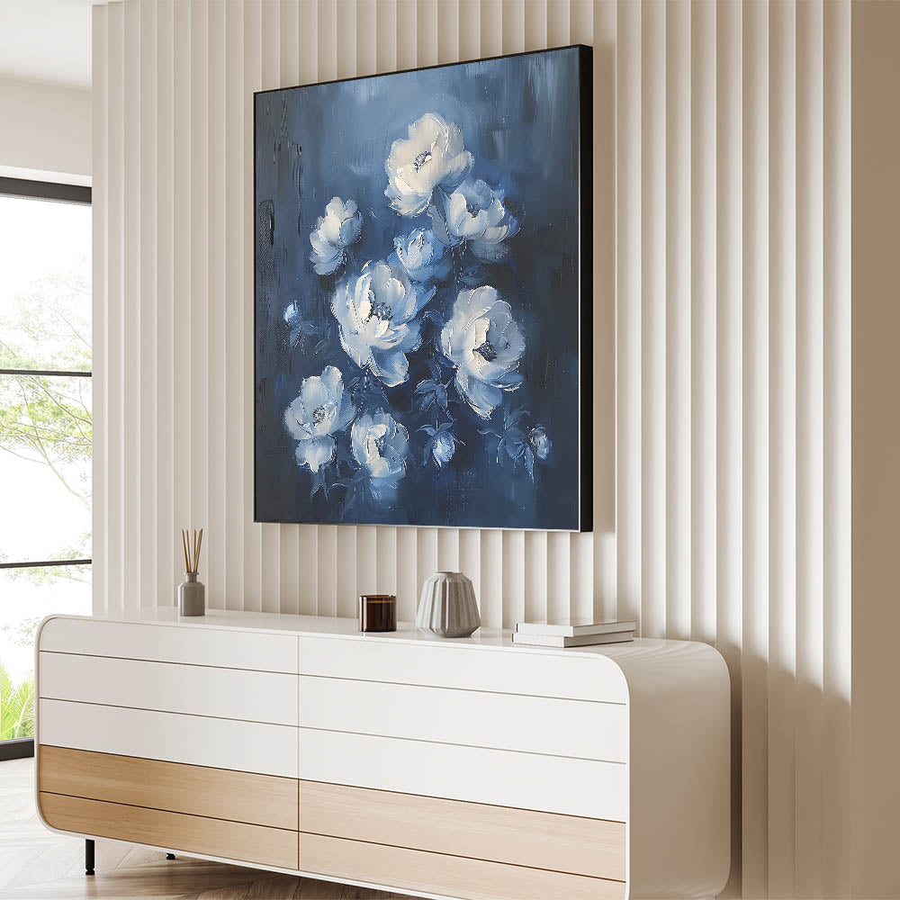 This Abstract Botanical Print captures the striking beauty of white flowers against a deep midnight blue background. The Midnight Blue Floral Canvas Art combines elegance and drama, with each bloom delicately painted to stand out against the rich, dark backdrop. Perfect for modern and contemporary spaces, this artwork adds depth and sophistication to any room.