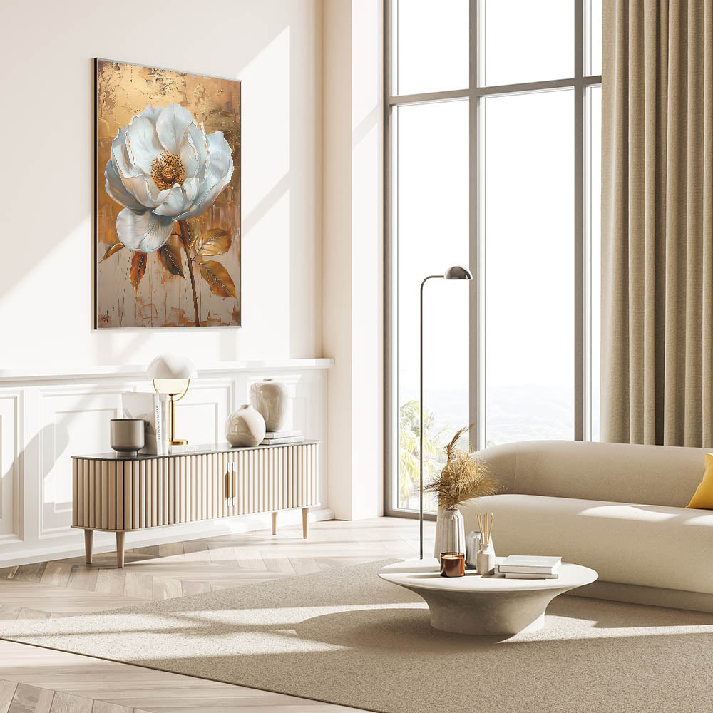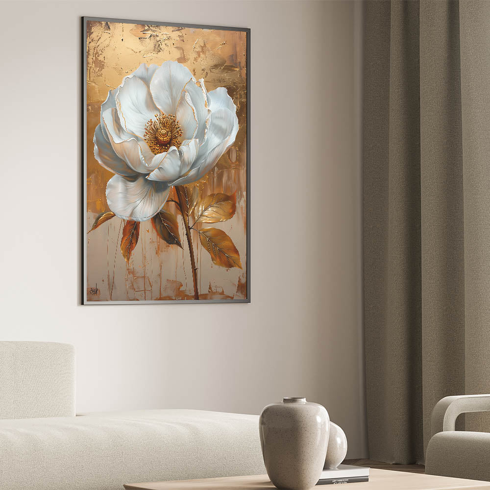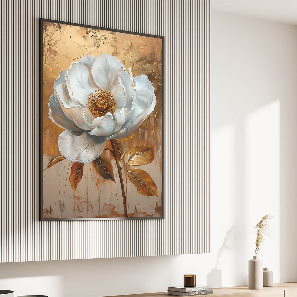 Elevate your space with this captivating piece from our Abstract Florals Collection. This artwork showcases a stunning white flower against a rich, textured gold background, merging modern elegance with nature’s beauty. Perfect for those seeking unique floral wall art, this vibrant abstract floral design brings warmth and sophistication to any room.
