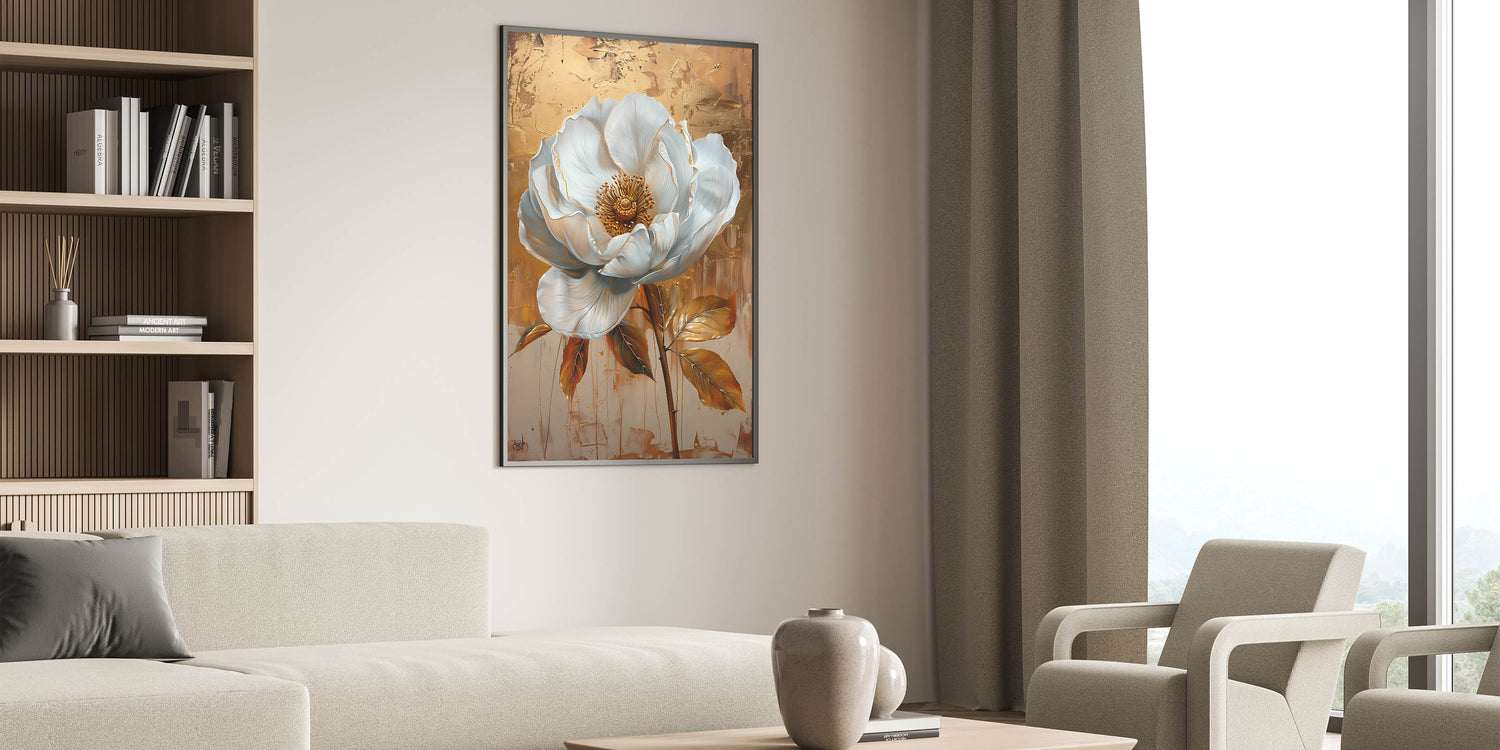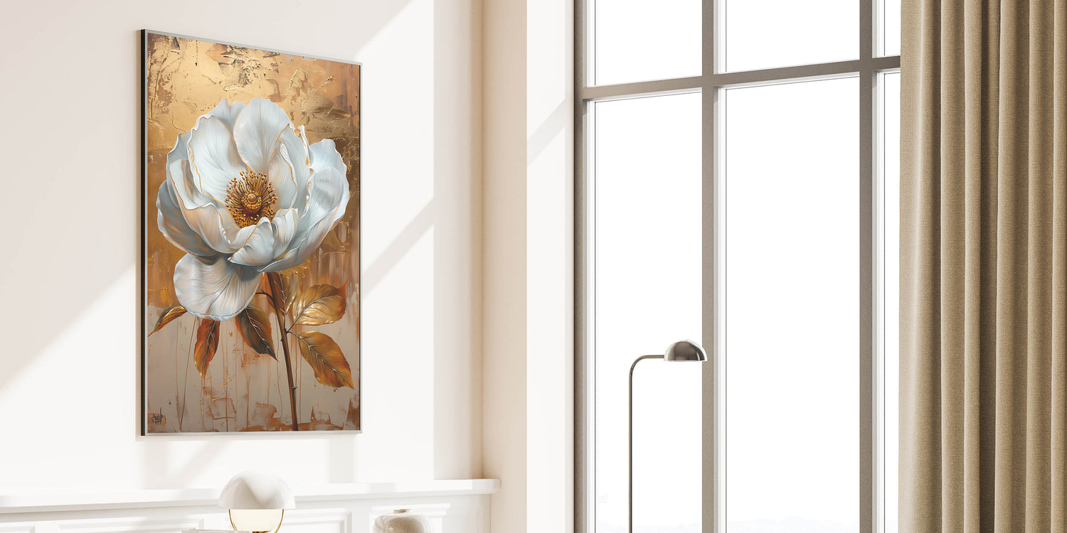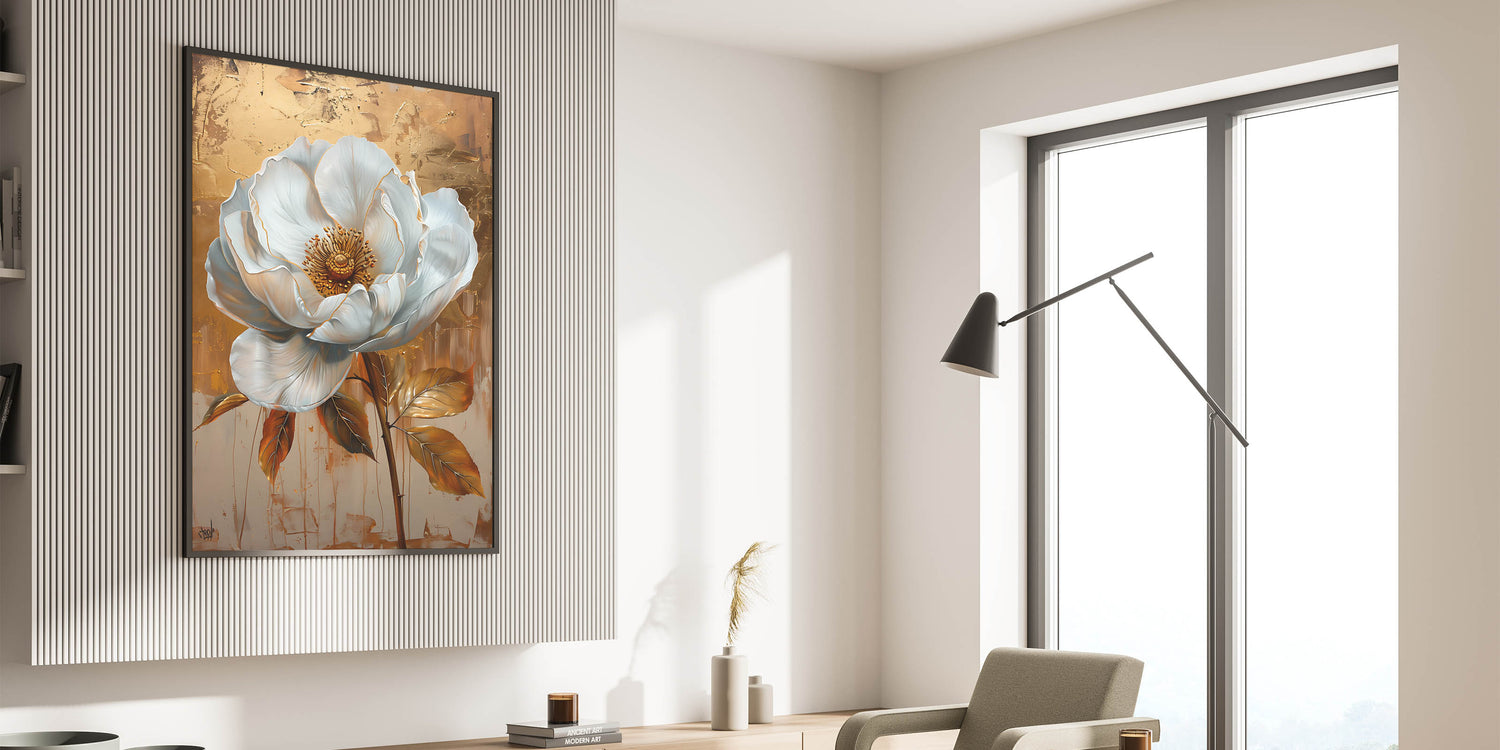 Elevate your space with this captivating piece from our Abstract Florals Collection. This artwork showcases a stunning white flower against a rich, textured gold background, merging modern elegance with nature’s beauty. Perfect for those seeking unique floral wall art, this vibrant abstract floral design brings warmth and sophistication to any room.