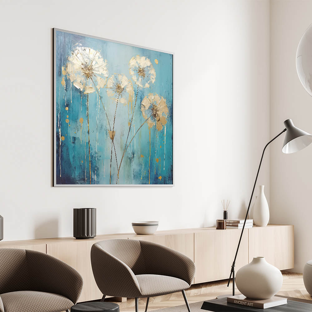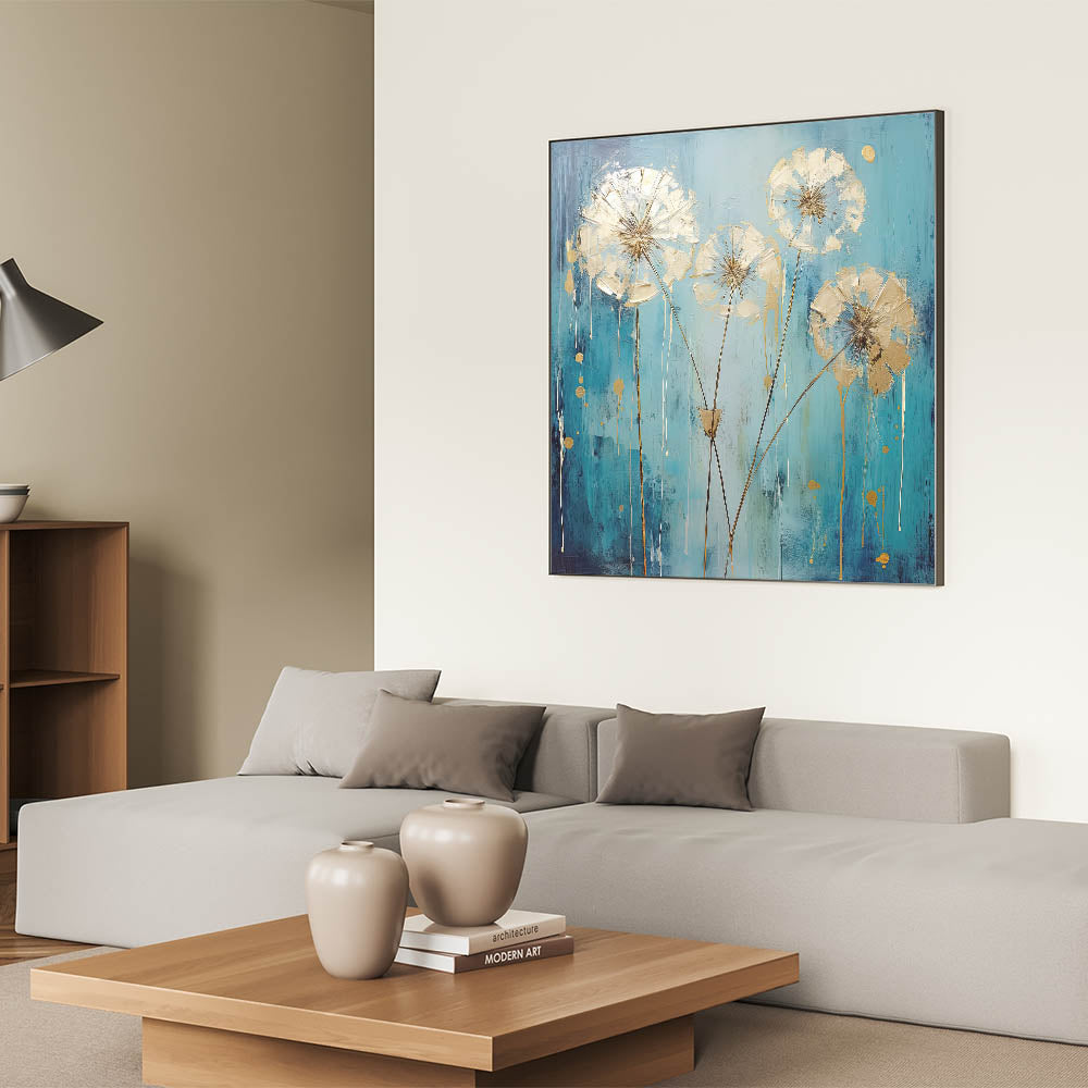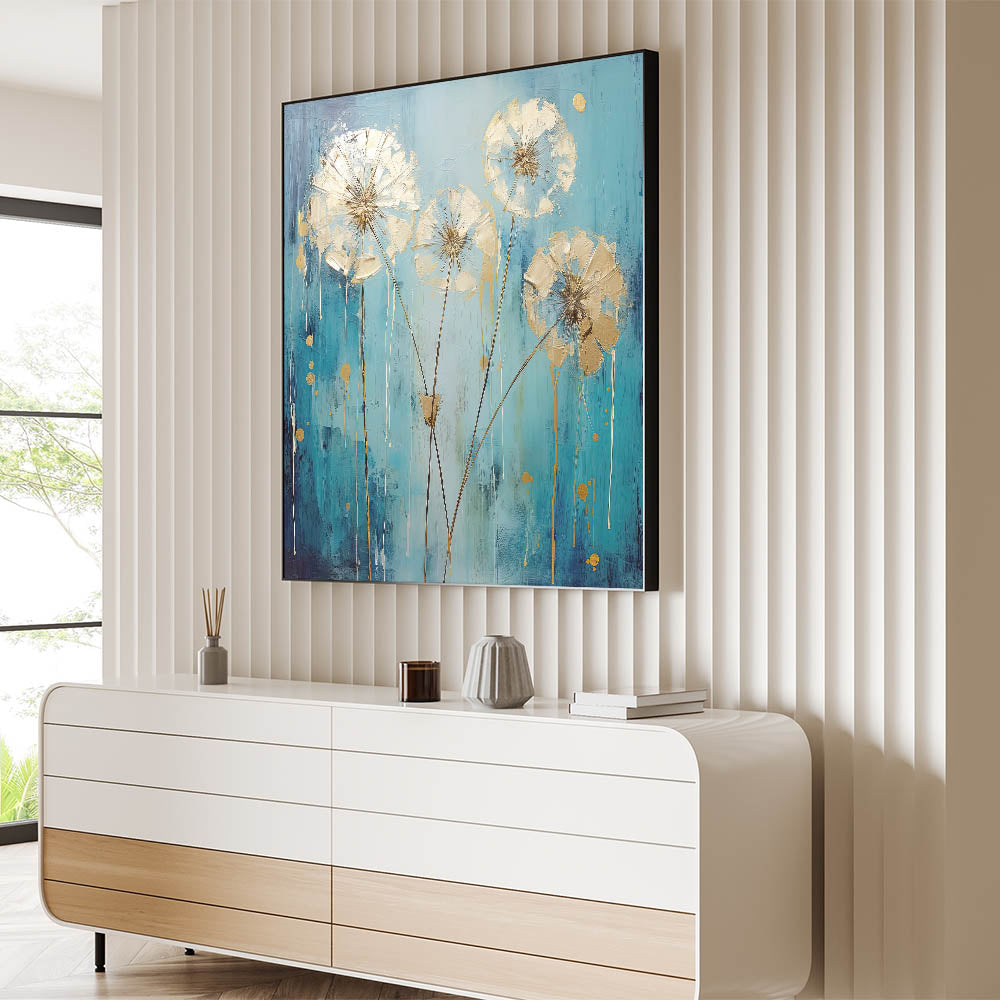 Add a touch of modern elegance to your home with this stunning abstract floral art featuring a vibrant teal flower with metallic gold accents. The bold combination of colors creates a striking contrast, while the delicate detailing of the petals adds a sense of sophistication and refinement. This artwork brings energy and luxury to any room, making it a perfect choice for contemporary or eclectic spaces.