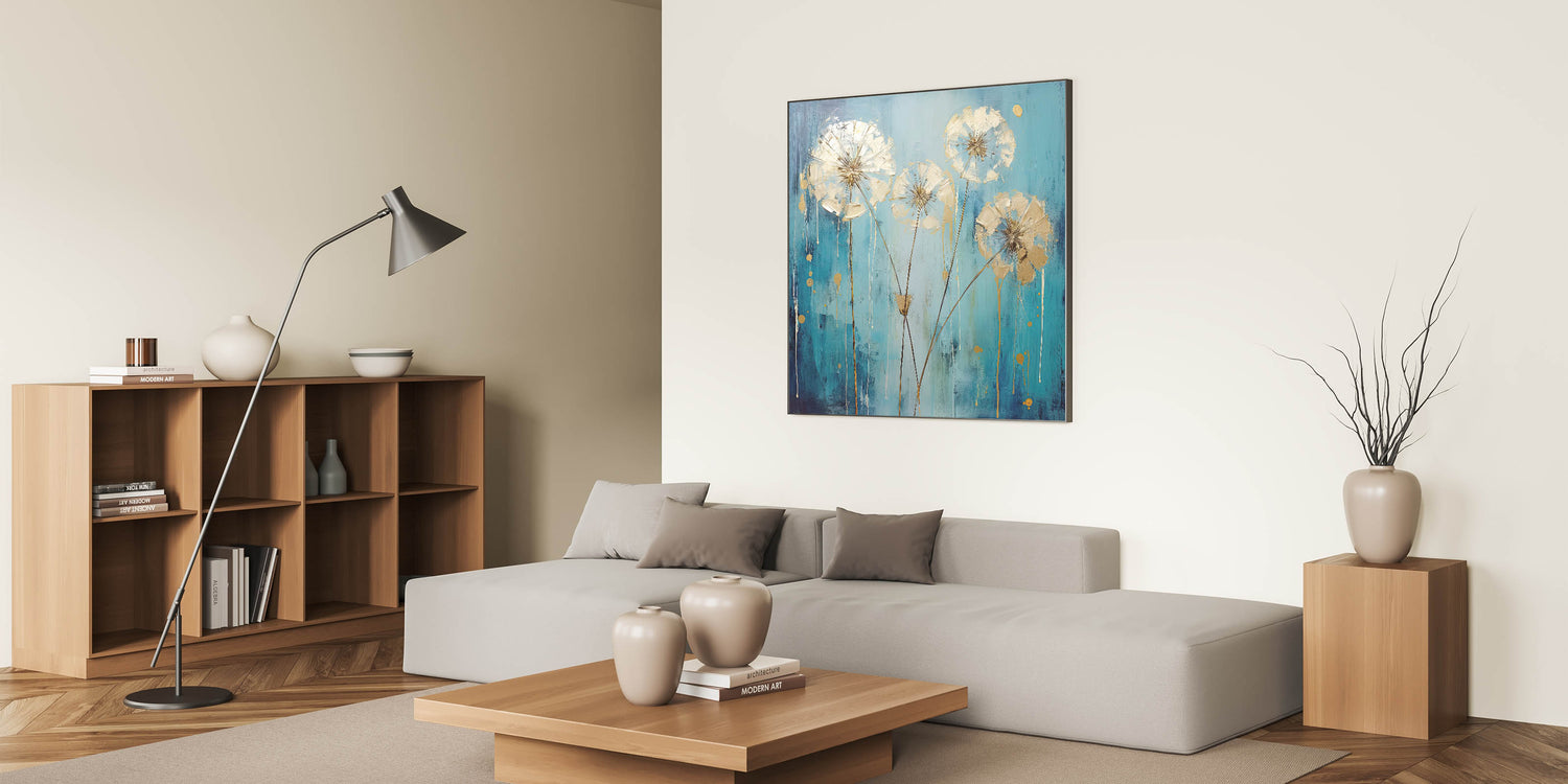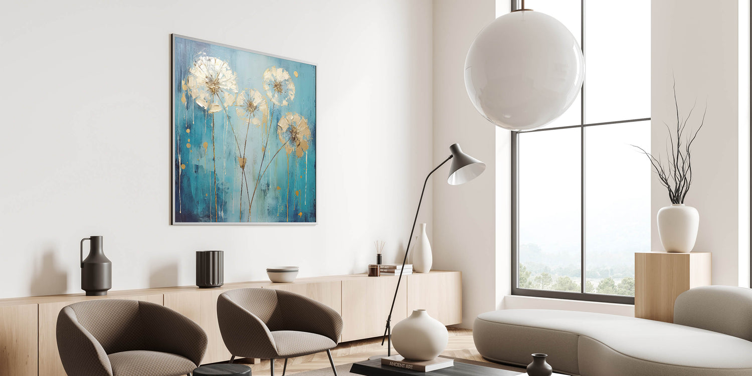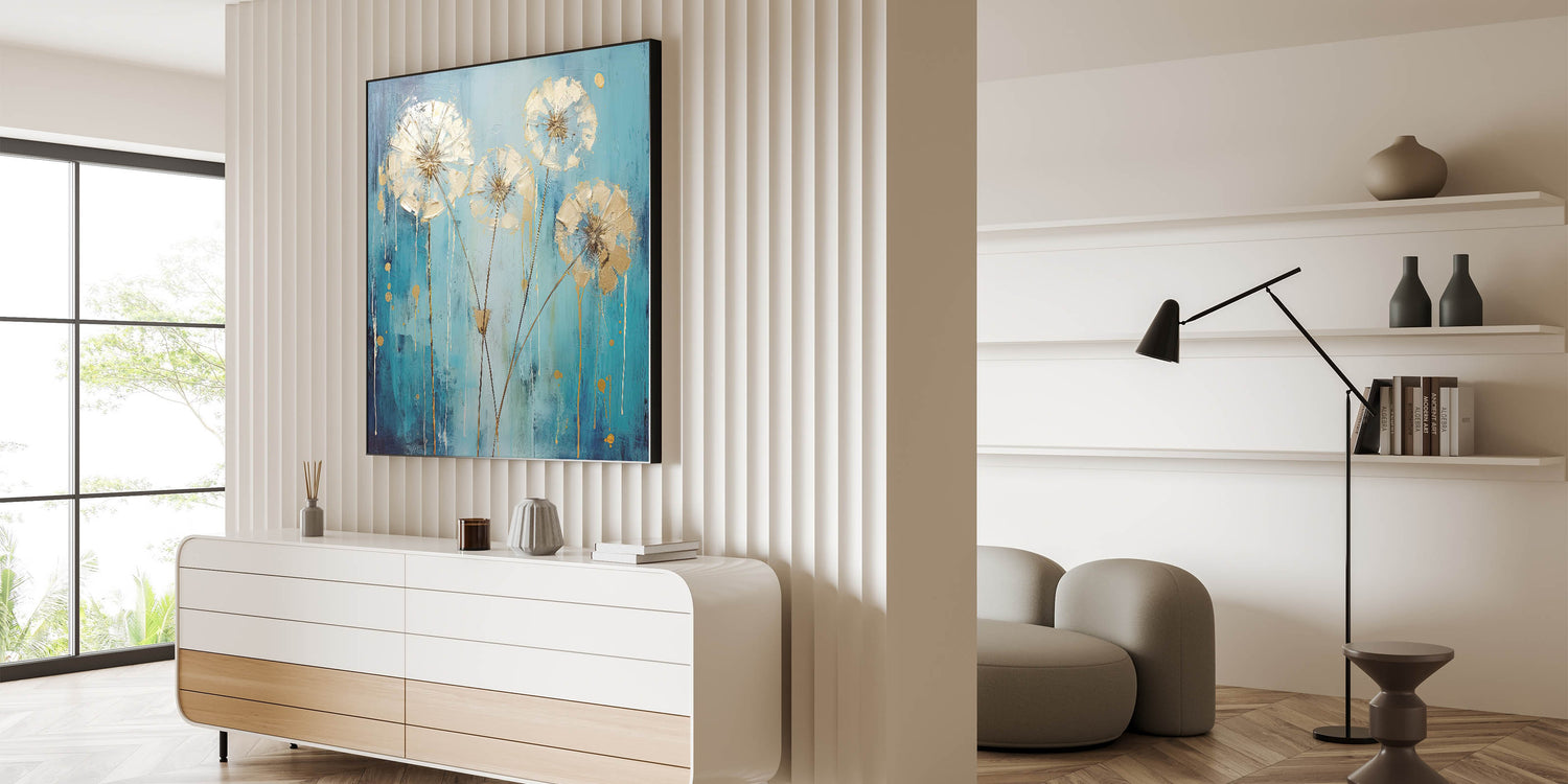 Add a touch of modern elegance to your home with this stunning abstract floral art featuring a vibrant teal flower with metallic gold accents. The bold combination of colors creates a striking contrast, while the delicate detailing of the petals adds a sense of sophistication and refinement. This artwork brings energy and luxury to any room, making it a perfect choice for contemporary or eclectic spaces.