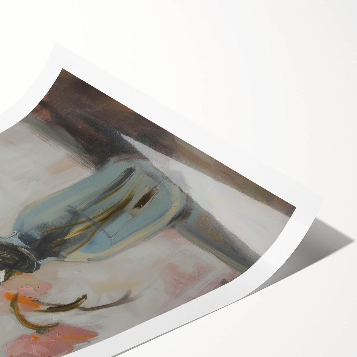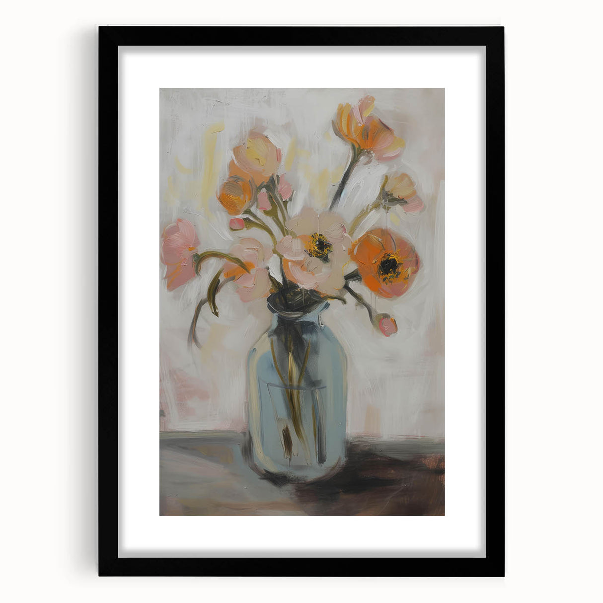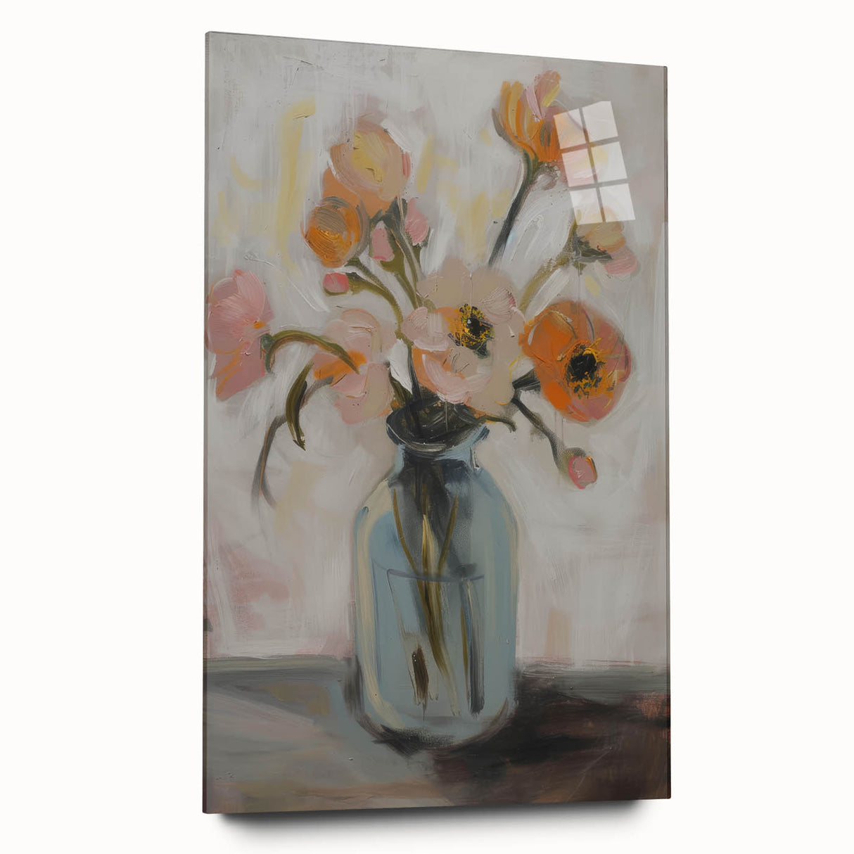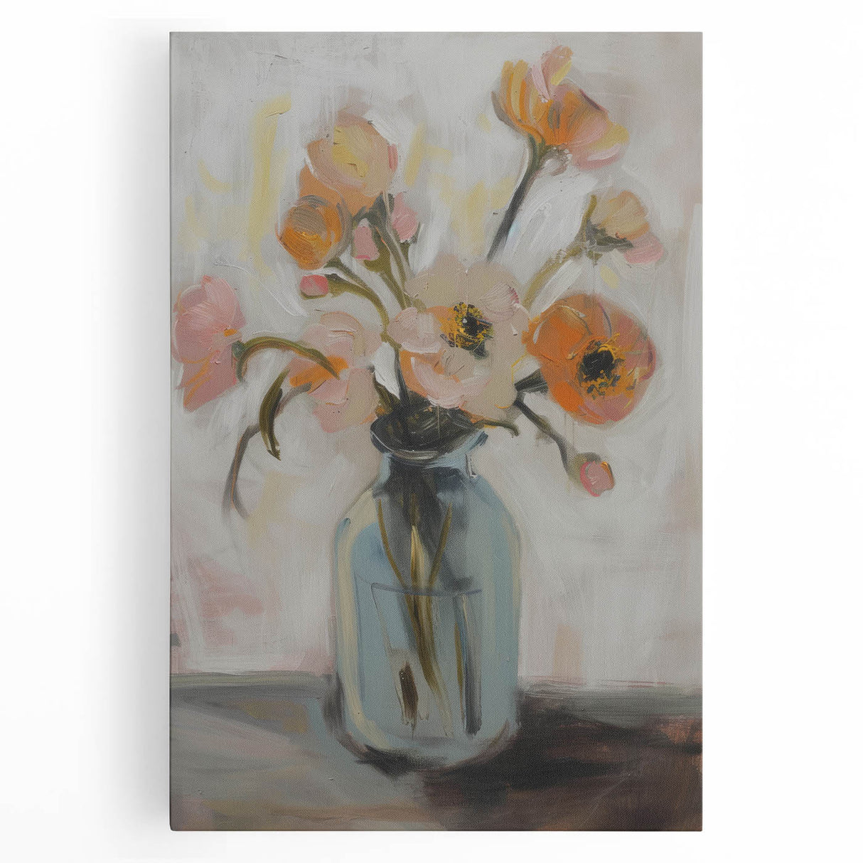 Brighten your space with this Abstract Floral Canvas, featuring a lively arrangement of orange and pink poppies set in a charming blue glass vase. The expressive brushstrokes and dynamic composition bring a sense of movement and vibrancy to the artwork, making it a captivating addition to any room.
