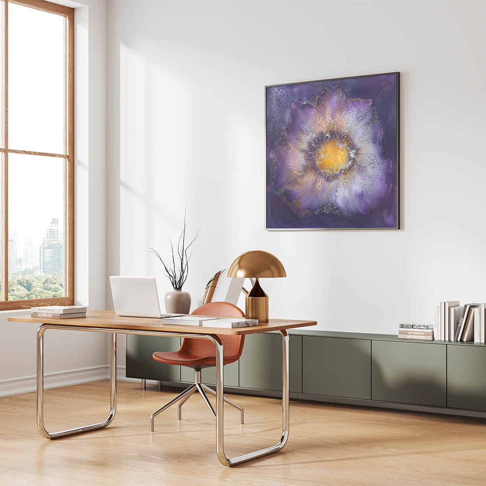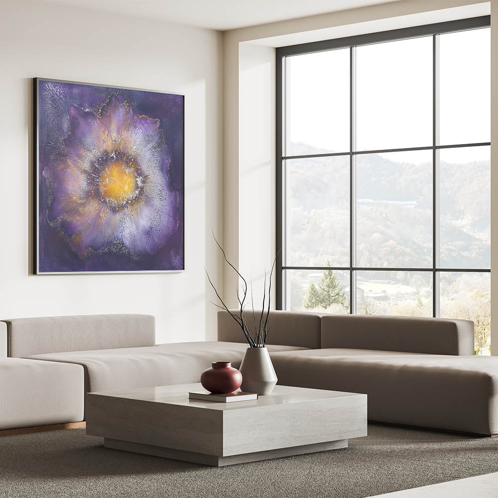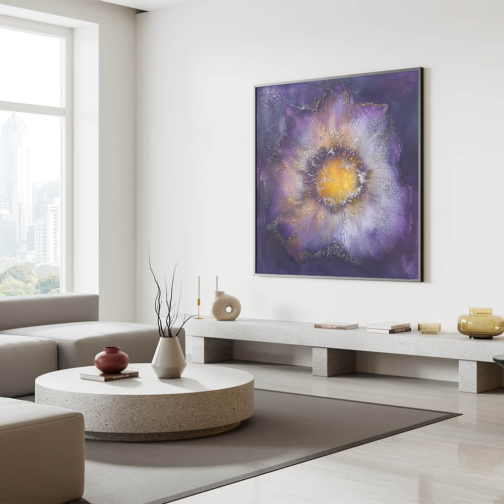 Bring elegance and vibrancy to your space with this stunning abstract floral minimalist artwork. Featuring a captivating purple bloom with intricate textures and a radiant golden center, this piece exudes sophistication and charm. The delicate interplay of rich purple tones, soft whites, and glowing gold adds depth and character to any modern or transitional interior.