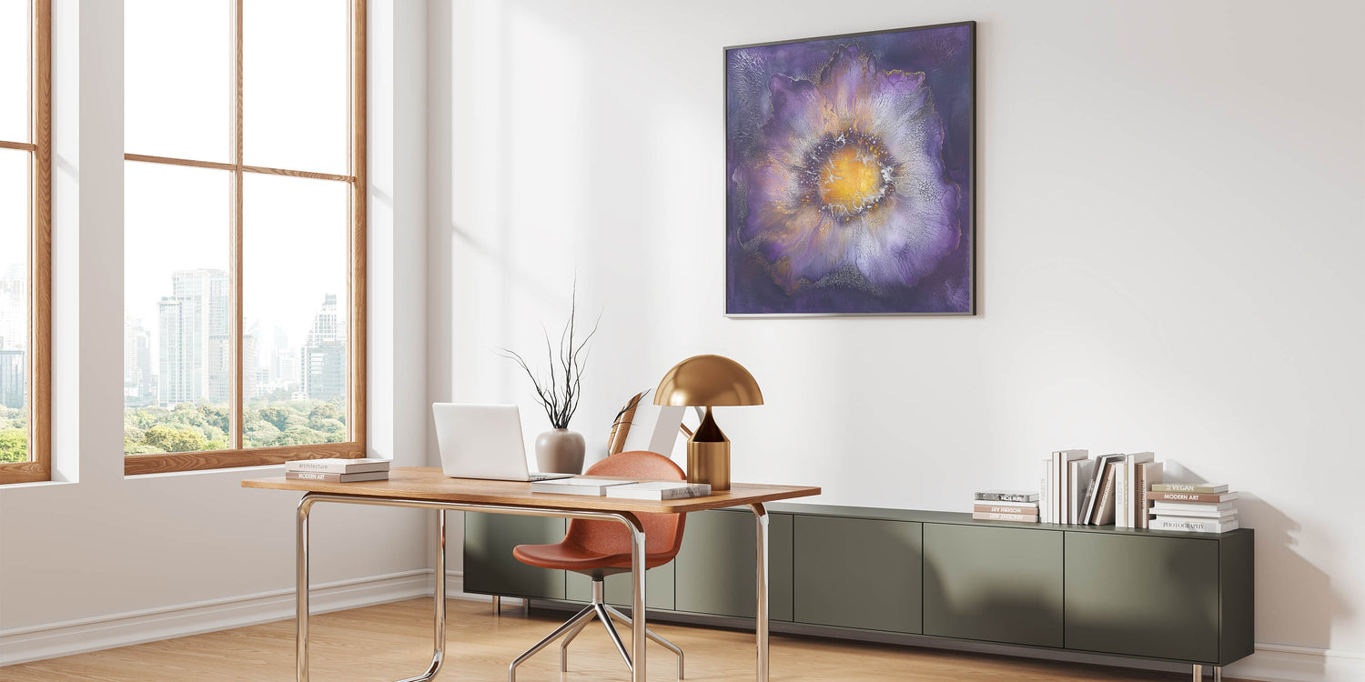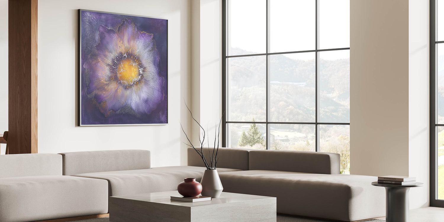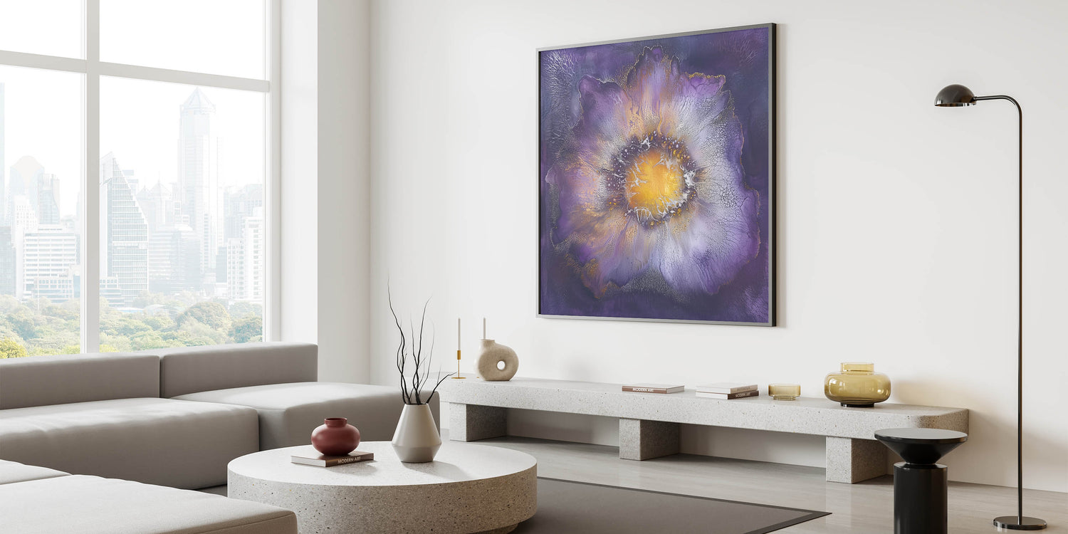 Bring elegance and vibrancy to your space with this stunning abstract floral minimalist artwork. Featuring a captivating purple bloom with intricate textures and a radiant golden center, this piece exudes sophistication and charm. The delicate interplay of rich purple tones, soft whites, and glowing gold adds depth and character to any modern or transitional interior.