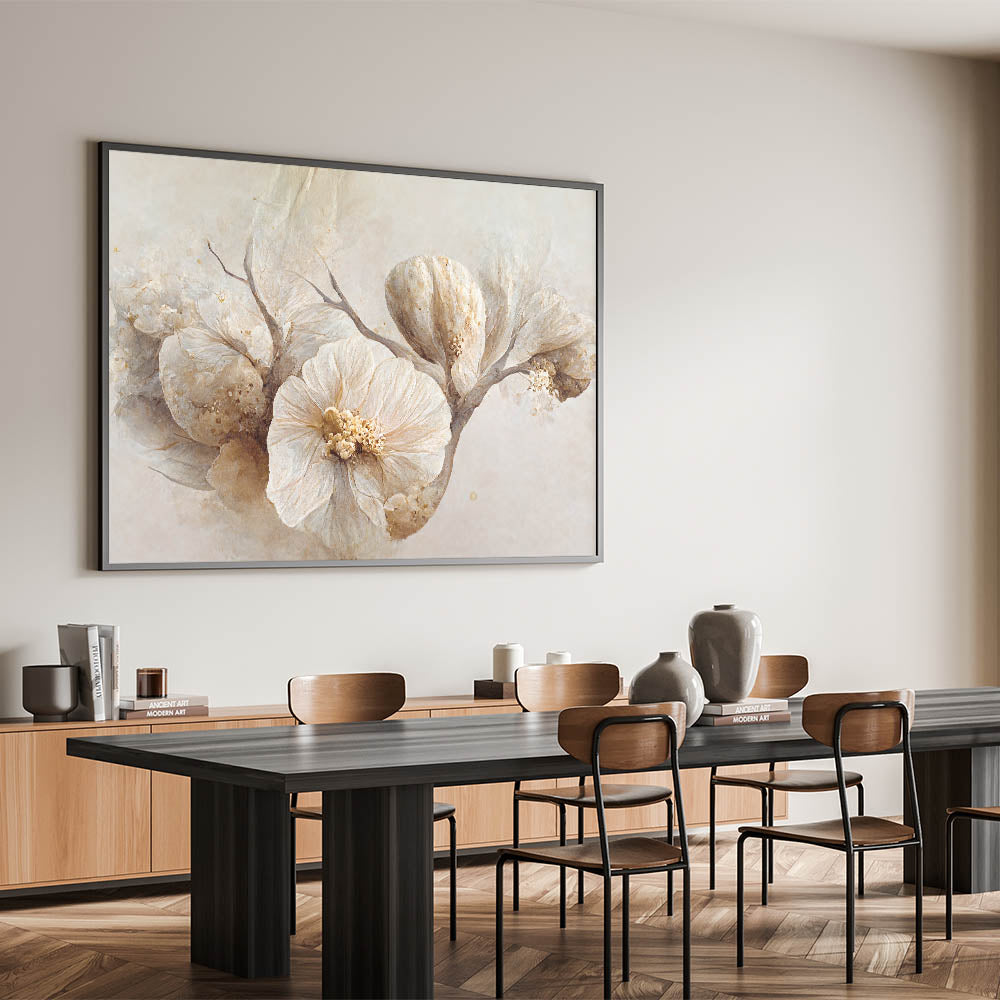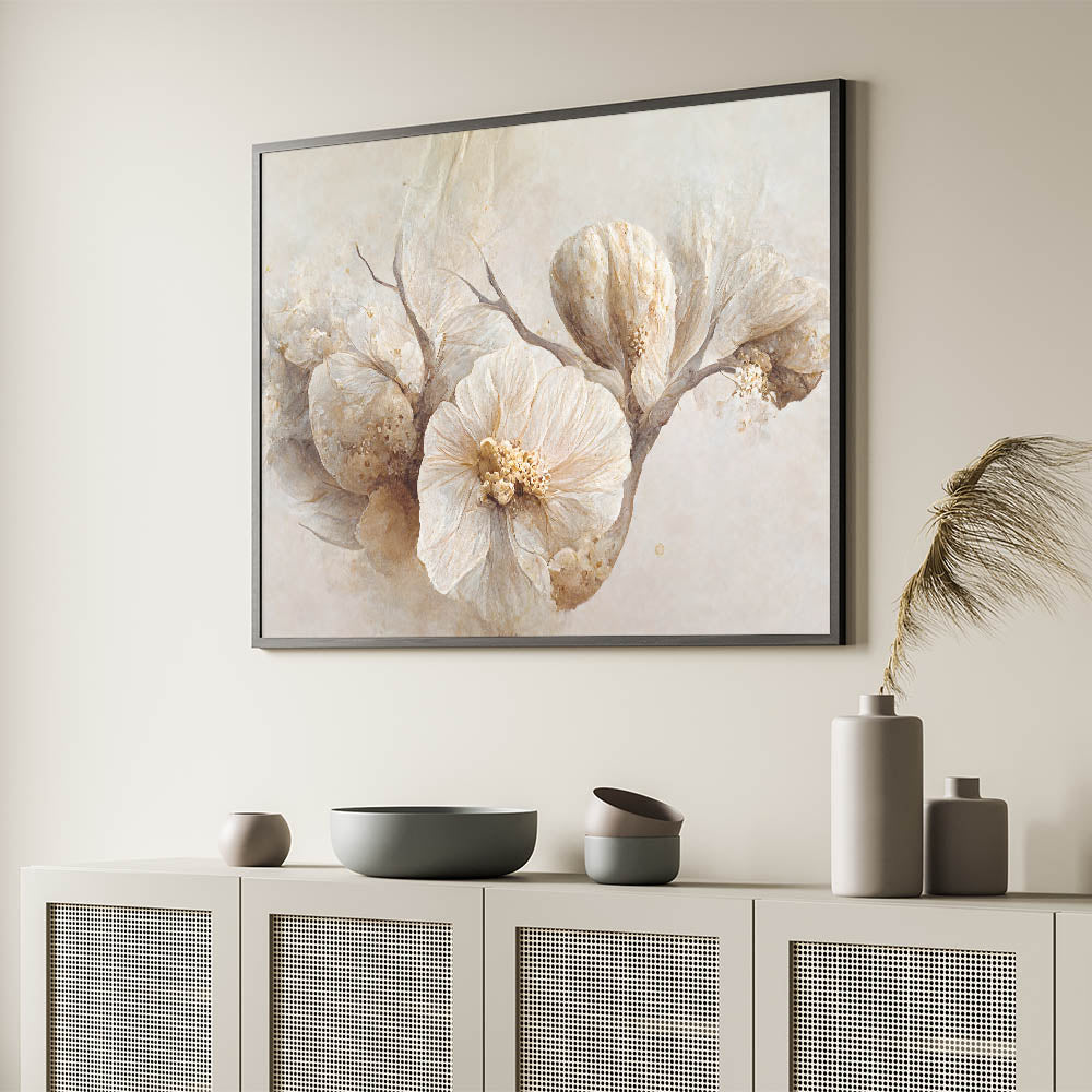 Elevate your decor with this stunning abstract floral wall art, showcasing a collection of neutral-toned, textured blossoms. This artwork combines soft beige and cream hues with a captivating texture that brings a sense of natural beauty and elegance to any space. The intricate petal details and organic composition make it an ideal piece for those seeking a calm and refined aesthetic.
