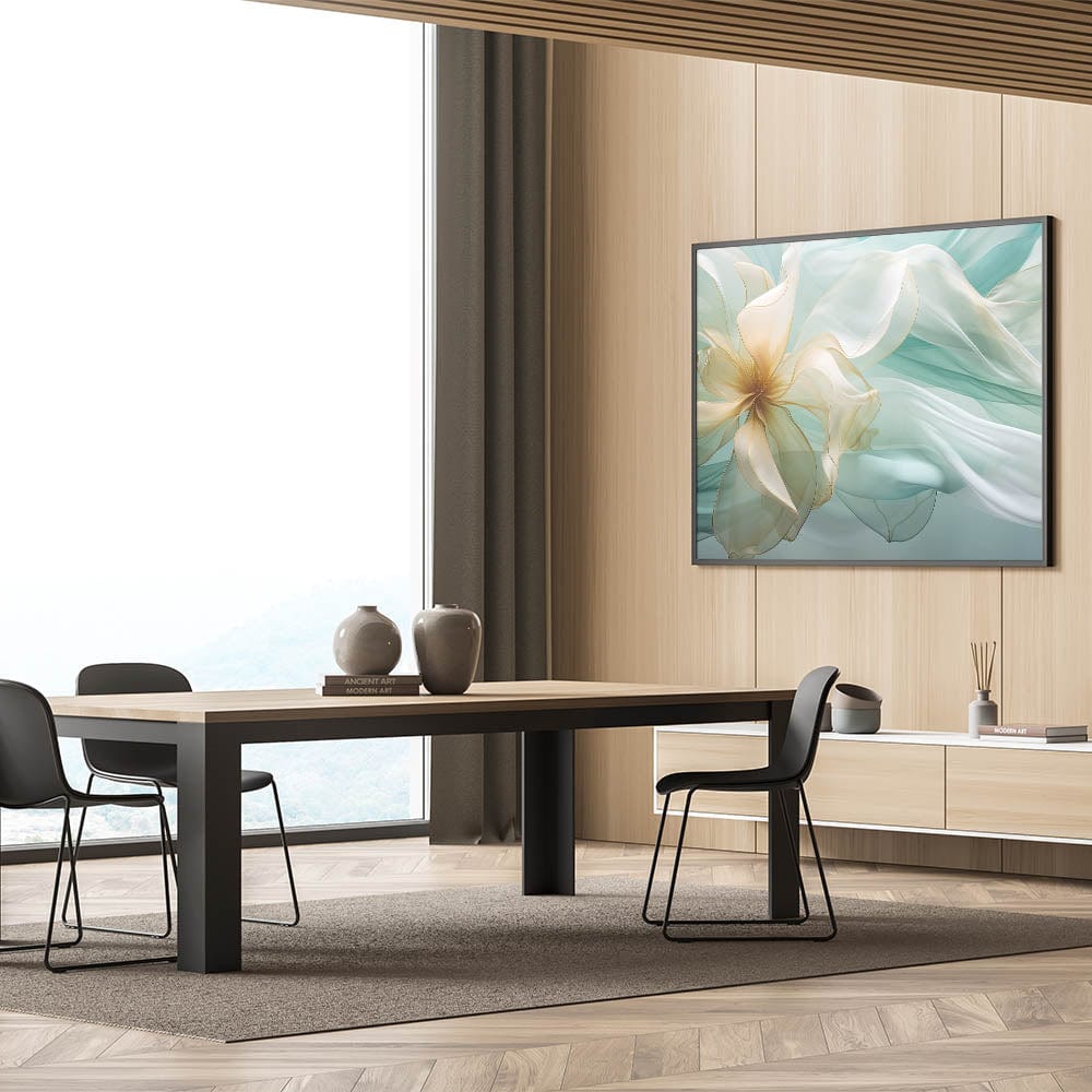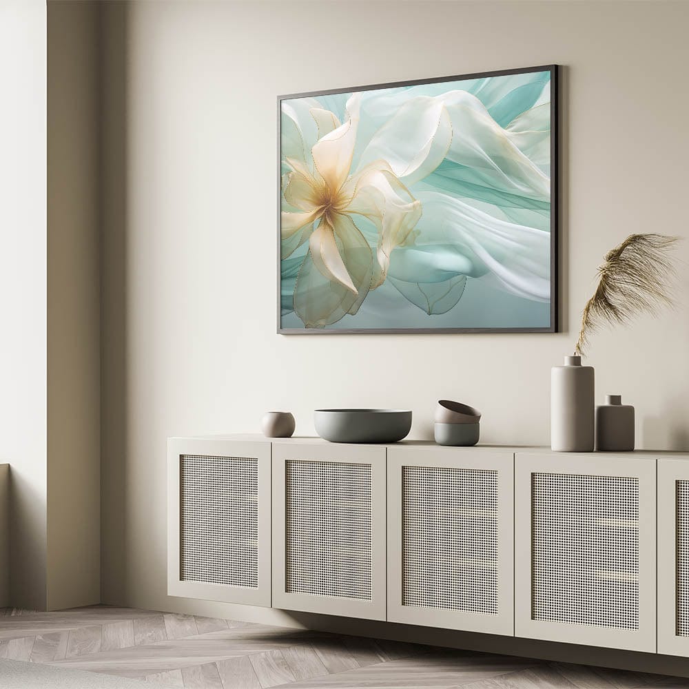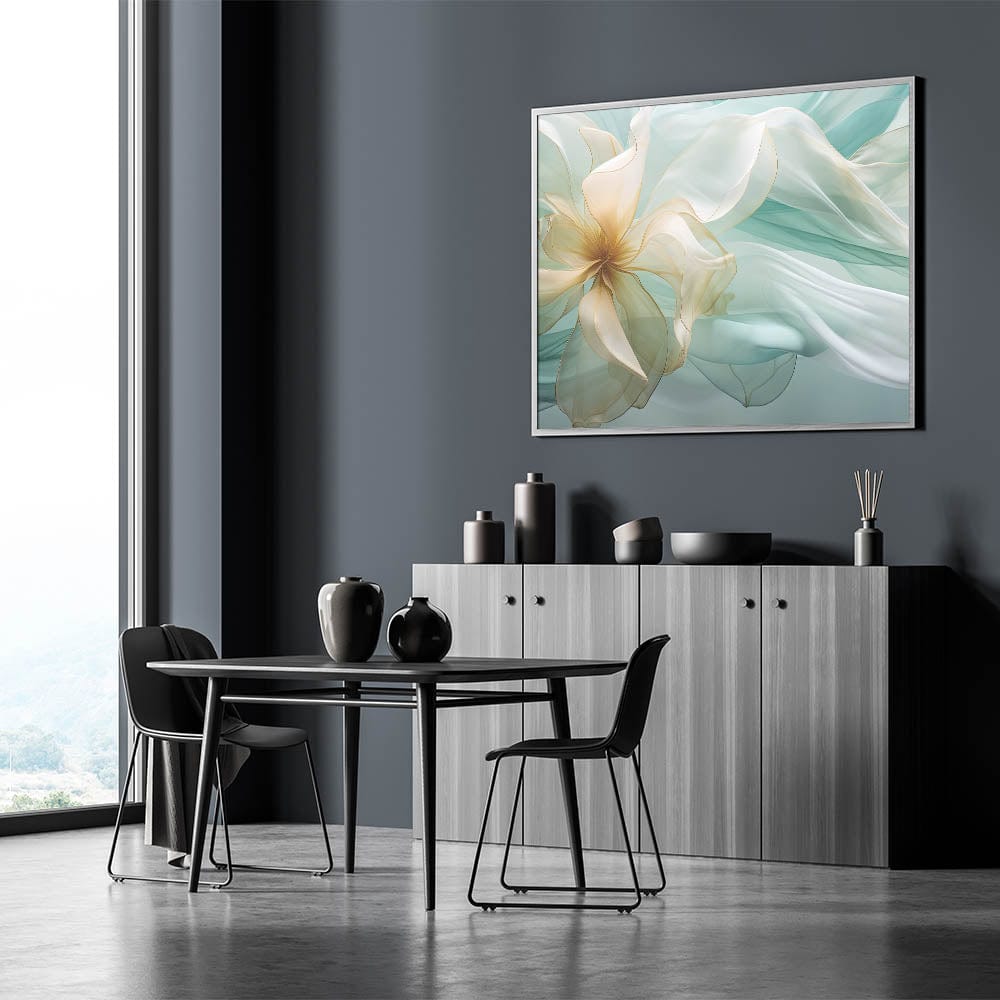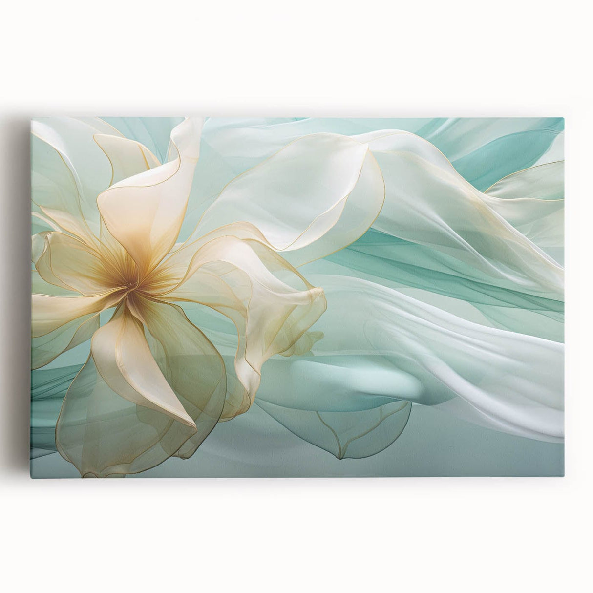 Elevate your space with the soft elegance of this abstract fluid canvas art. Featuring a delicate fusion of mint green, light teal, and warm beige, this piece flows like silk in the wind, creating a dreamy and calming effect. The organic movement and airy tones make it a perfect addition to modern and minimalist interiors.