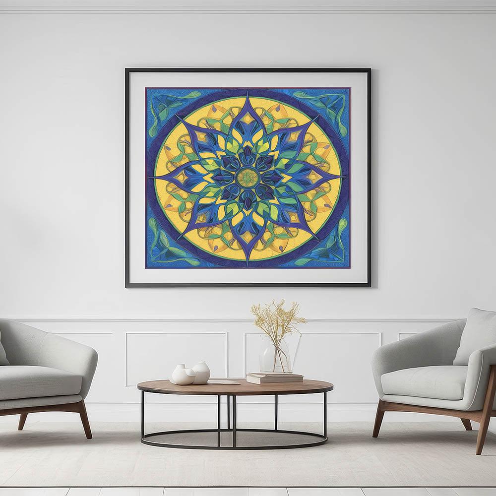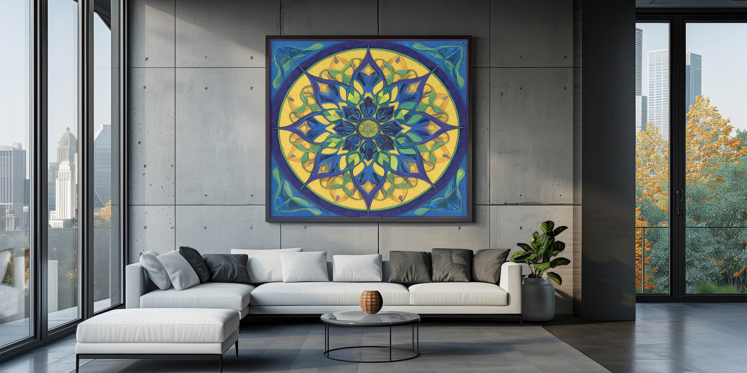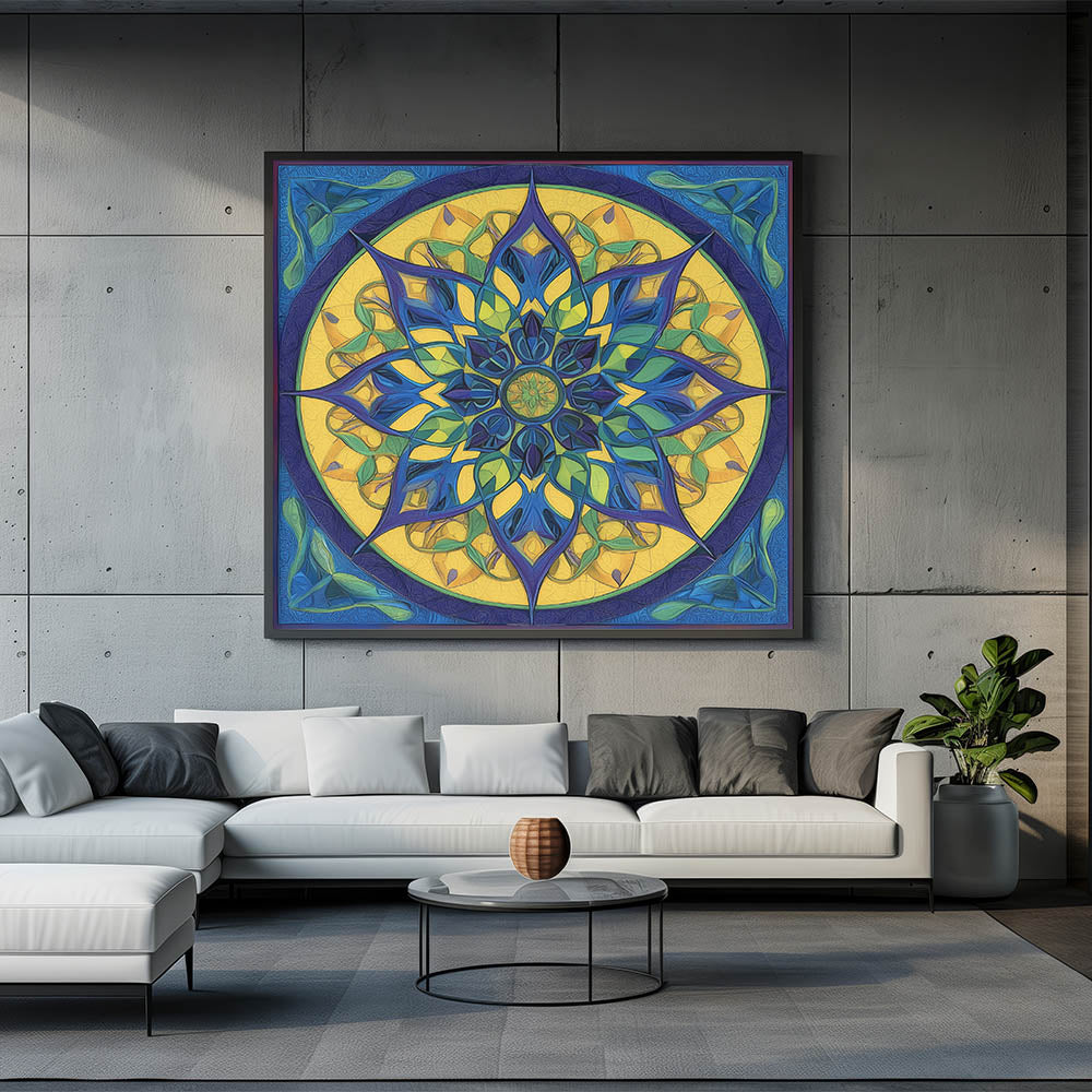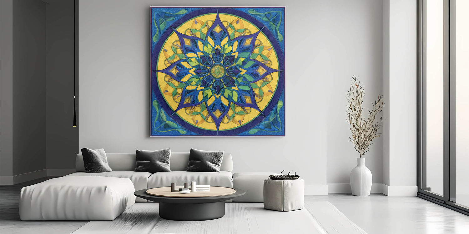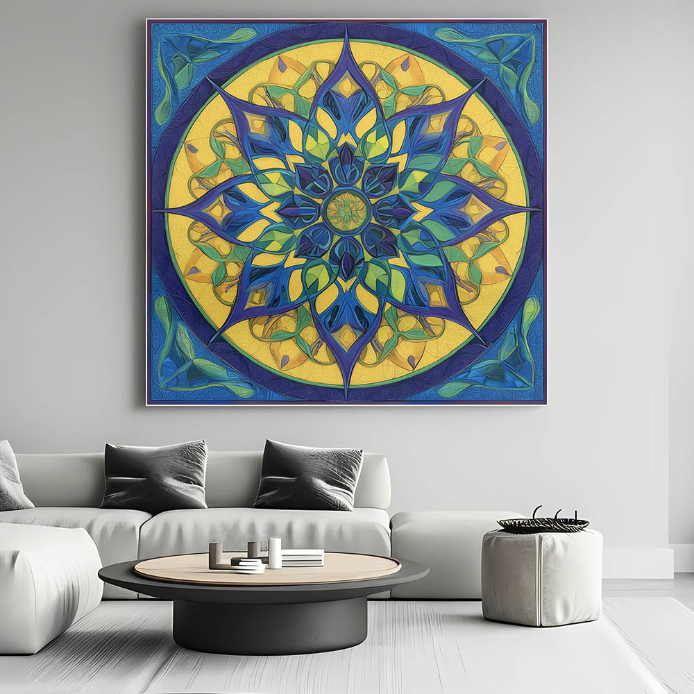 This geometric shapes artwork combines abstract art for living rooms with timeless mandala symmetry, making it an exceptional centerpiece for your walls. Its rich palette of blue, yellow, and green creates a dynamic yet elegant atmosphere, perfect for any contemporary space.