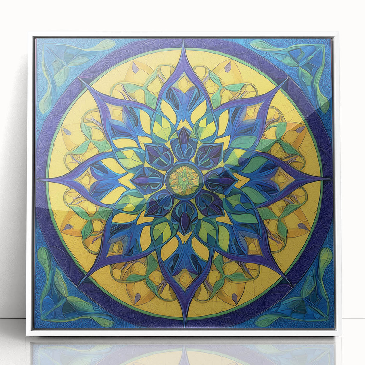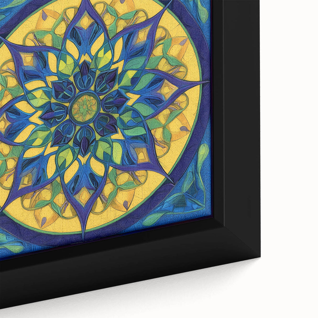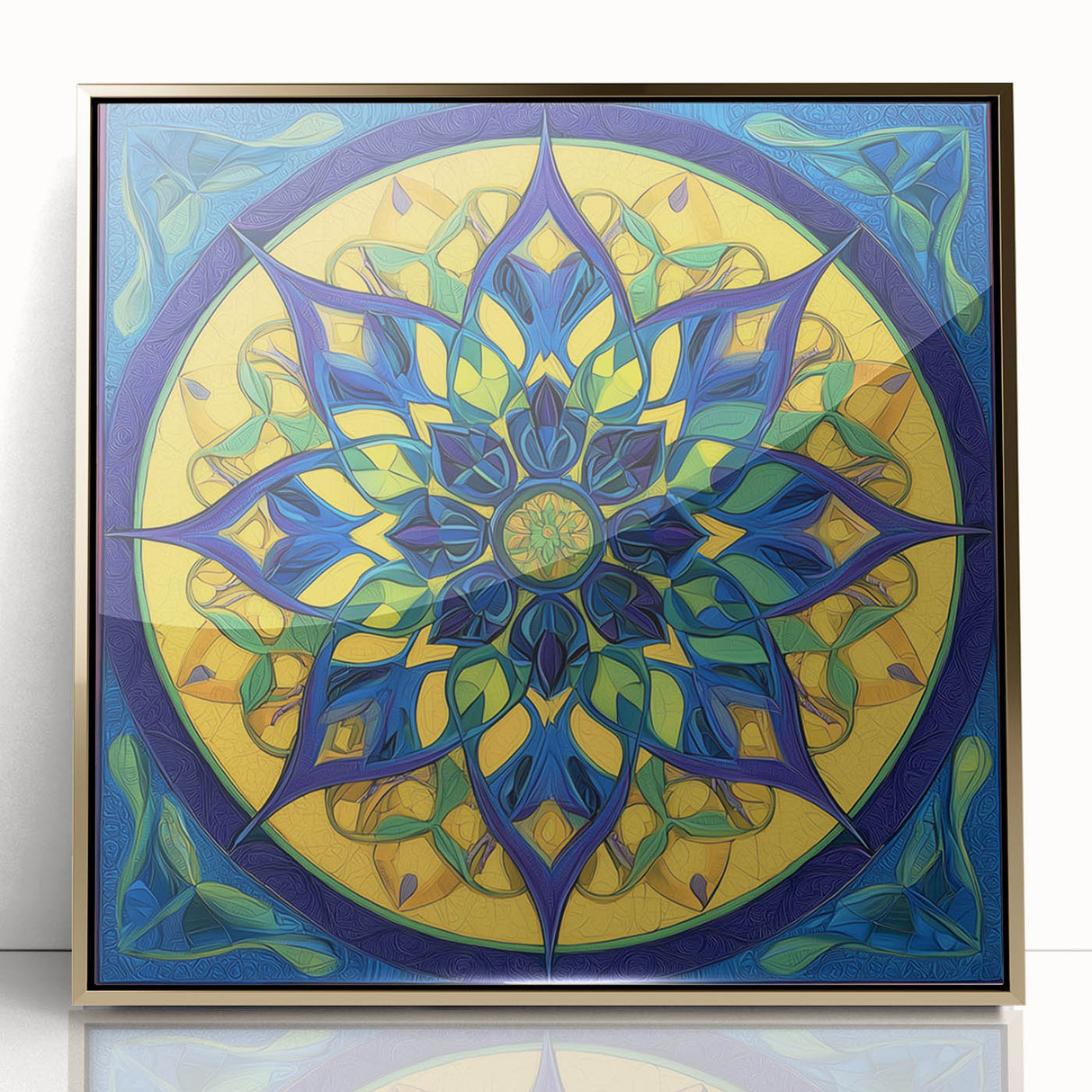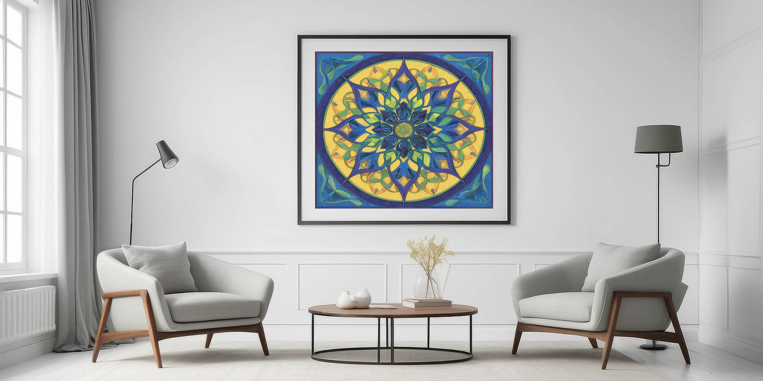 This geometric shapes artwork combines abstract art for living rooms with timeless mandala symmetry, making it an exceptional centerpiece for your walls. Its rich palette of blue, yellow, and green creates a dynamic yet elegant atmosphere, perfect for any contemporary space.