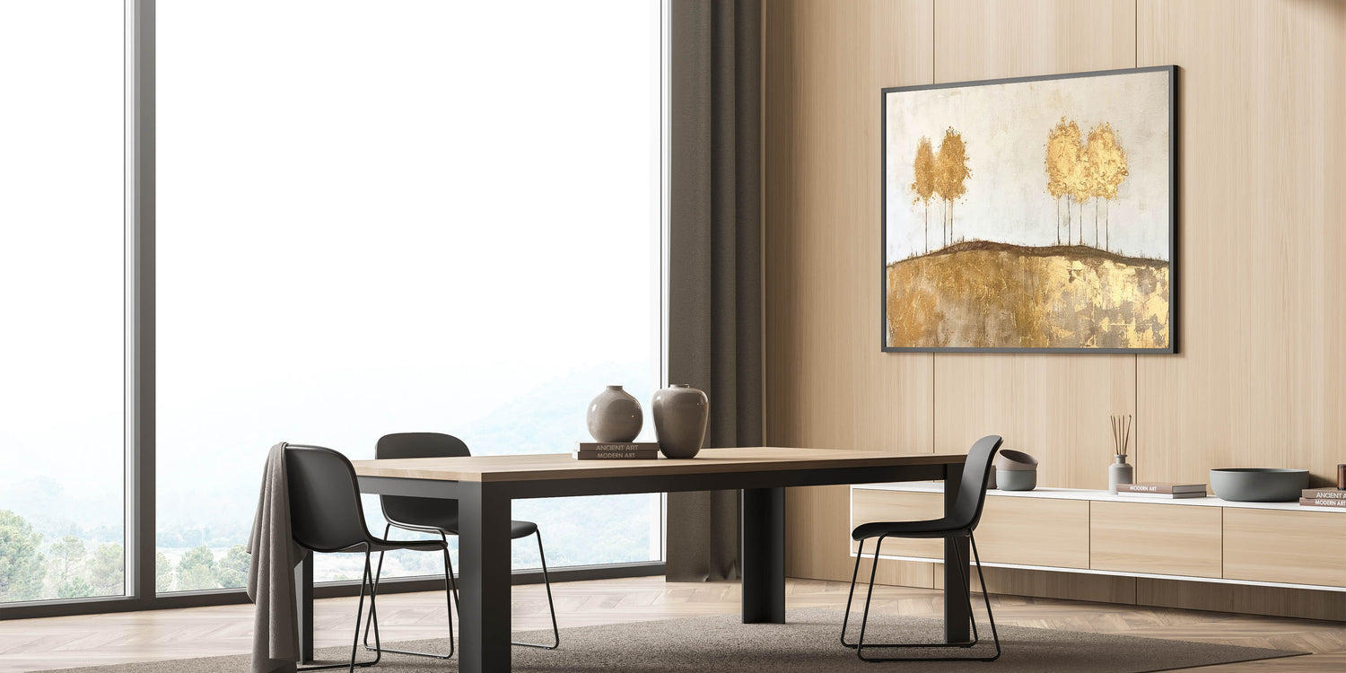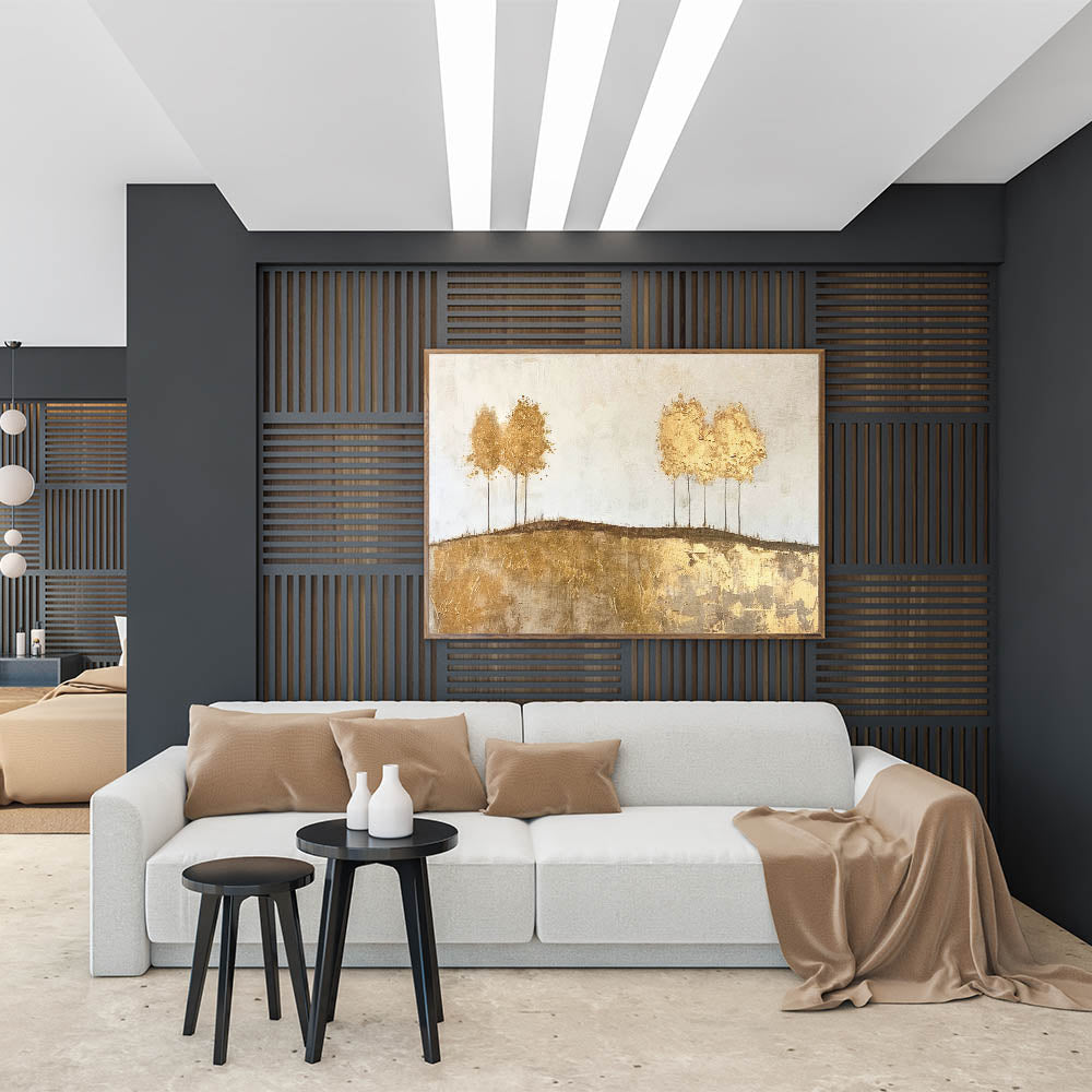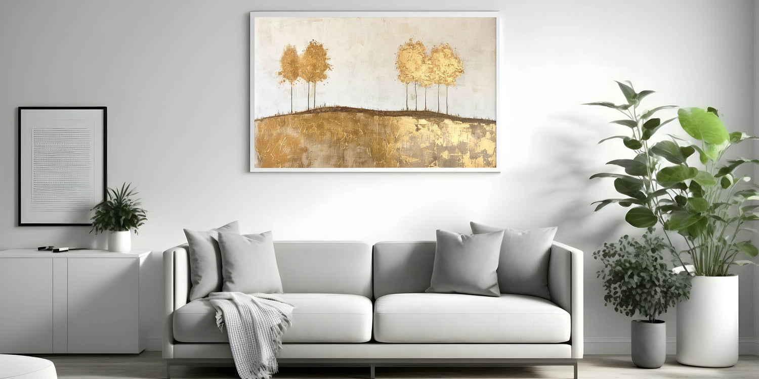 - Warm & Elegant Design: Golden trees against an earthy landscape create a sophisticated, minimalist aesthetic.