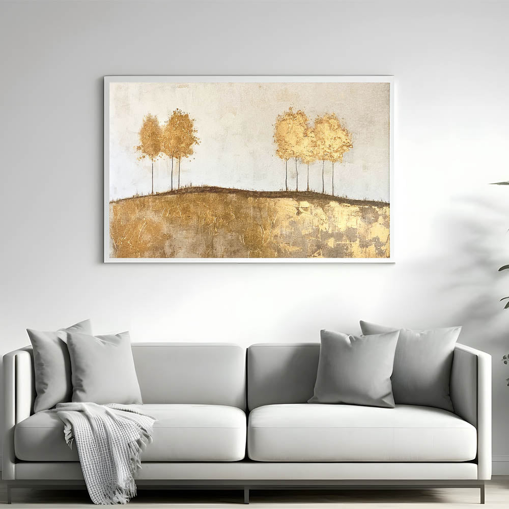 Introduce a warm, minimalist touch to your decor with this abstract landscape artwork, featuring golden trees standing on a textured, earthy hill. The simplicity of the design, with its soft beige and rich golden tones, evokes a peaceful and elegant scene, perfect for those who appreciate understated beauty in their home decor. Ideal for living rooms, bedrooms, and office spaces, this piece adds a refined yet cozy atmosphere.