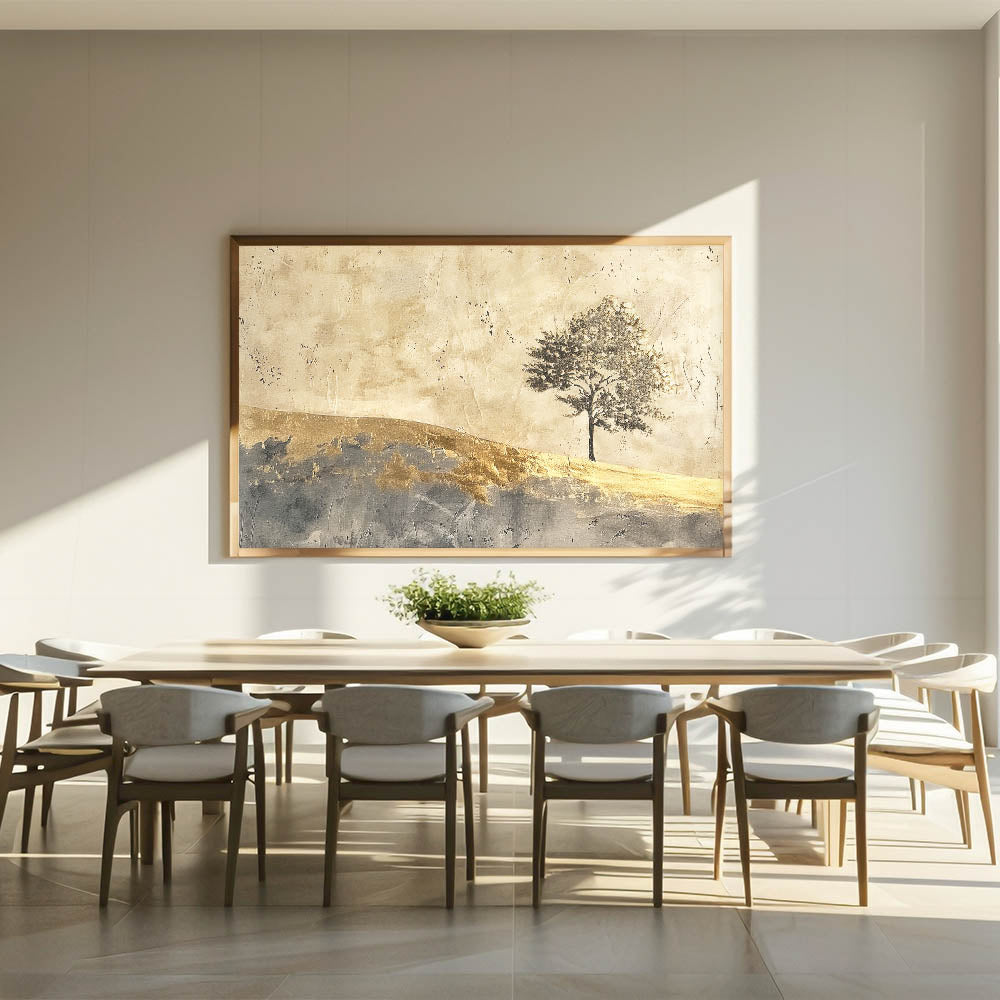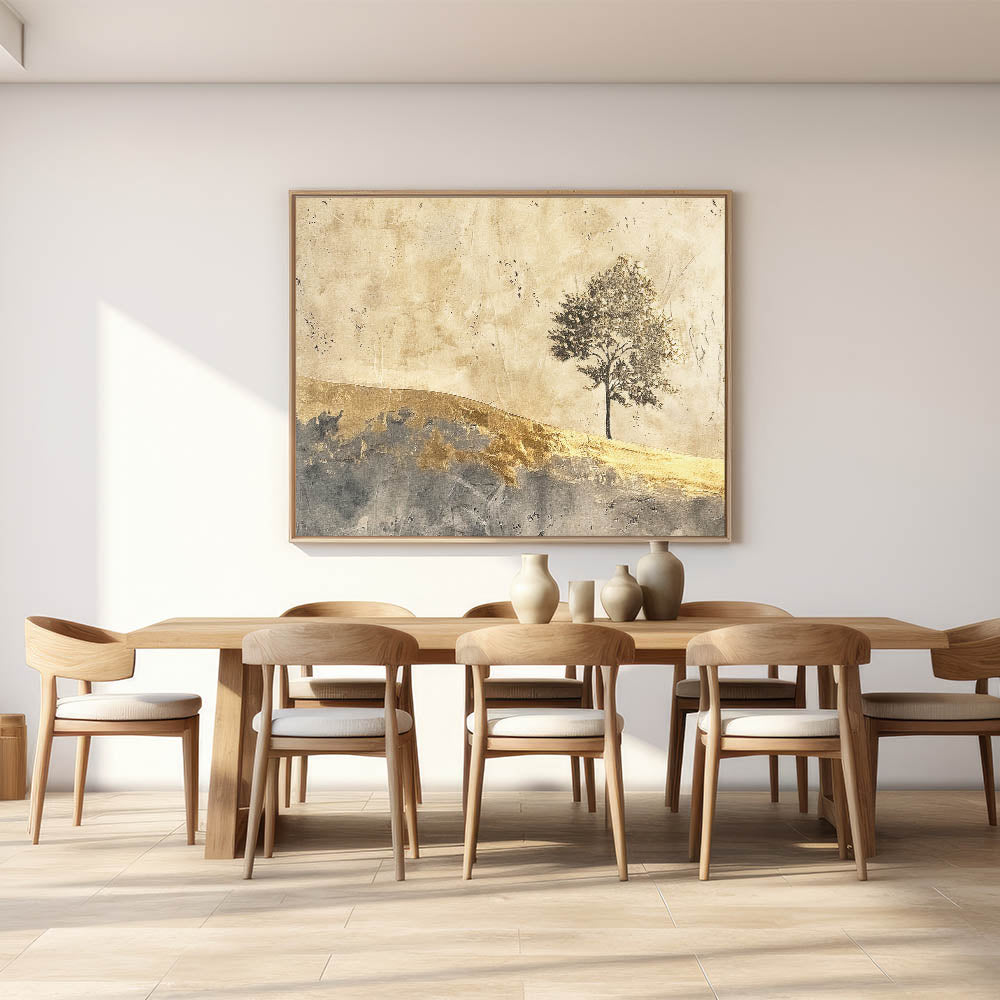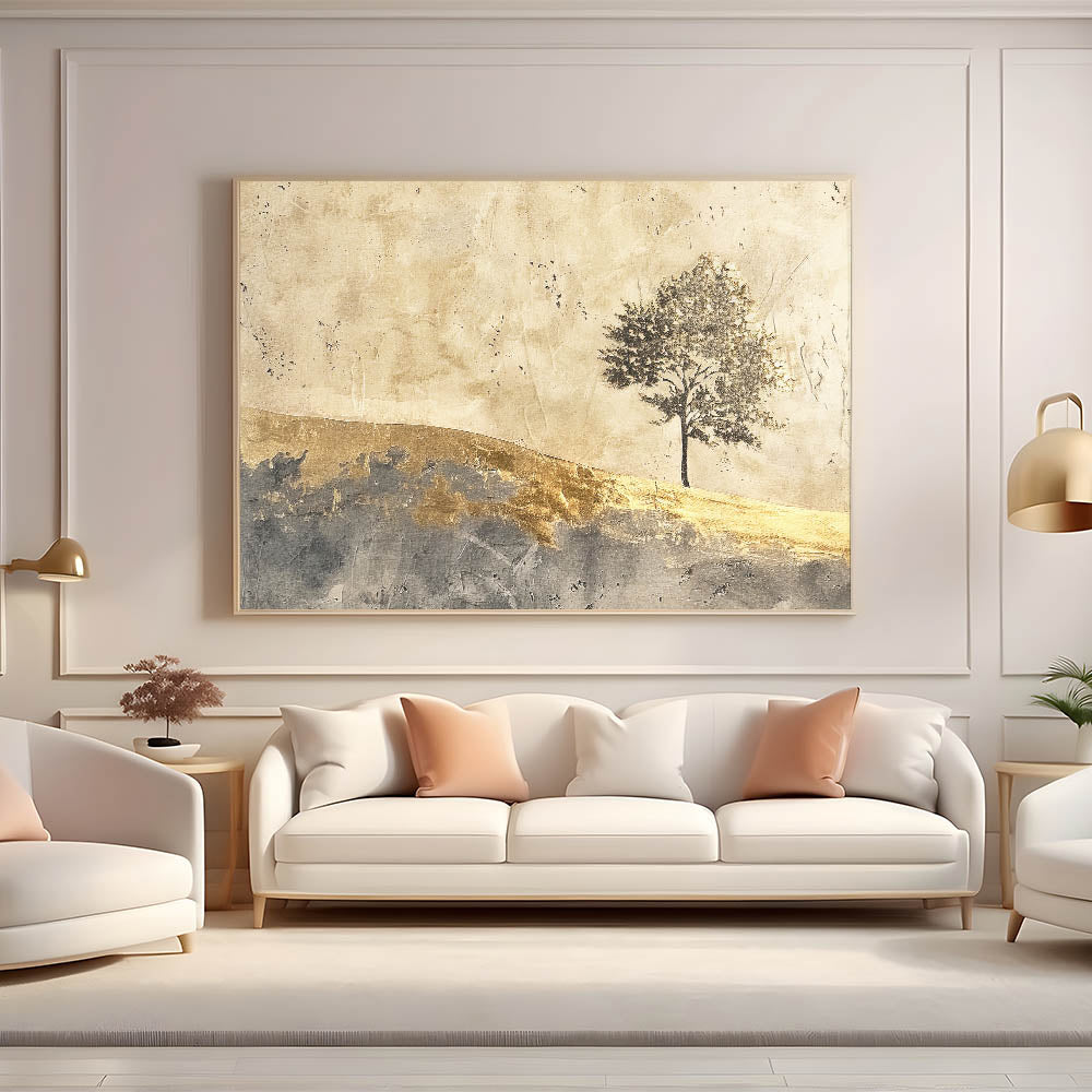 Embrace the beauty of simplicity with this abstract landscape artwork, showcasing a solitary tree against a golden horizon. The warm tones of gold, beige, and gray create a serene, minimalist scene that captures the essence of natural beauty. This piece is perfect for adding a touch of elegance and tranquility to any room, from living areas to bedrooms.