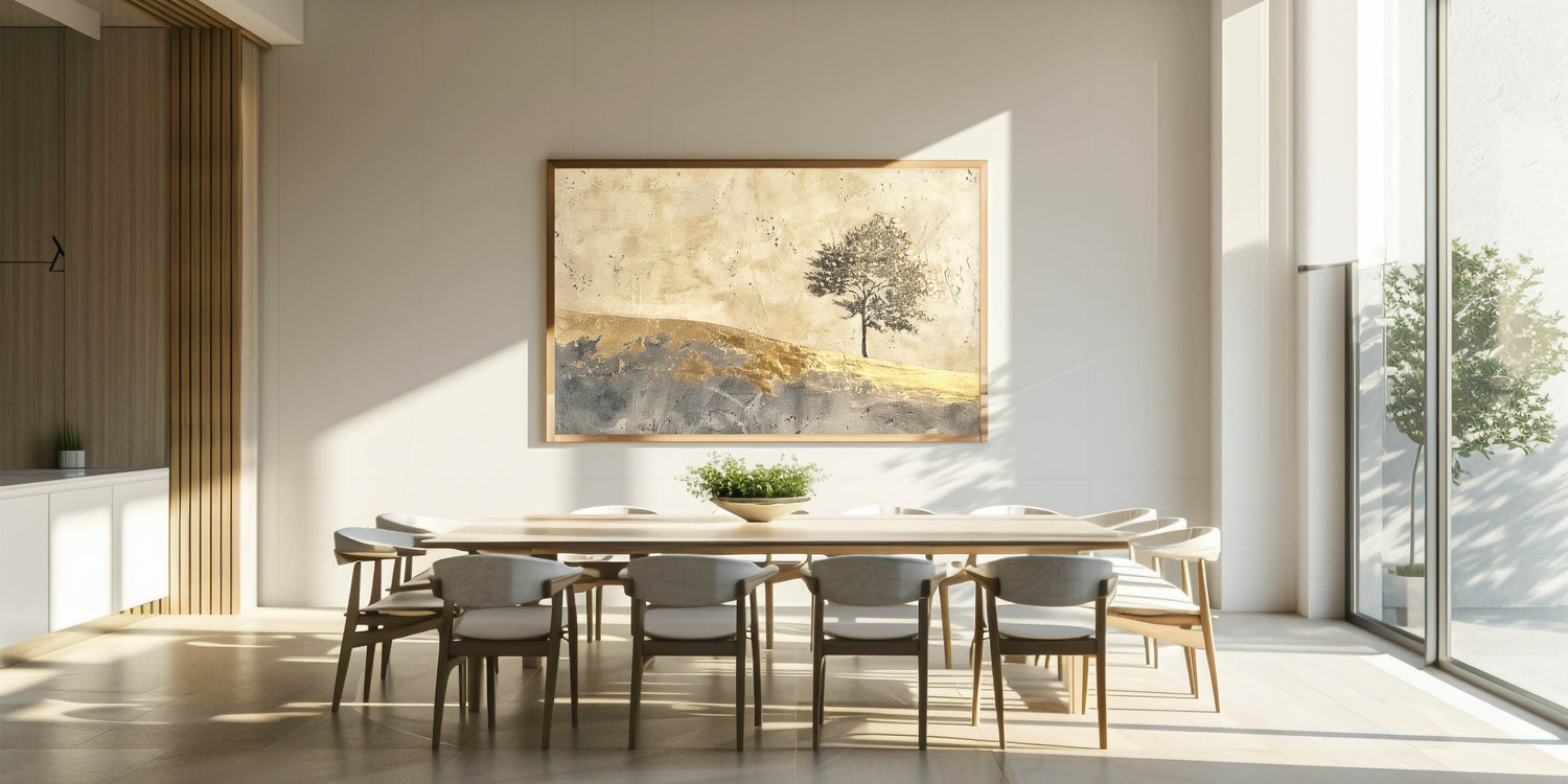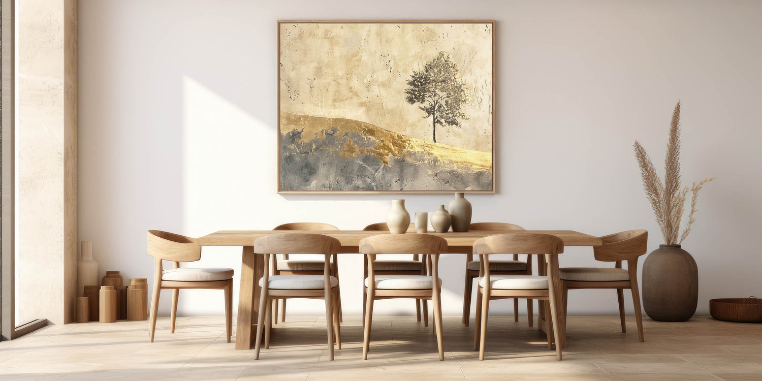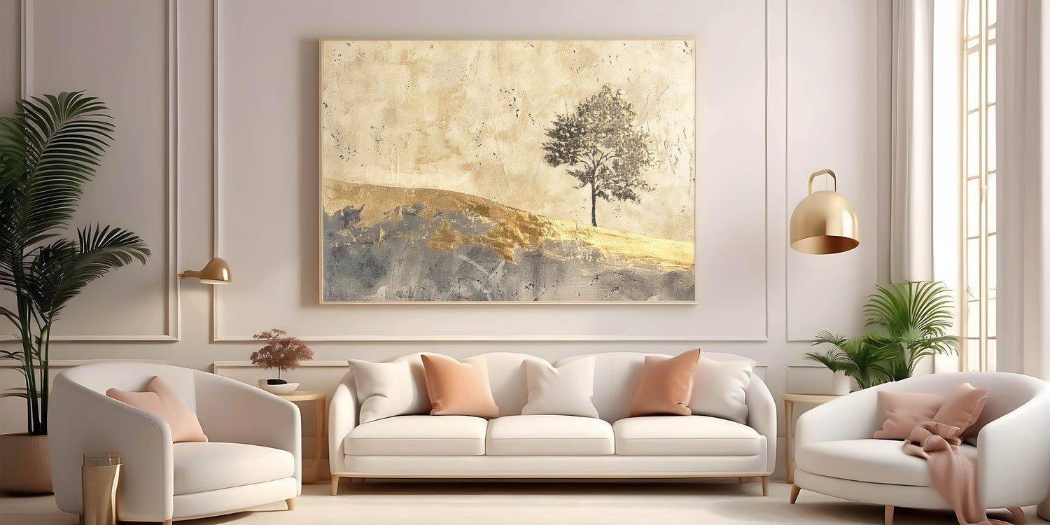 Embrace the beauty of simplicity with this abstract landscape artwork, showcasing a solitary tree against a golden horizon. The warm tones of gold, beige, and gray create a serene, minimalist scene that captures the essence of natural beauty. This piece is perfect for adding a touch of elegance and tranquility to any room, from living areas to bedrooms.